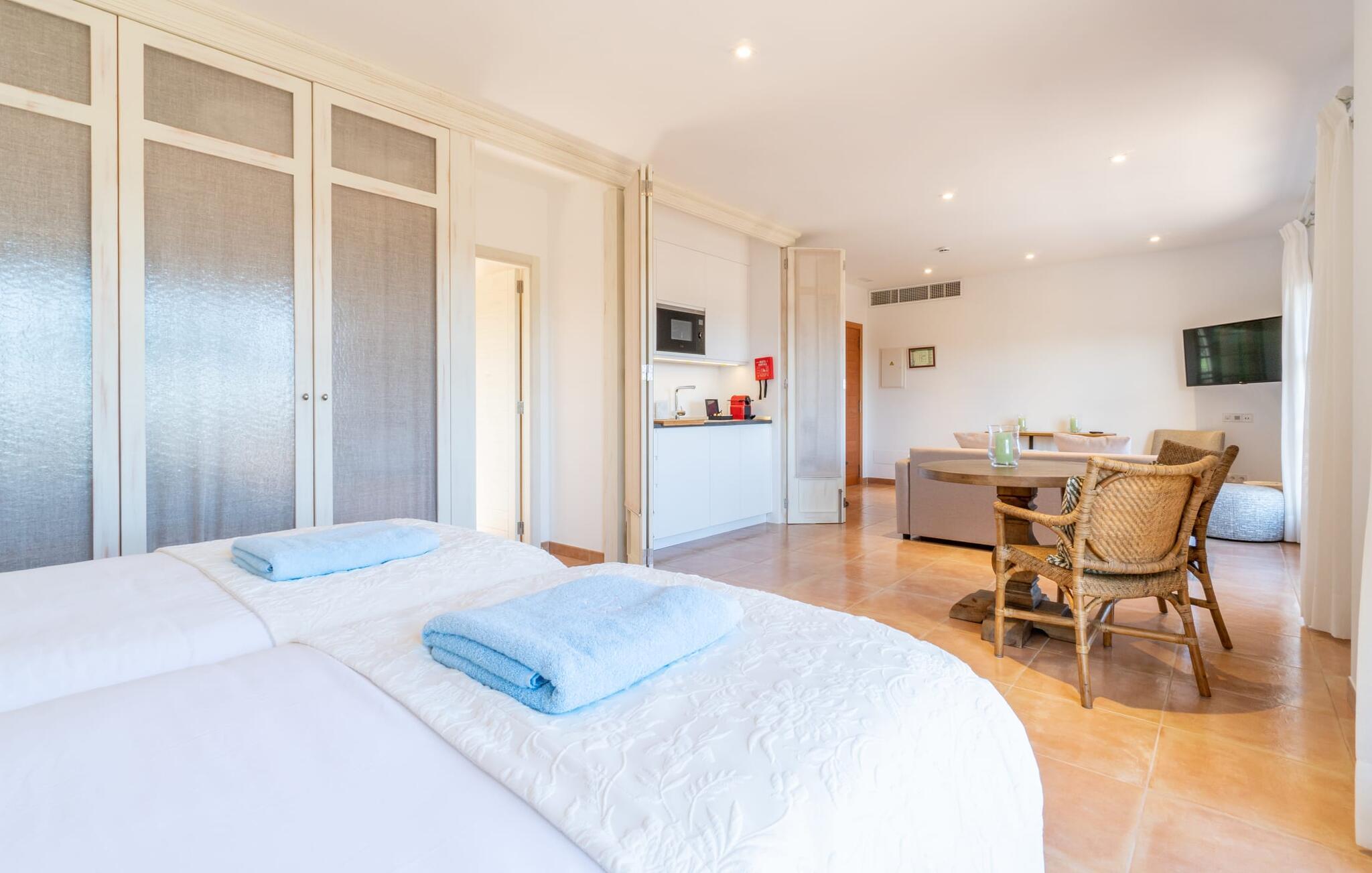 Die großzügige Wohnung mit großer Panoramaterrasse überzeugt mit klassischer Eleganz. Ein gemütlicher Wohnbereich mit bequemer Schlafcouch, TV und Esstisch sowie einer modernen Küchenzeile und mit einem großen Bett natürlich auch ein dazugehöriges Badezimmer mit Badewanne und Dusche. Diese Wohnung im Süden Mallorcas ist ideal für einen ruhigen Wellness-Aufenthalt.