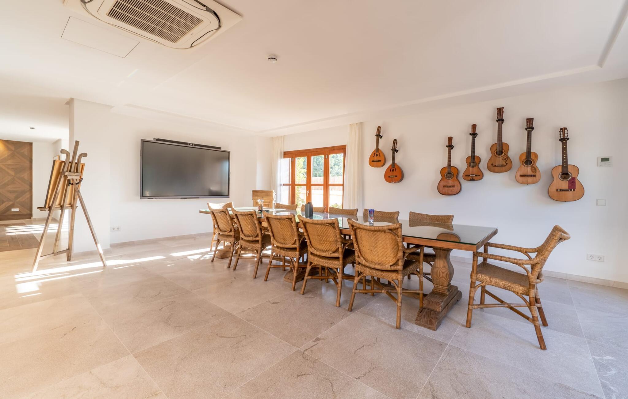 Verschiedene Bereiche laden zu entspannten Stunden im Freien ein: bequeme Sonnenliegen, Lounge, Esstisch und gemütliche Sitzecken. Von überall genießt man einen herrlichen Ausblick über die Landschaft. Angenehme Erfrischung verspricht der 18 Meter lange Pool, der von Zierpflanzen und Liegeflächen umgeben ist. Wenn Sie gerne Sport treiben, können Sie den Tennisplatz oder das Fitnessstudio nutzen. Für Wellness-Momente gibt es ein umfangreiches Spa mit Sauna und Türkischem Bad. Darüber hinaus können Sie nach Vereinbarung einen vielseitigen Tagungsraum nutzen.