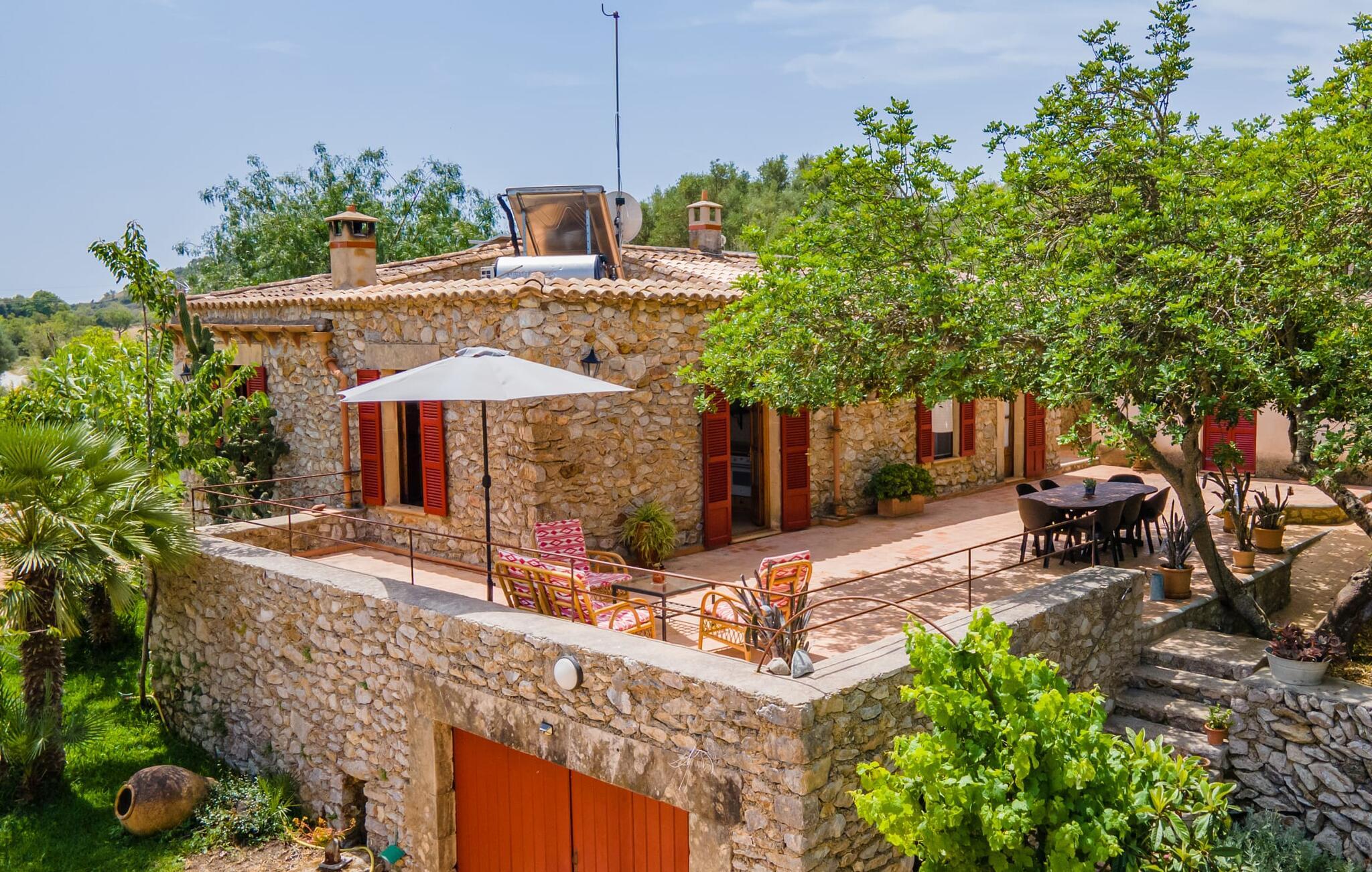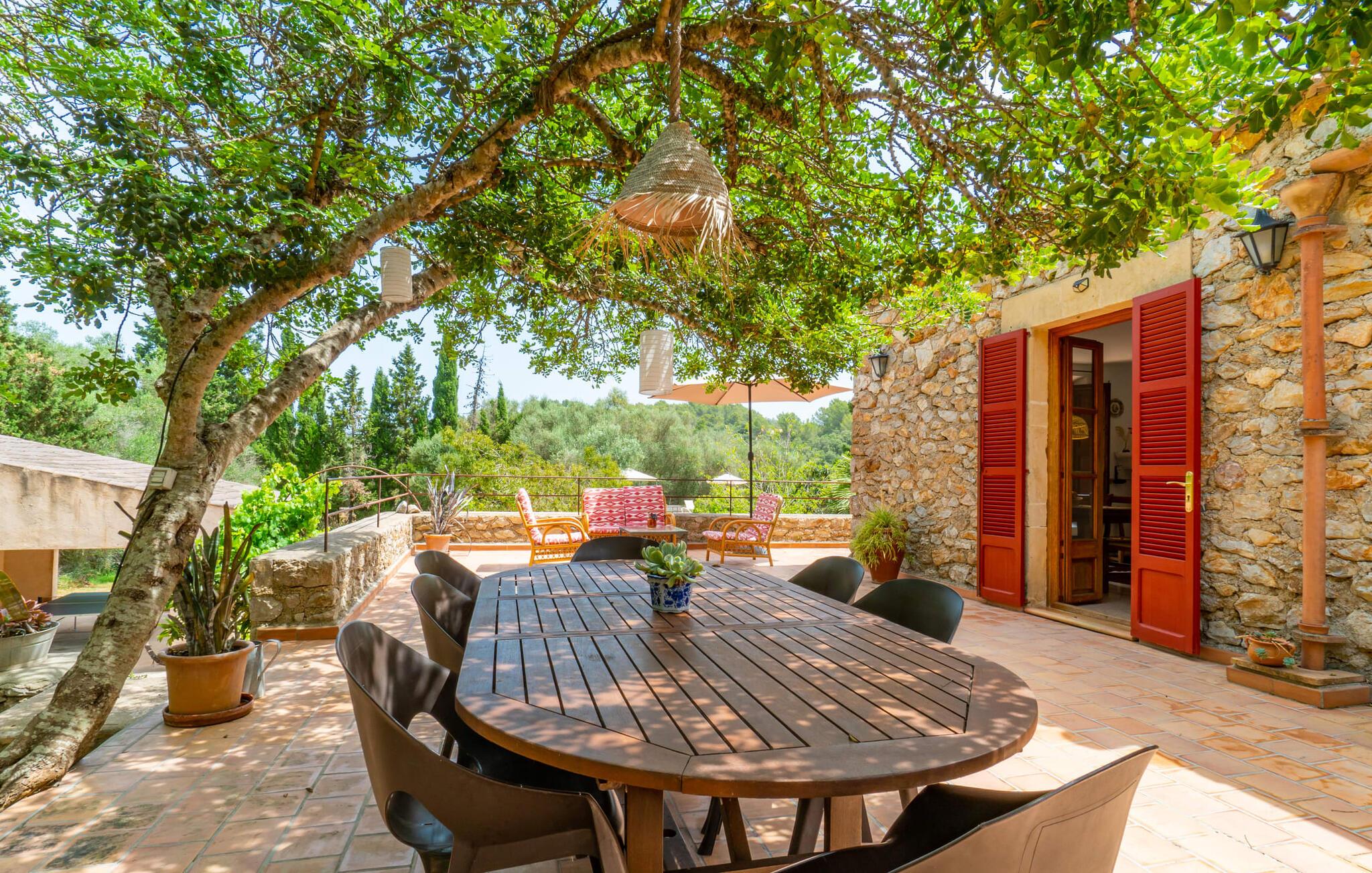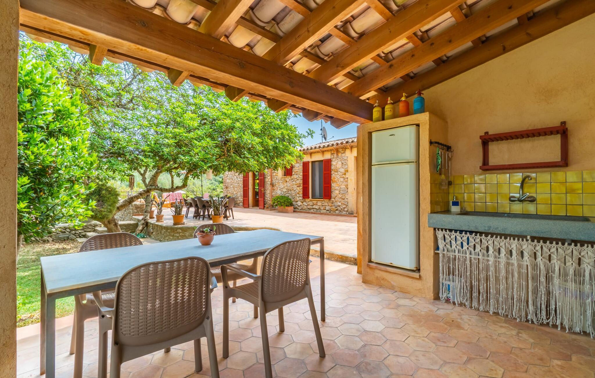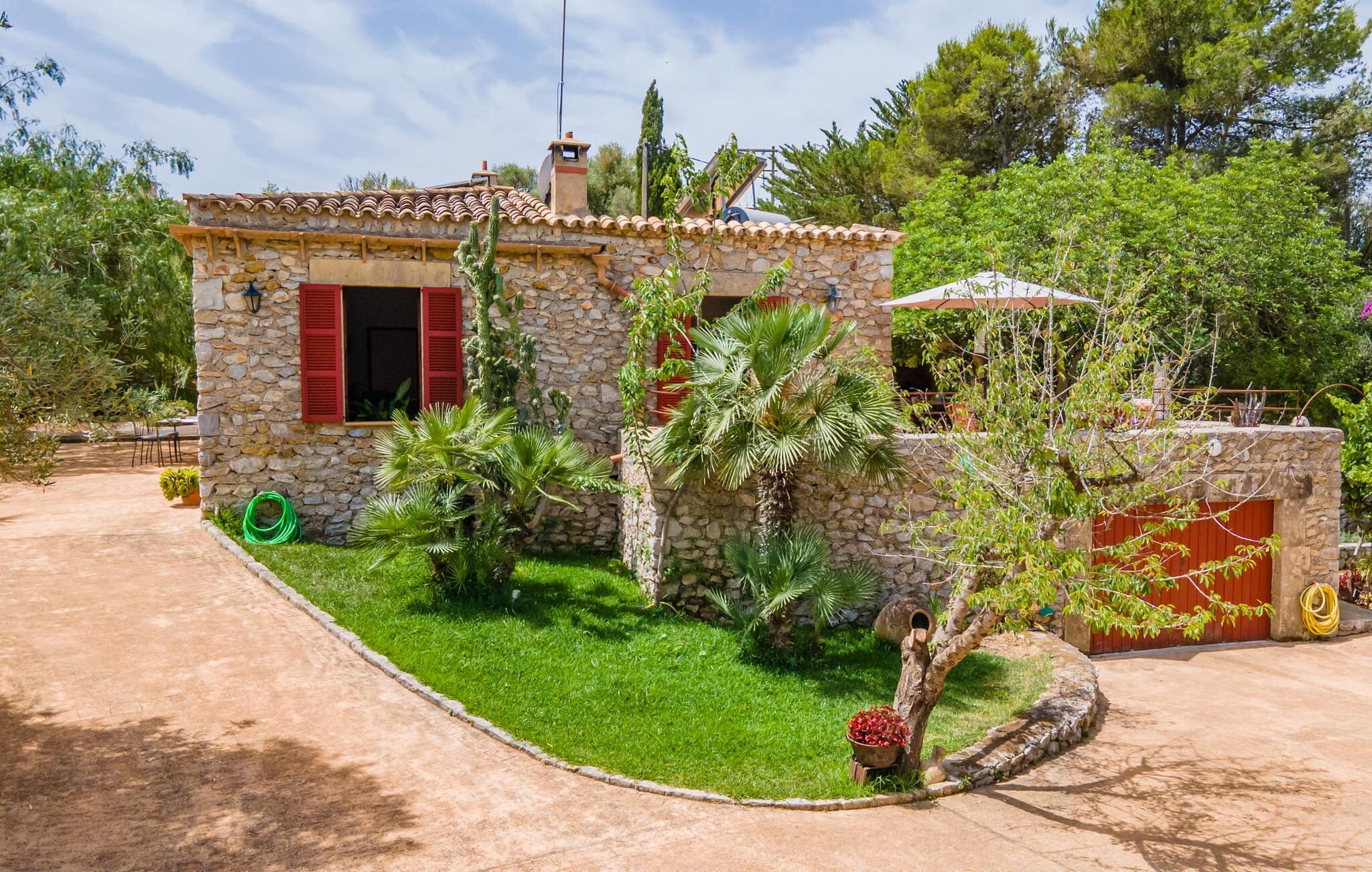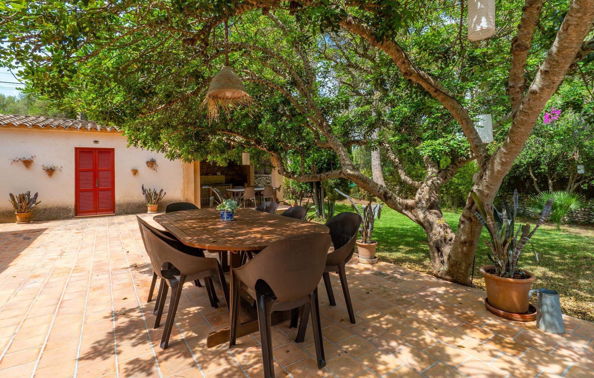 Bei einer Besichtigungstour sehen wir direkt hinter Artàs Nordausgang die absolut bezaubernde Villa „Sa Tortugueta“ im Sonnenlicht. Es wird uns in mallorquinischem Ambiente empfangen. Das Außengelände wird sofort Interesse an weiteren Erkundungen wecken. Viele verschiedene Bäume prägen den abwechslungsreichen Garten und sorgen für eine idyllische und fast gemütliche Atmosphäre. Wer lieber viel Zeit an der frischen Luft verbringt, findet bestimmt ein paar Lieblingsplätze; Ob auf der Terrasse, die mehrere Seiten des Natursteingebäudes umgibt, auf der Rasenfläche, in der Hängematte oder auf der etwas erhöhten Terrasse am Pool. Sie können die Atmosphäre unter den Olivenbäumen am Haus genießen und beispielsweise beim Frühstück einen frischen Obstsalat oder ein knuspriges Brötchen vom Bäcker genießen und dabei ins Grüne blicken. Neben den sicherlich lohnenswerten Ausflügen in die nähere und weitere Umgebung lockt auch ein entspannter Tag am Pool. Genießen Sie ausgiebige Entspannung unter freiem Himmel. Die Liegestühle und Sonnenschirme warten bereits auf Sie! Nehmen Sie ab und zu einen Sprung ins kühle Nass des 8 m langen Pools, den Sie bequem über die Ecktreppe betreten. Das Außenbad ist super praktisch. Neben dem Haus befindet sich eine Außenküche mit einem BBQ-Grill, einem kleinen Gasherd, einer Spüle, einem großen Kühlschrank und Stühlen. Dies ist der Ort, an dem Sie den Tag mit einer großzügigen Portion leckerer Leckereien ausklingen lassen können!