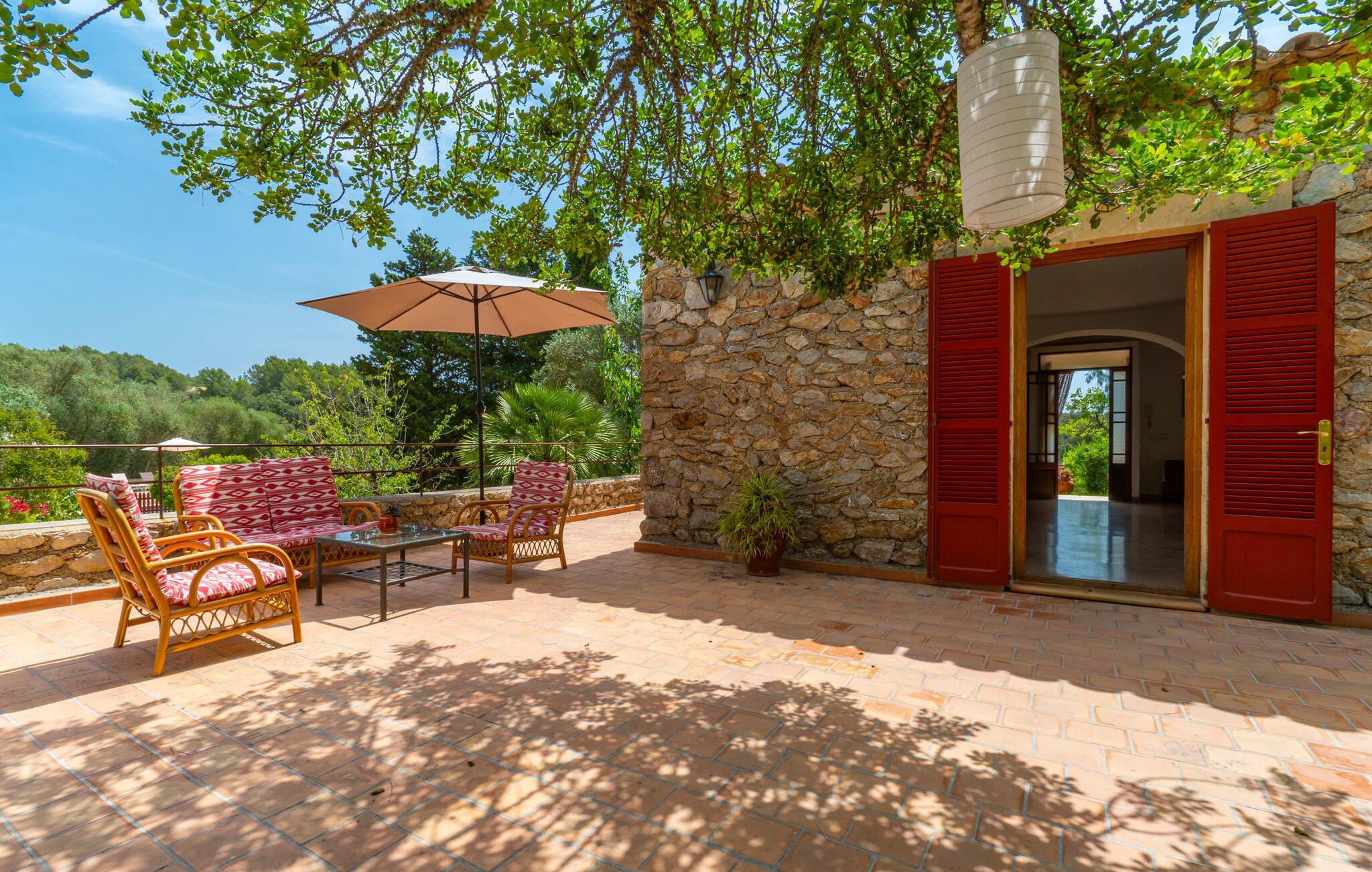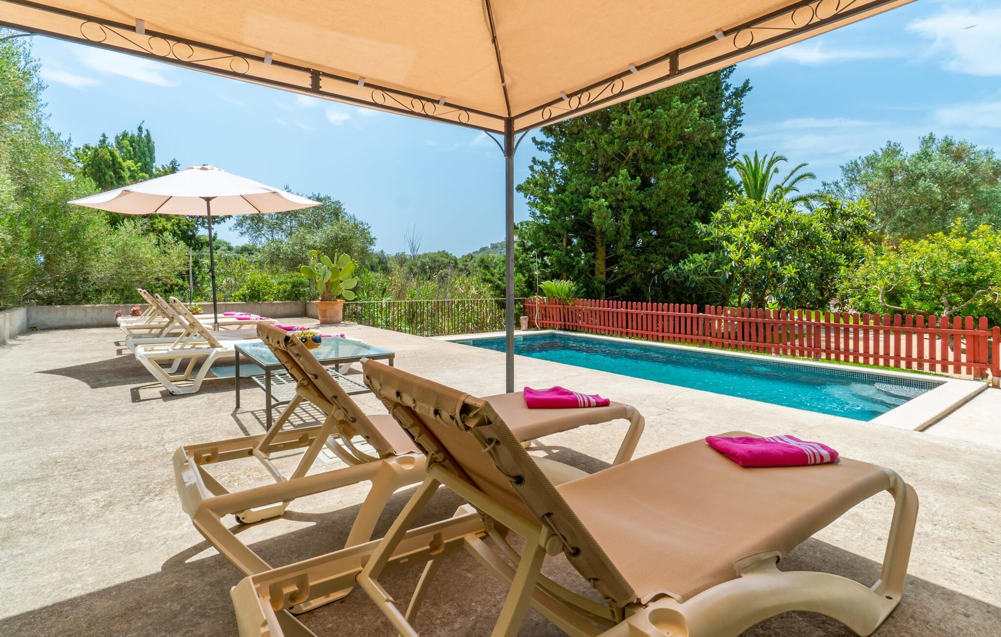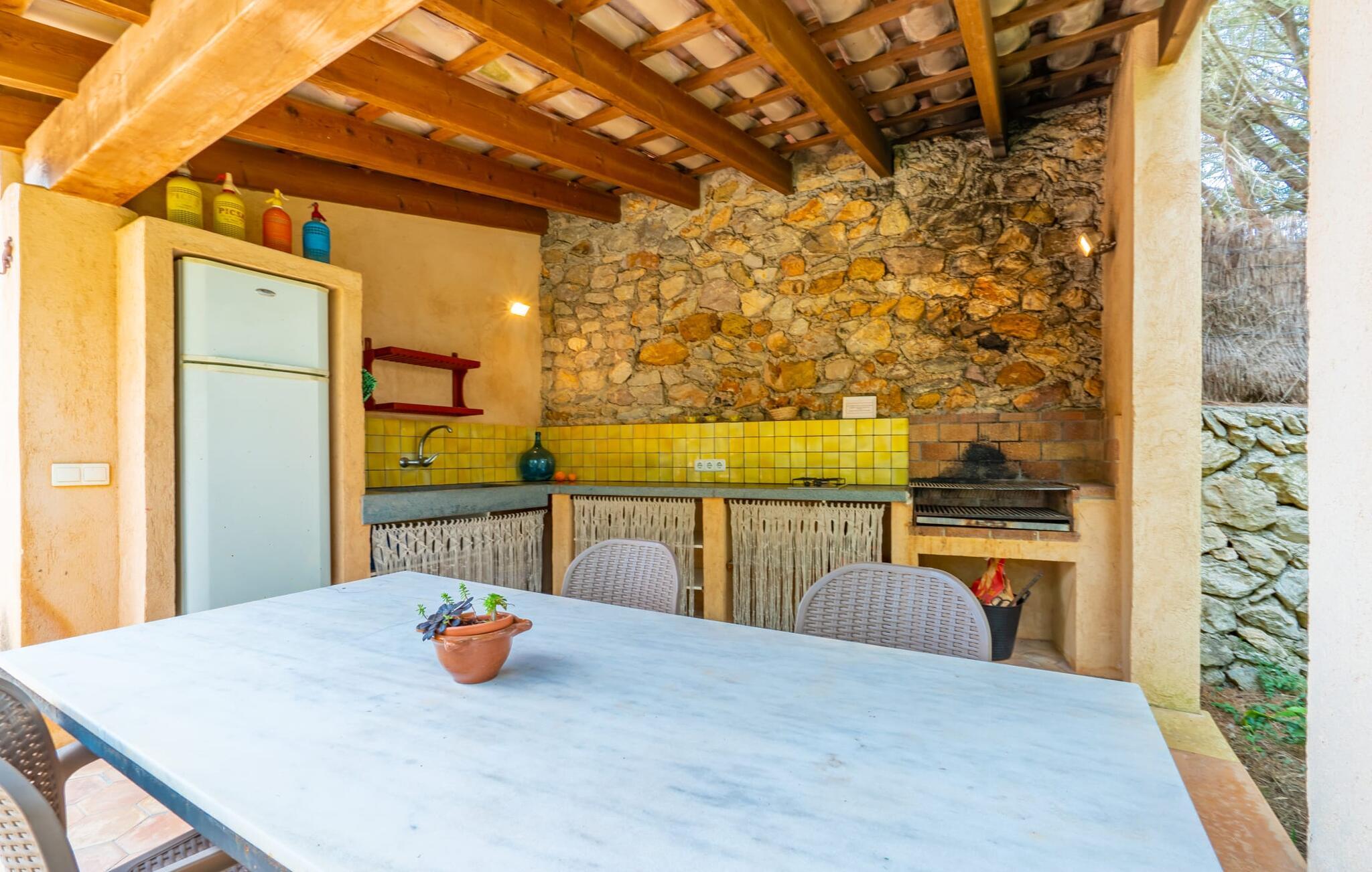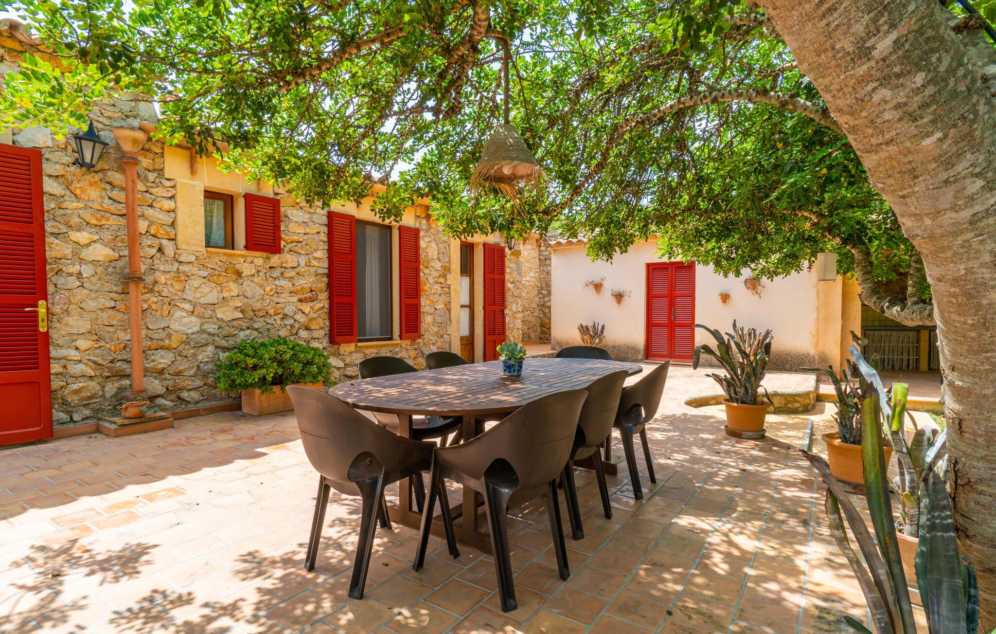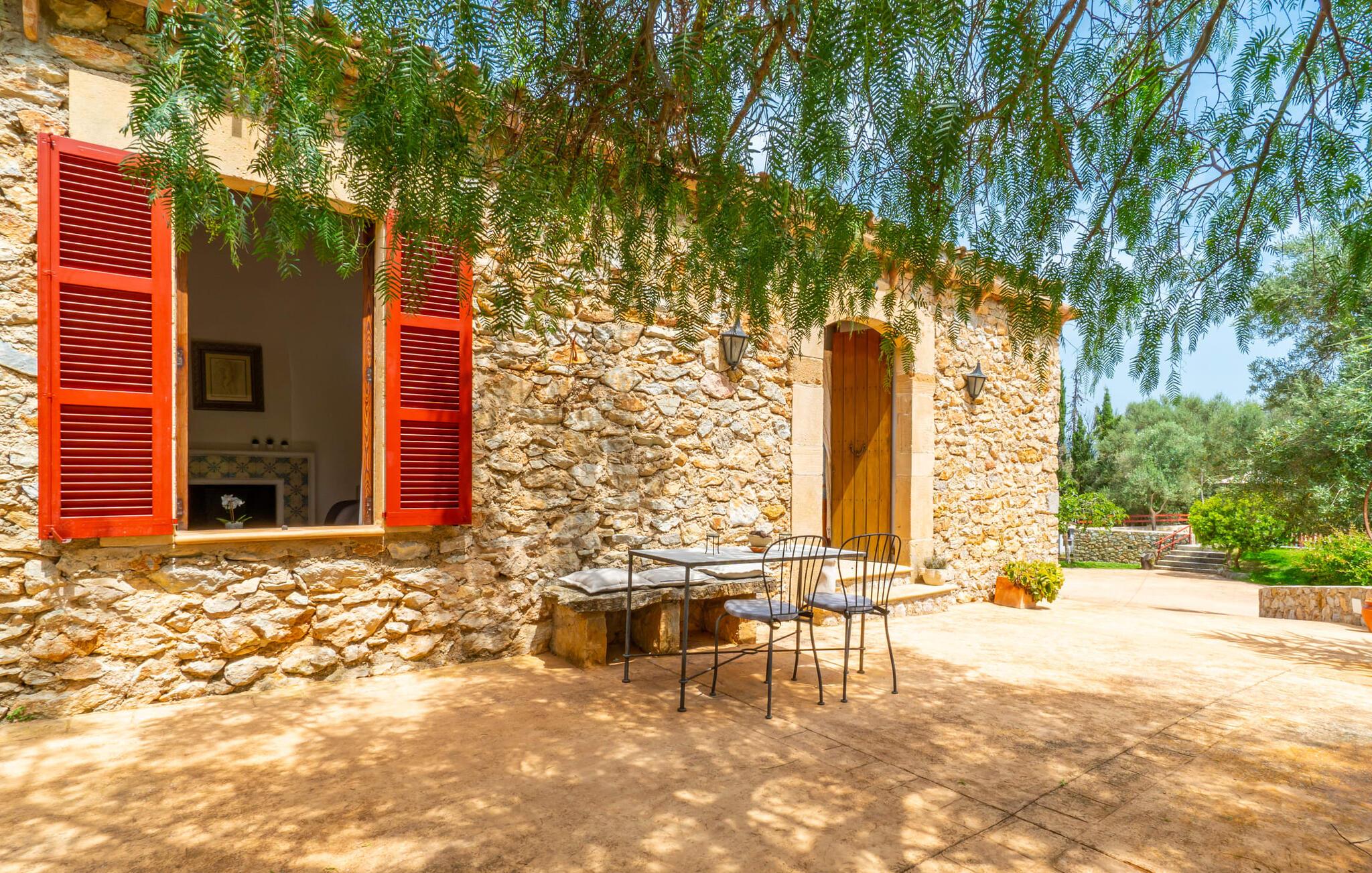 Bei einer Besichtigungstour sehen wir direkt hinter Artàs Nordausgang die absolut bezaubernde Villa „Sa Tortugueta“ im Sonnenlicht. Es wird uns in mallorquinischem Ambiente empfangen. Das Außengelände wird sofort Interesse an weiteren Erkundungen wecken. Viele verschiedene Bäume prägen den abwechslungsreichen Garten und sorgen für eine idyllische und fast gemütliche Atmosphäre. Wer lieber viel Zeit an der frischen Luft verbringt, findet bestimmt ein paar Lieblingsplätze; Ob auf der Terrasse, die mehrere Seiten des Natursteingebäudes umgibt, auf der Rasenfläche, in der Hängematte oder auf der etwas erhöhten Terrasse am Pool. Sie können die Atmosphäre unter den Olivenbäumen am Haus genießen und beispielsweise beim Frühstück einen frischen Obstsalat oder ein knuspriges Brötchen vom Bäcker genießen und dabei ins Grüne blicken. Neben den sicherlich lohnenswerten Ausflügen in die nähere und weitere Umgebung lockt auch ein entspannter Tag am Pool. Genießen Sie ausgiebige Entspannung unter freiem Himmel. Die Liegestühle und Sonnenschirme warten bereits auf Sie! Nehmen Sie ab und zu einen Sprung ins kühle Nass des 8 m langen Pools, den Sie bequem über die Ecktreppe betreten. Das Außenbad ist super praktisch. Neben dem Haus befindet sich eine Außenküche mit einem BBQ-Grill, einem kleinen Gasherd, einer Spüle, einem großen Kühlschrank und Stühlen. Dies ist der Ort, an dem Sie den Tag mit einer großzügigen Portion leckerer Leckereien ausklingen lassen können!