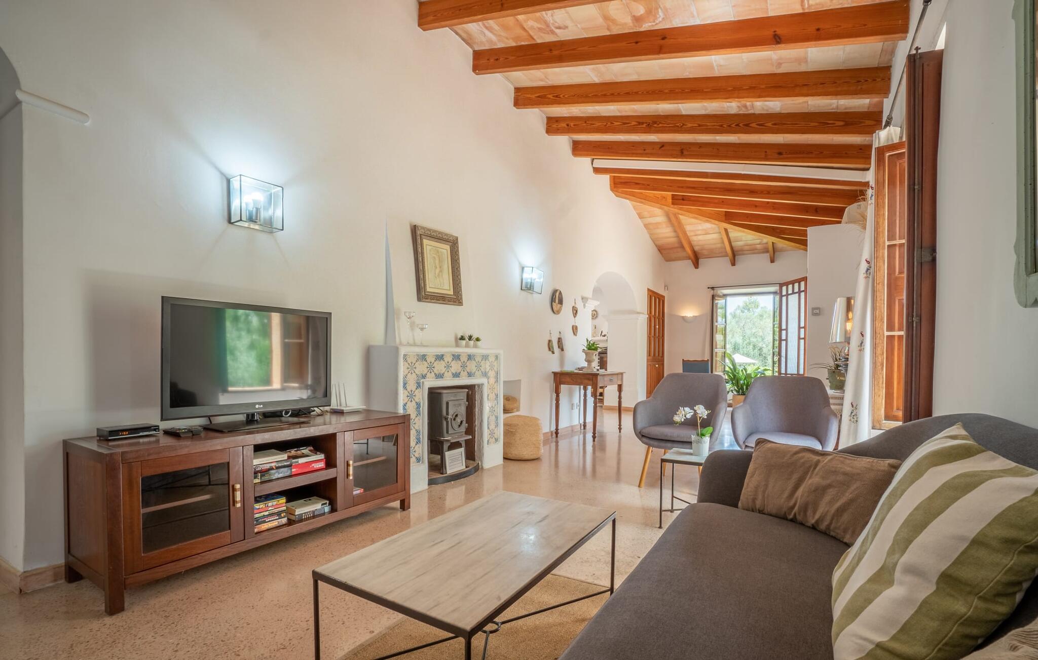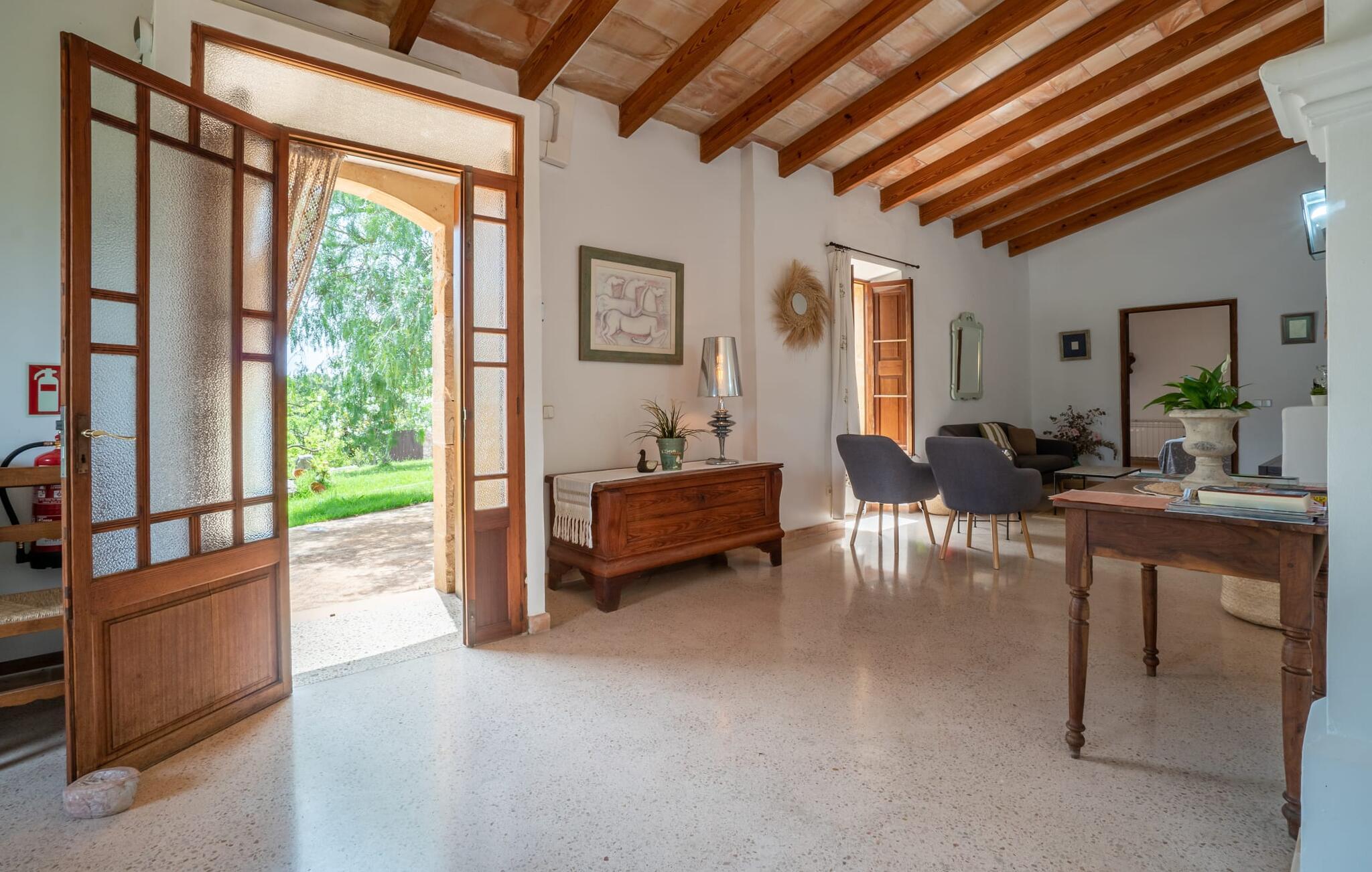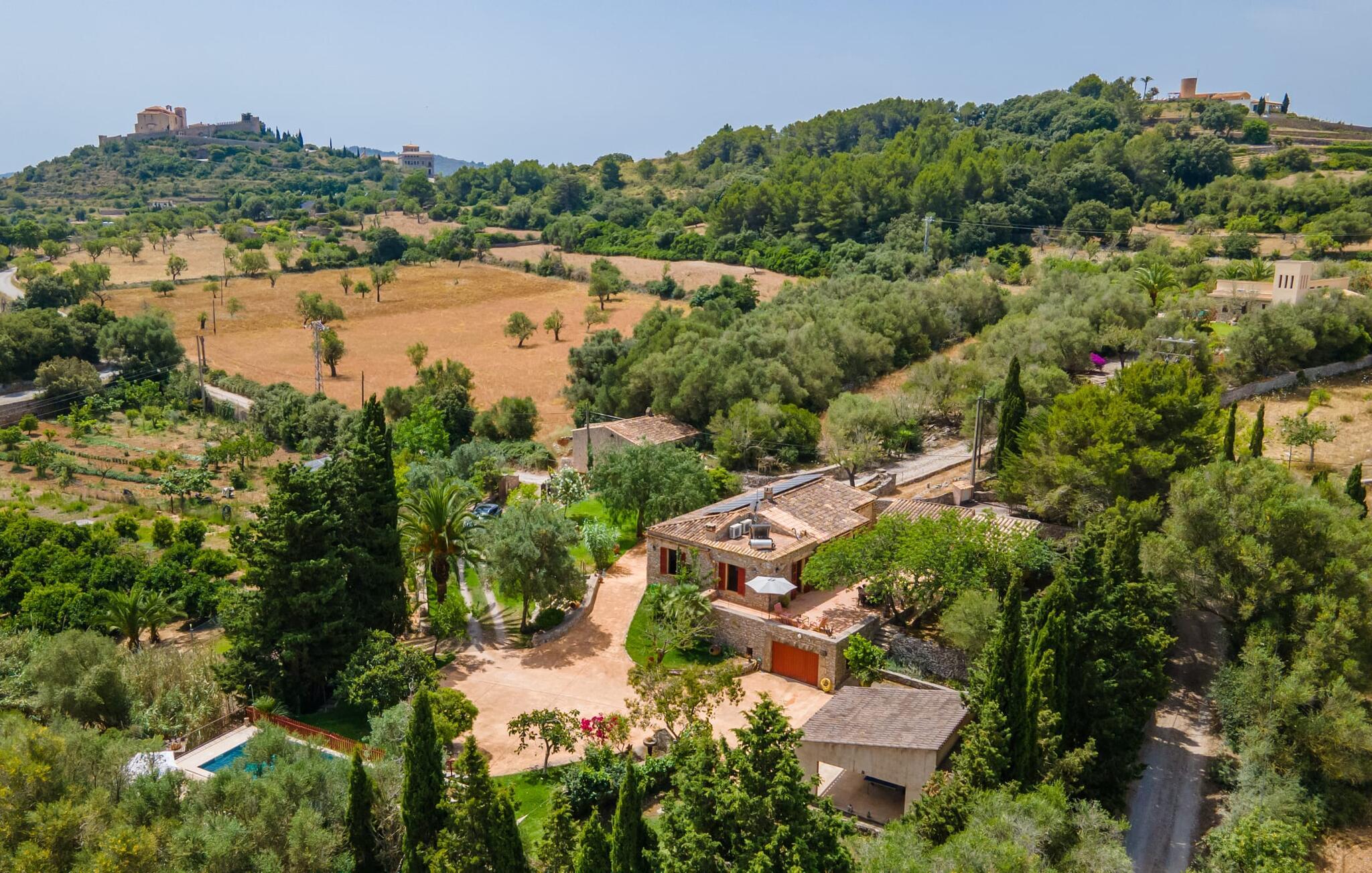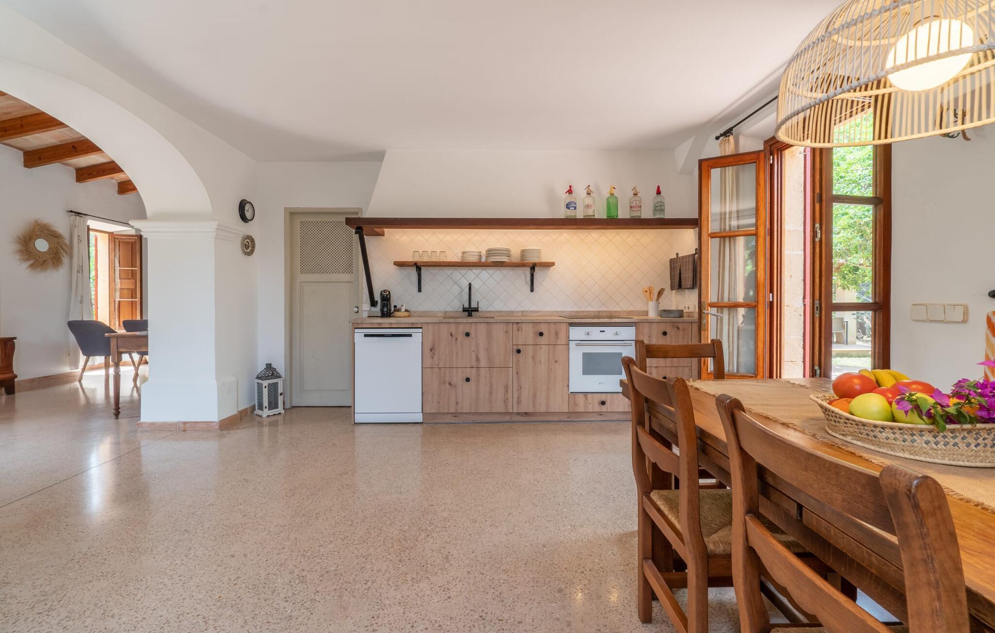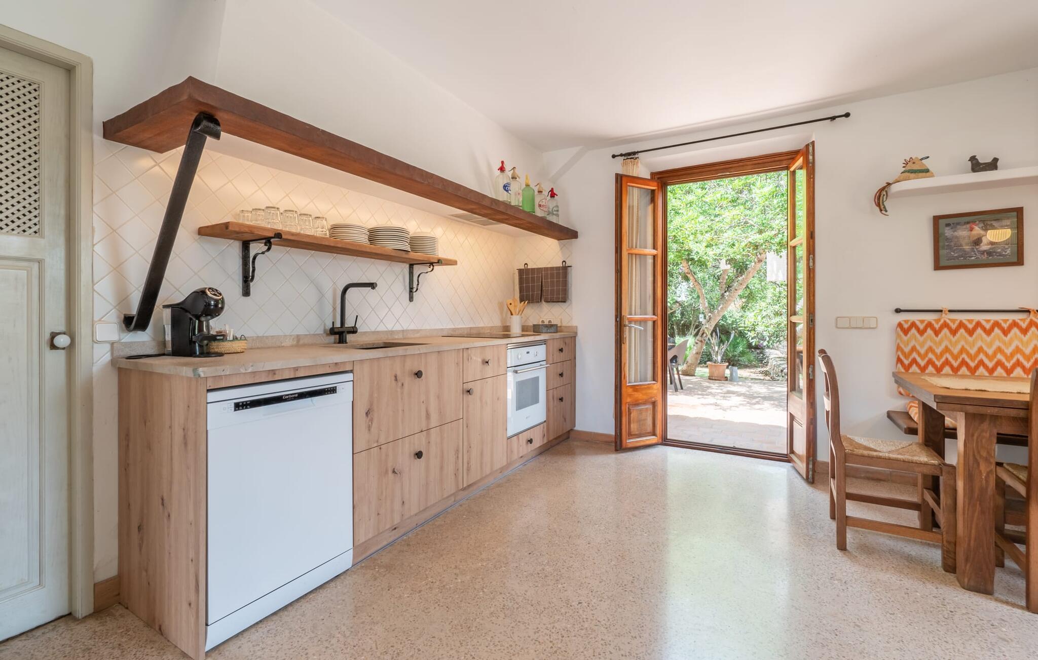 Bei einer Besichtigungstour sehen wir direkt hinter Artàs Nordausgang die absolut bezaubernde Villa „Sa Tortugueta“ im Sonnenlicht. Es wird uns in mallorquinischem Ambiente empfangen. Das Außengelände wird sofort Interesse an weiteren Erkundungen wecken. Viele verschiedene Bäume prägen den abwechslungsreichen Garten und sorgen für eine idyllische und fast gemütliche Atmosphäre. Wer lieber viel Zeit an der frischen Luft verbringt, findet bestimmt ein paar Lieblingsplätze; Ob auf der Terrasse, die mehrere Seiten des Natursteingebäudes umgibt, auf der Rasenfläche, in der Hängematte oder auf der etwas erhöhten Terrasse am Pool. Sie können die Atmosphäre unter den Olivenbäumen am Haus genießen und beispielsweise beim Frühstück einen frischen Obstsalat oder ein knuspriges Brötchen vom Bäcker genießen und dabei ins Grüne blicken. Neben den sicherlich lohnenswerten Ausflügen in die nähere und weitere Umgebung lockt auch ein entspannter Tag am Pool. Genießen Sie ausgiebige Entspannung unter freiem Himmel. Die Liegestühle und Sonnenschirme warten bereits auf Sie! Nehmen Sie ab und zu einen Sprung ins kühle Nass des 8 m langen Pools, den Sie bequem über die Ecktreppe betreten. Das Außenbad ist super praktisch. Neben dem Haus befindet sich eine Außenküche mit einem BBQ-Grill, einem kleinen Gasherd, einer Spüle, einem großen Kühlschrank und Stühlen. Dies ist der Ort, an dem Sie den Tag mit einer großzügigen Portion leckerer Leckereien ausklingen lassen können!