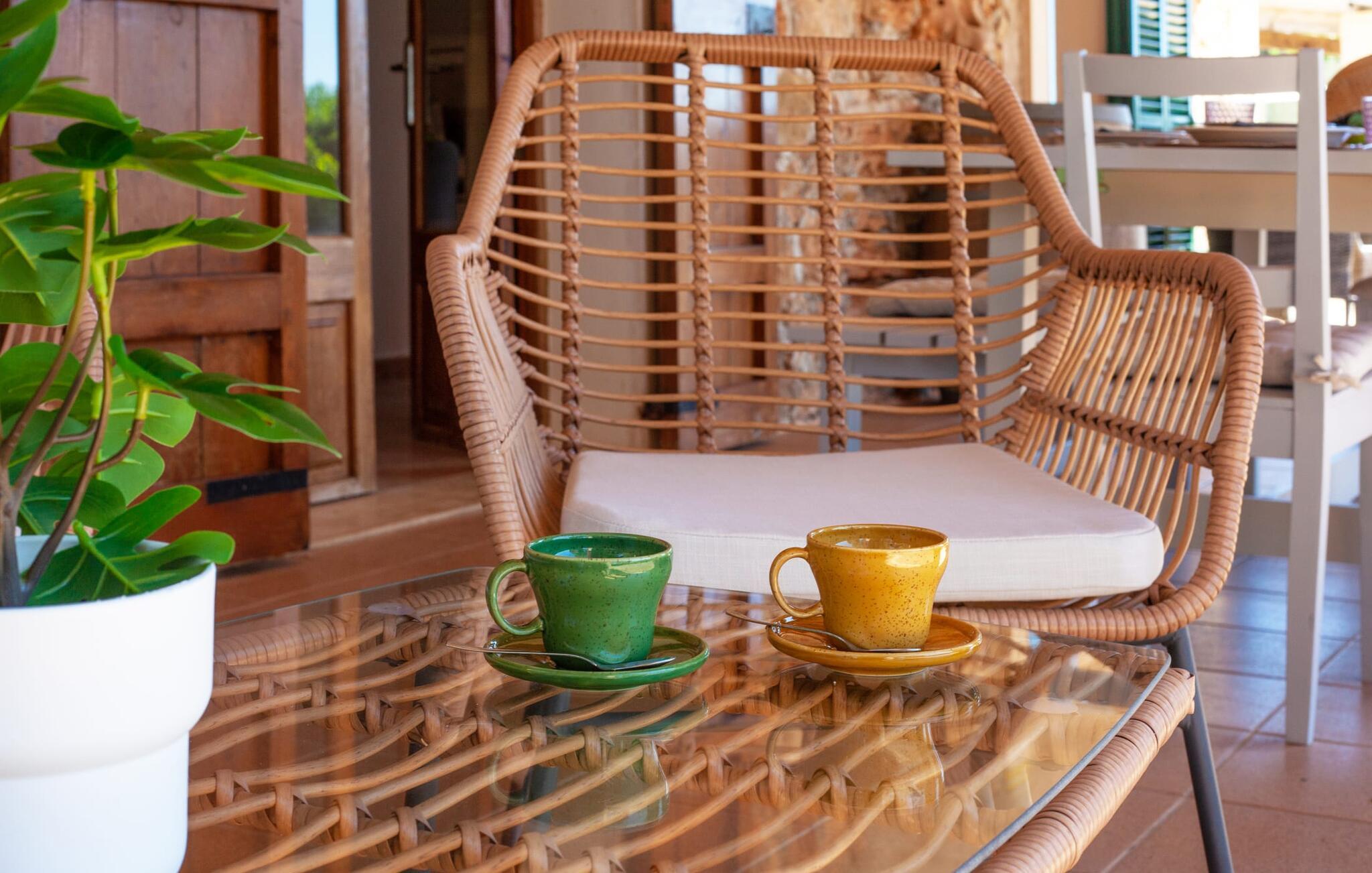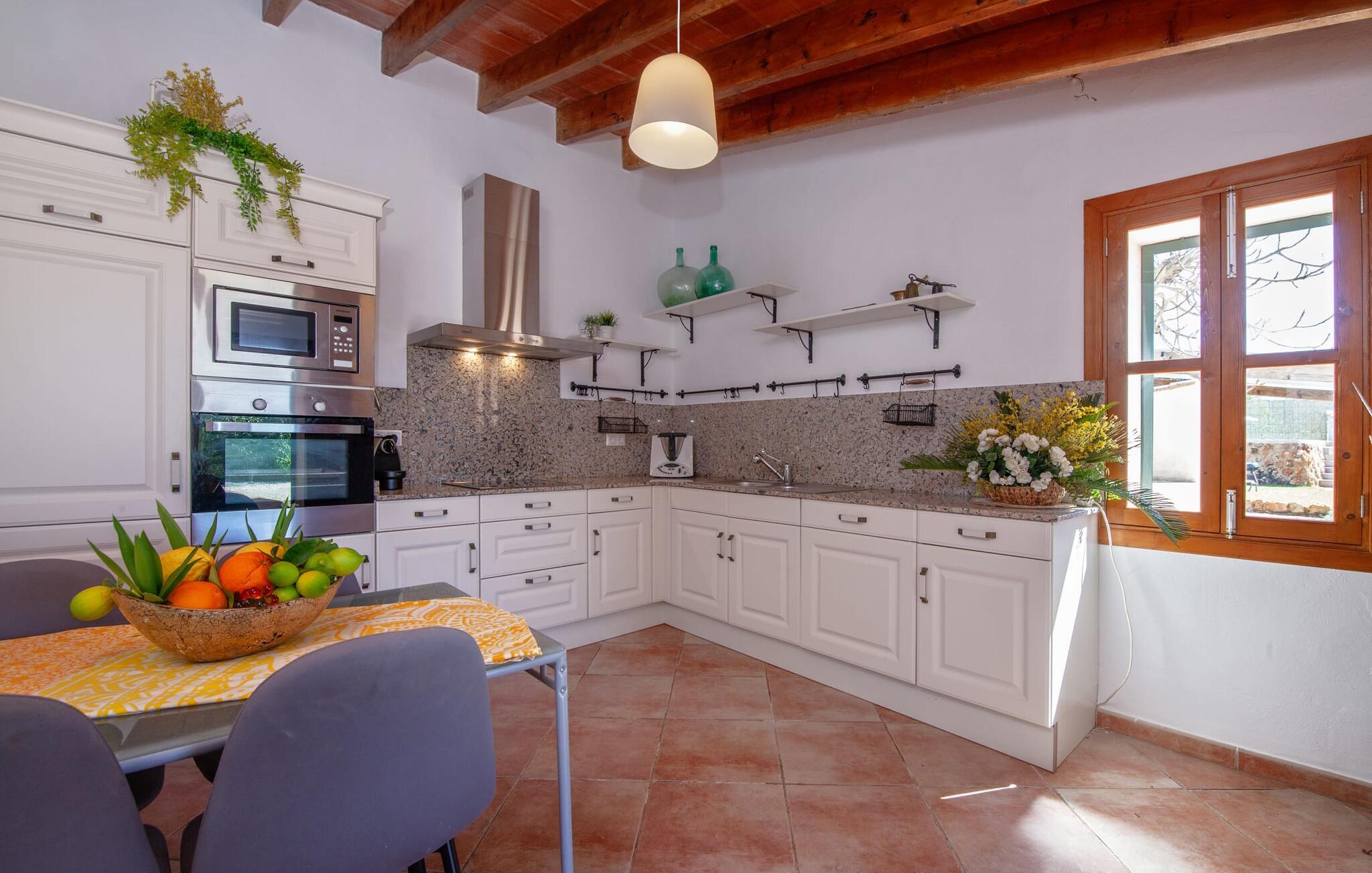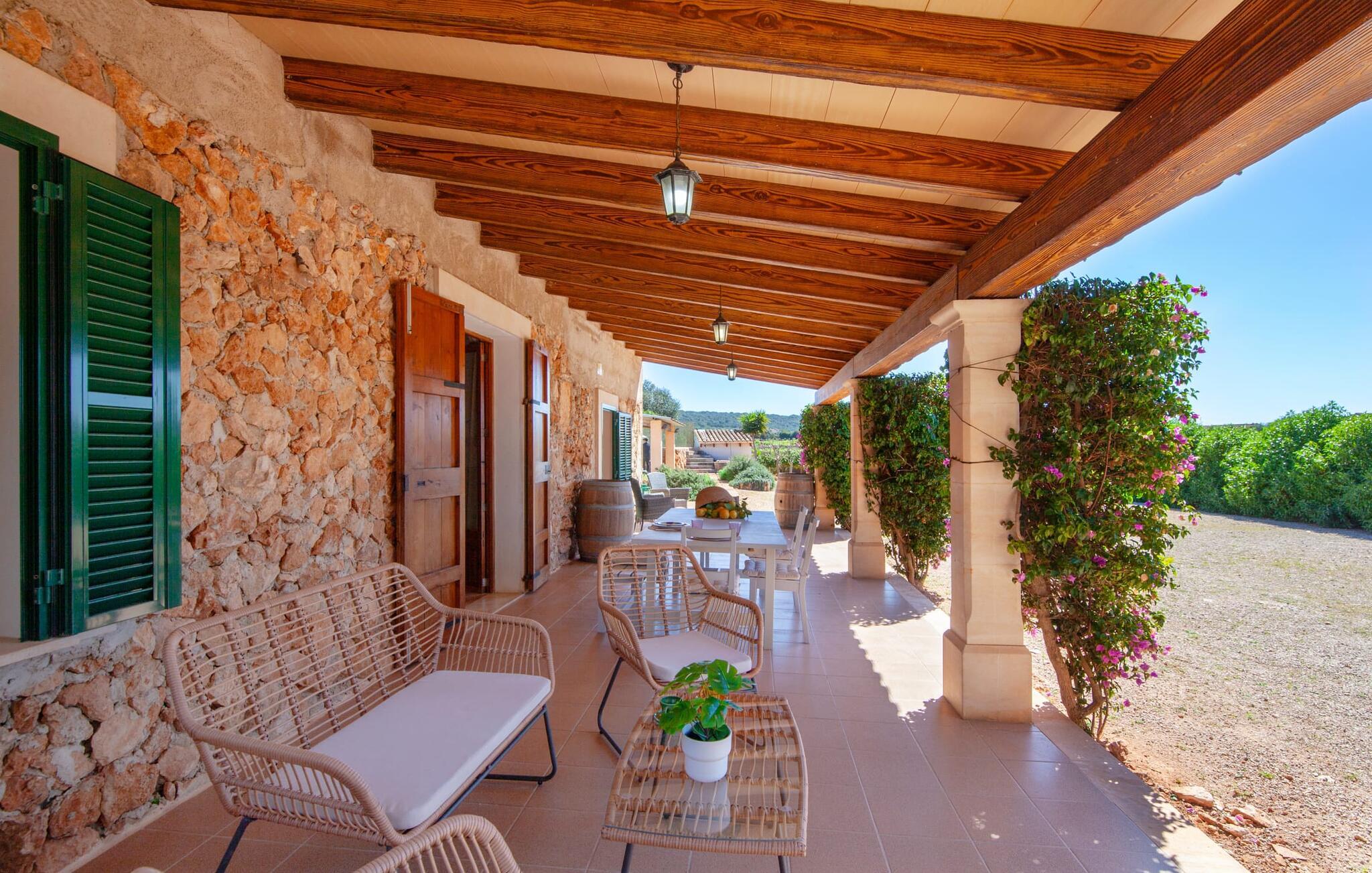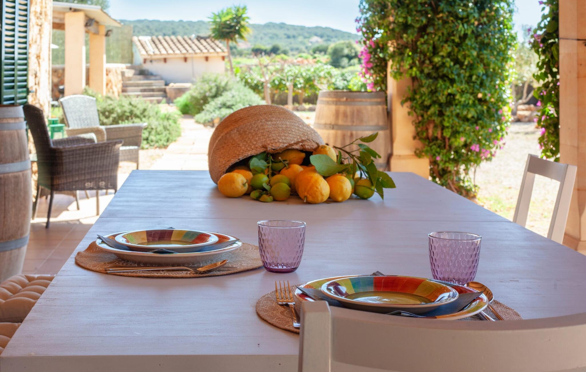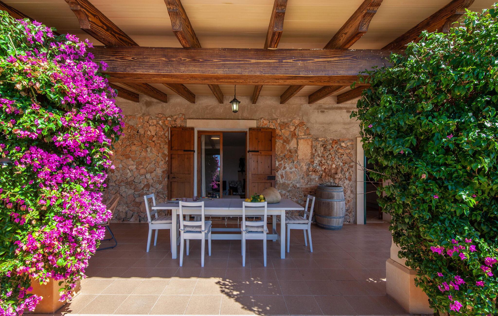 Ursprünglichkeit, Privatsphäre und Weite – wenn Ihnen das gefällt und Sie auf der Suche nach einem charmanten Zuhause für ein Paar sind, sollten Sie dieses Objekt fest im Auge behalten. Denn die Villa „Sa Vela“ vereint diese Elemente auf eine wirklich einladende Weise Weg und stellt einen Zufluchtsort der besonderen Art dar. Zu beachten ist, dass Villen für zwei Personen auf Mallorca kaum zu finden sind, da Ferienhäuser in der Regel deutlich größer gebaut werden. Das 6.000 m² große Anwesen bietet vielfältige Outdoor-Möglichkeiten für einen angenehmen Urlaubsaufenthalt. Das teilweise umzäunte Grundstück ist in Naturbereiche, einen hübschen Kiesbereich am Pool und den gefliesten Terrassenbereich direkt am Haus unterteilt. Der 4 x 3 m große Pool liegt umgeben von einer Natursteinmauer und ist über wenige Stufen bequem zu erreichen. Zum ausgiebigen Entspannen unter dem mediterranen Himmel stehen zwei bequeme Liegen zur Verfügung, ebenso ein Sonnenschirm, wenn die Sonnenstrahlen zu stark werden. Idealerweise gibt es in diesem Raum auch einen überdachten Bereich, in dem Sie etwas luftigen Schatten finden können. Auf dem hier platzierten Tisch haben Sie außerdem die Möglichkeit, eine Ihrer Mahlzeiten oder auch nur ein kühles Getränk zu genießen und dabei den schönen Blick in die Ferne zu genießen. Noch mehr Platz und Atmosphäre finden Sie auf der überdachten Terrasse direkt am Gebäude. Hier stehen zwei weitere Tische bereit, so dass ankommende Gäste trotz der Schlichtheit dieses kleinen Lokals den Luxus vollkommener Geräumigkeit genießen können. Wer möchte, kann sich hier nach Lust und Laune ausbreiten und sich jeden Tag einen neuen Lieblingsplatz suchen. Die freiliegenden Balken, Säulen, Fliesen und Natursteinwände zaubern ein rustikales Ambiente, das durch die hübschen Kletterblumen dekorativ aufgewertet wird. Der Großteil des verhältnismäßig großen Anwesens erstreckt sich vor Ihnen und ermöglicht Ihnen, Freiheit und Weite nach Herzenslust zu erleben, angefangen bei einem erfrischenden Frühstück am Morgen bis hin zu einem herzhaften Barbecue am Abend. bei dem Sie köstliche, frische Zutaten aus der Region genießen können.