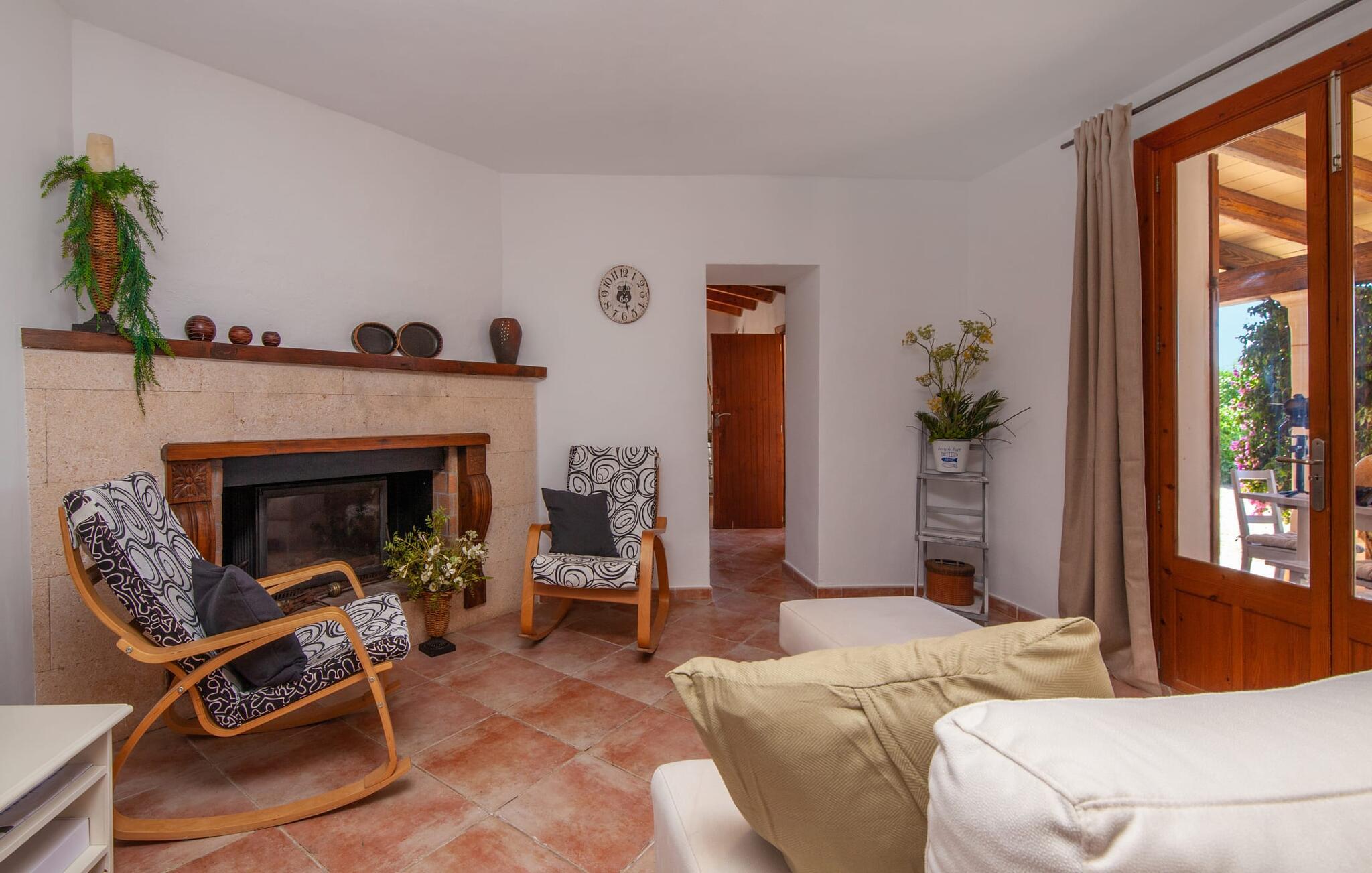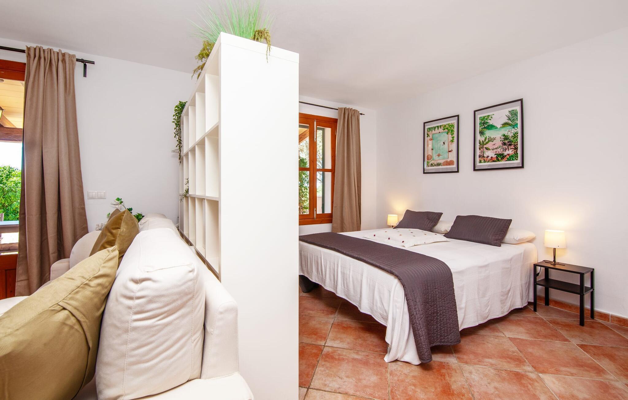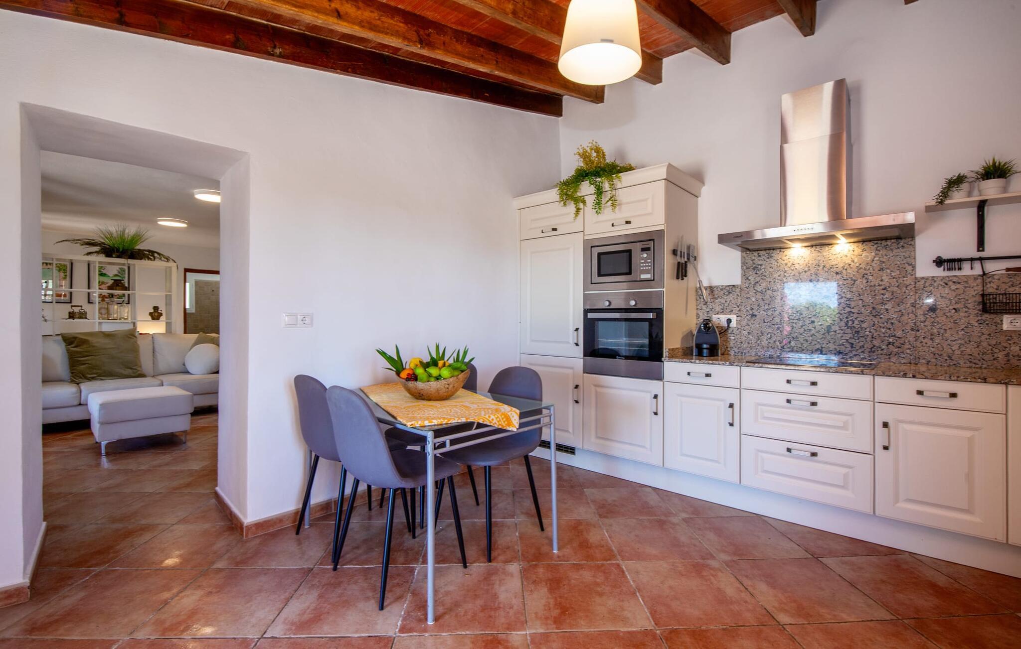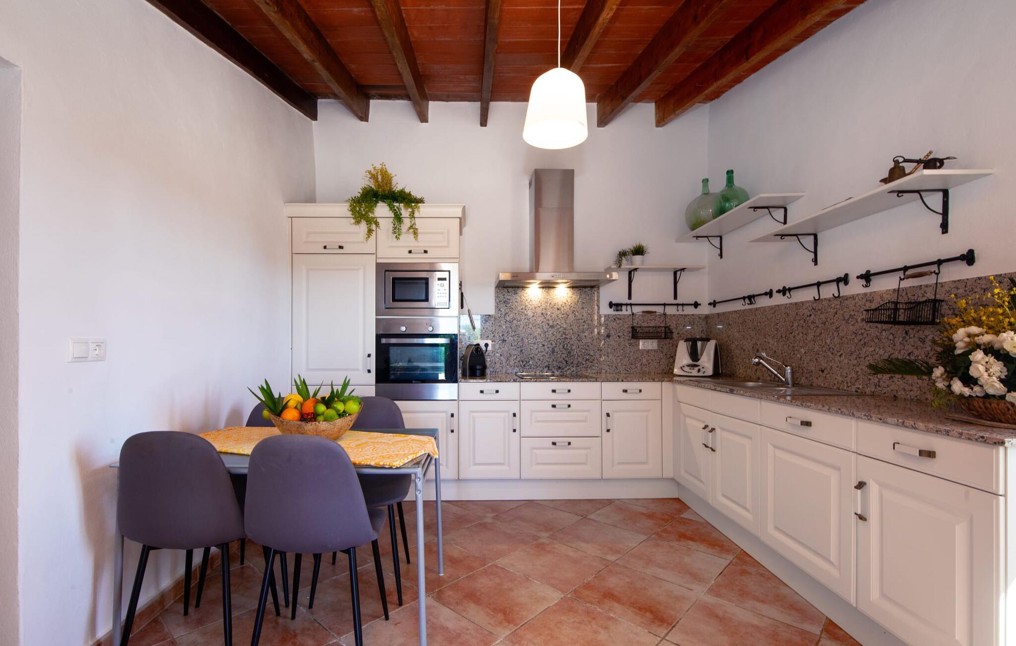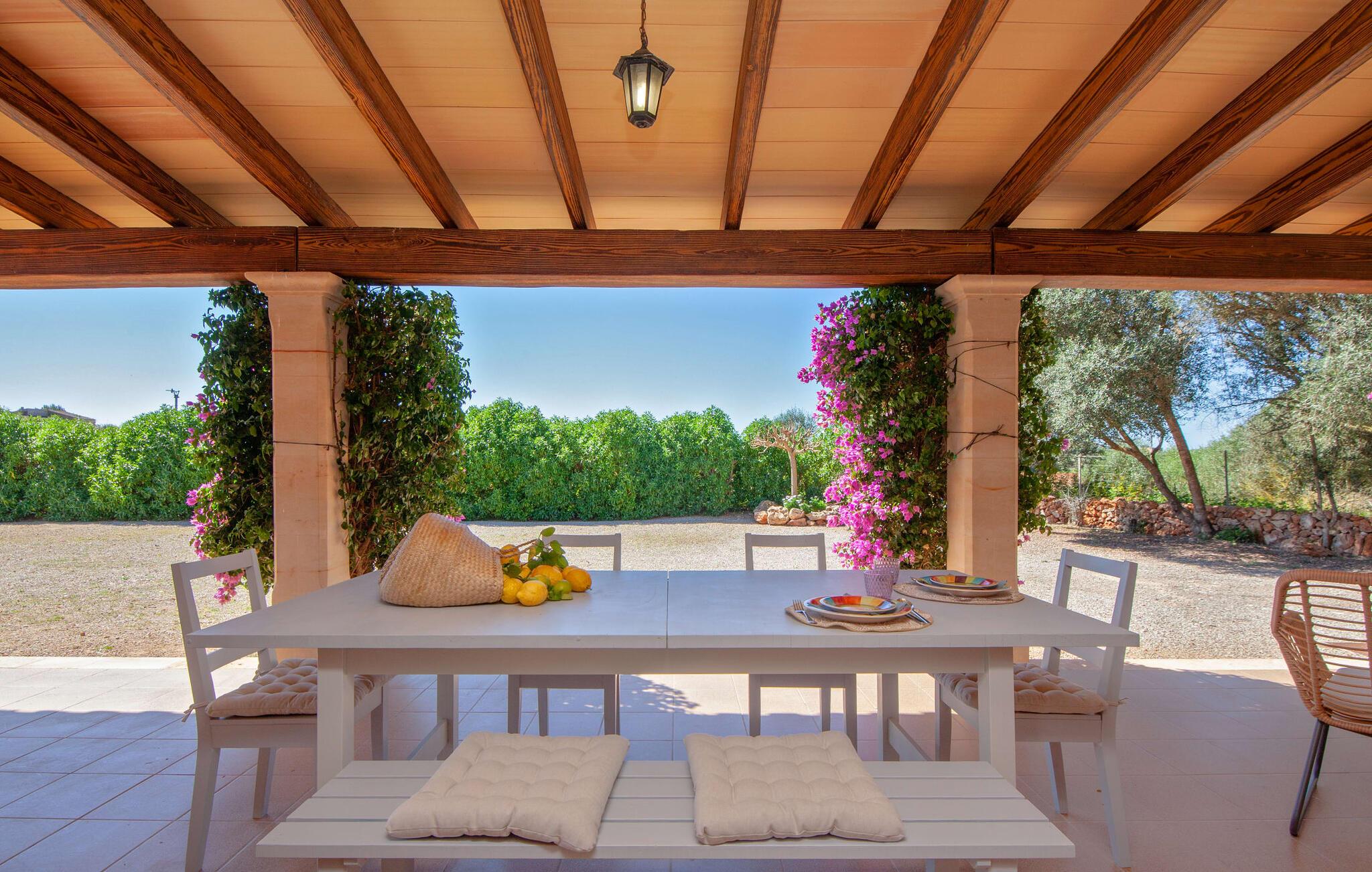 Ursprünglichkeit, Privatsphäre und Weite – wenn Ihnen das gefällt und Sie auf der Suche nach einem charmanten Zuhause für ein Paar sind, sollten Sie dieses Objekt fest im Auge behalten. Denn die Villa „Sa Vela“ vereint diese Elemente auf eine wirklich einladende Weise Weg und stellt einen Zufluchtsort der besonderen Art dar. Zu beachten ist, dass Villen für zwei Personen auf Mallorca kaum zu finden sind, da Ferienhäuser in der Regel deutlich größer gebaut werden. Das 6.000 m² große Anwesen bietet vielfältige Outdoor-Möglichkeiten für einen angenehmen Urlaubsaufenthalt. Das teilweise umzäunte Grundstück ist in Naturbereiche, einen hübschen Kiesbereich am Pool und den gefliesten Terrassenbereich direkt am Haus unterteilt. Der 4 x 3 m große Pool liegt umgeben von einer Natursteinmauer und ist über wenige Stufen bequem zu erreichen. Zum ausgiebigen Entspannen unter dem mediterranen Himmel stehen zwei bequeme Liegen zur Verfügung, ebenso ein Sonnenschirm, wenn die Sonnenstrahlen zu stark werden. Idealerweise gibt es in diesem Raum auch einen überdachten Bereich, in dem Sie etwas luftigen Schatten finden können. Auf dem hier platzierten Tisch haben Sie außerdem die Möglichkeit, eine Ihrer Mahlzeiten oder auch nur ein kühles Getränk zu genießen und dabei den schönen Blick in die Ferne zu genießen. Noch mehr Platz und Atmosphäre finden Sie auf der überdachten Terrasse direkt am Gebäude. Hier stehen zwei weitere Tische bereit, so dass ankommende Gäste trotz der Schlichtheit dieses kleinen Lokals den Luxus vollkommener Geräumigkeit genießen können. Wer möchte, kann sich hier nach Lust und Laune ausbreiten und sich jeden Tag einen neuen Lieblingsplatz suchen. Die freiliegenden Balken, Säulen, Fliesen und Natursteinwände zaubern ein rustikales Ambiente, das durch die hübschen Kletterblumen dekorativ aufgewertet wird. Der Großteil des verhältnismäßig großen Anwesens erstreckt sich vor Ihnen und ermöglicht Ihnen, Freiheit und Weite nach Herzenslust zu erleben, angefangen bei einem erfrischenden Frühstück am Morgen bis hin zu einem herzhaften Barbecue am Abend. bei dem Sie köstliche, frische Zutaten aus der Region genießen können.