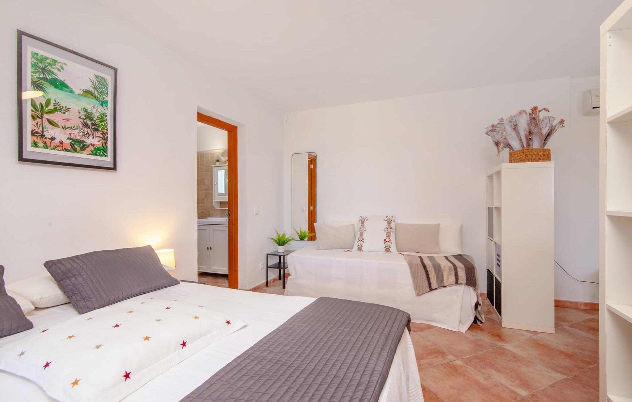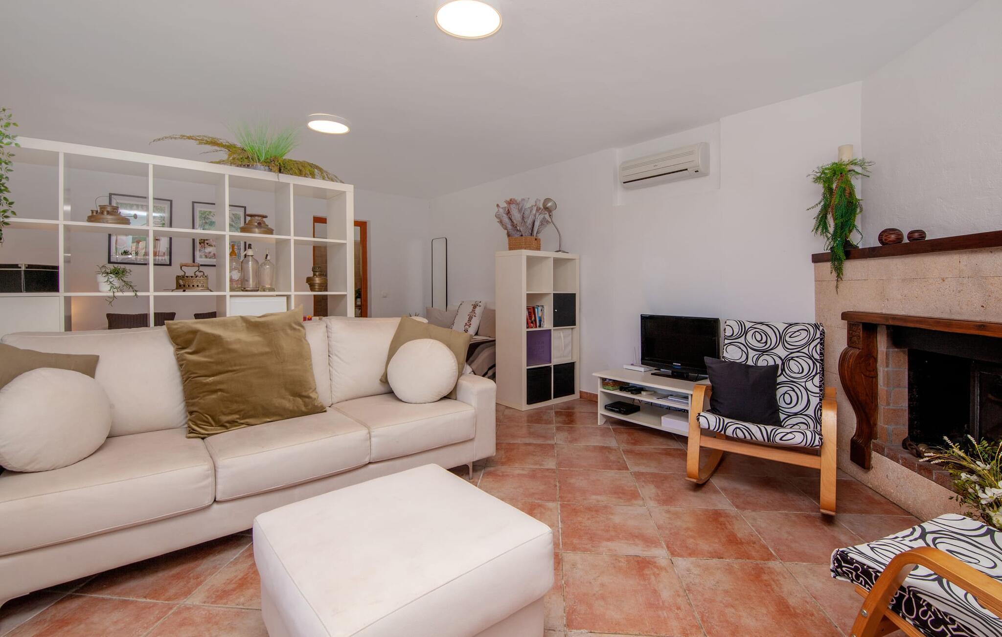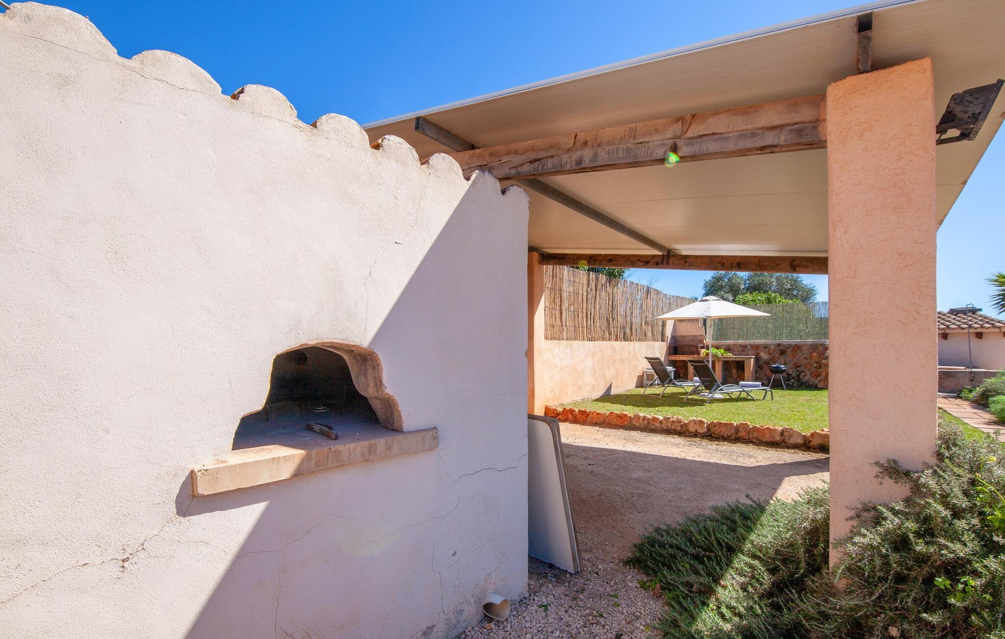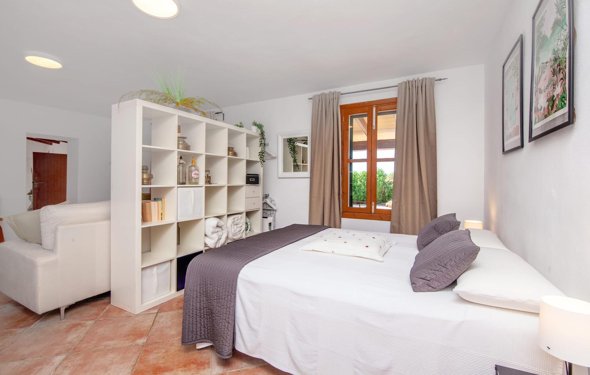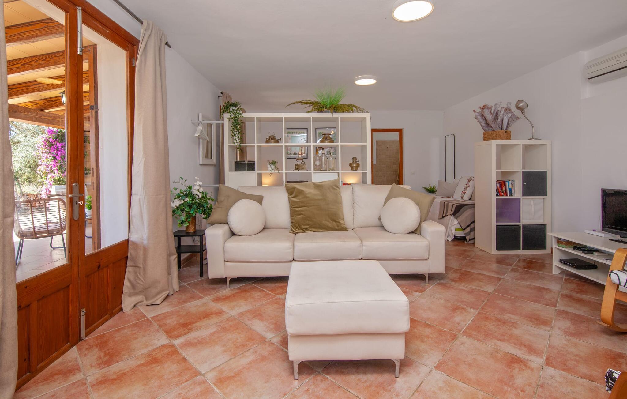 Ursprünglichkeit, Privatsphäre und Weite – wenn Ihnen das gefällt und Sie auf der Suche nach einem charmanten Zuhause für ein Paar sind, sollten Sie dieses Objekt fest im Auge behalten. Denn die Villa „Sa Vela“ vereint diese Elemente auf eine wirklich einladende Weise Weg und stellt einen Zufluchtsort der besonderen Art dar. Zu beachten ist, dass Villen für zwei Personen auf Mallorca kaum zu finden sind, da Ferienhäuser in der Regel deutlich größer gebaut werden. Das 6.000 m² große Anwesen bietet vielfältige Outdoor-Möglichkeiten für einen angenehmen Urlaubsaufenthalt. Das teilweise umzäunte Grundstück ist in Naturbereiche, einen hübschen Kiesbereich am Pool und den gefliesten Terrassenbereich direkt am Haus unterteilt. Der 4 x 3 m große Pool liegt umgeben von einer Natursteinmauer und ist über wenige Stufen bequem zu erreichen. Zum ausgiebigen Entspannen unter dem mediterranen Himmel stehen zwei bequeme Liegen zur Verfügung, ebenso ein Sonnenschirm, wenn die Sonnenstrahlen zu stark werden. Idealerweise gibt es in diesem Raum auch einen überdachten Bereich, in dem Sie etwas luftigen Schatten finden können. Auf dem hier platzierten Tisch haben Sie außerdem die Möglichkeit, eine Ihrer Mahlzeiten oder auch nur ein kühles Getränk zu genießen und dabei den schönen Blick in die Ferne zu genießen. Noch mehr Platz und Atmosphäre finden Sie auf der überdachten Terrasse direkt am Gebäude. Hier stehen zwei weitere Tische bereit, so dass ankommende Gäste trotz der Schlichtheit dieses kleinen Lokals den Luxus vollkommener Geräumigkeit genießen können. Wer möchte, kann sich hier nach Lust und Laune ausbreiten und sich jeden Tag einen neuen Lieblingsplatz suchen. Die freiliegenden Balken, Säulen, Fliesen und Natursteinwände zaubern ein rustikales Ambiente, das durch die hübschen Kletterblumen dekorativ aufgewertet wird. Der Großteil des verhältnismäßig großen Anwesens erstreckt sich vor Ihnen und ermöglicht Ihnen, Freiheit und Weite nach Herzenslust zu erleben, angefangen bei einem erfrischenden Frühstück am Morgen bis hin zu einem herzhaften Barbecue am Abend. bei dem Sie köstliche, frische Zutaten aus der Region genießen können.