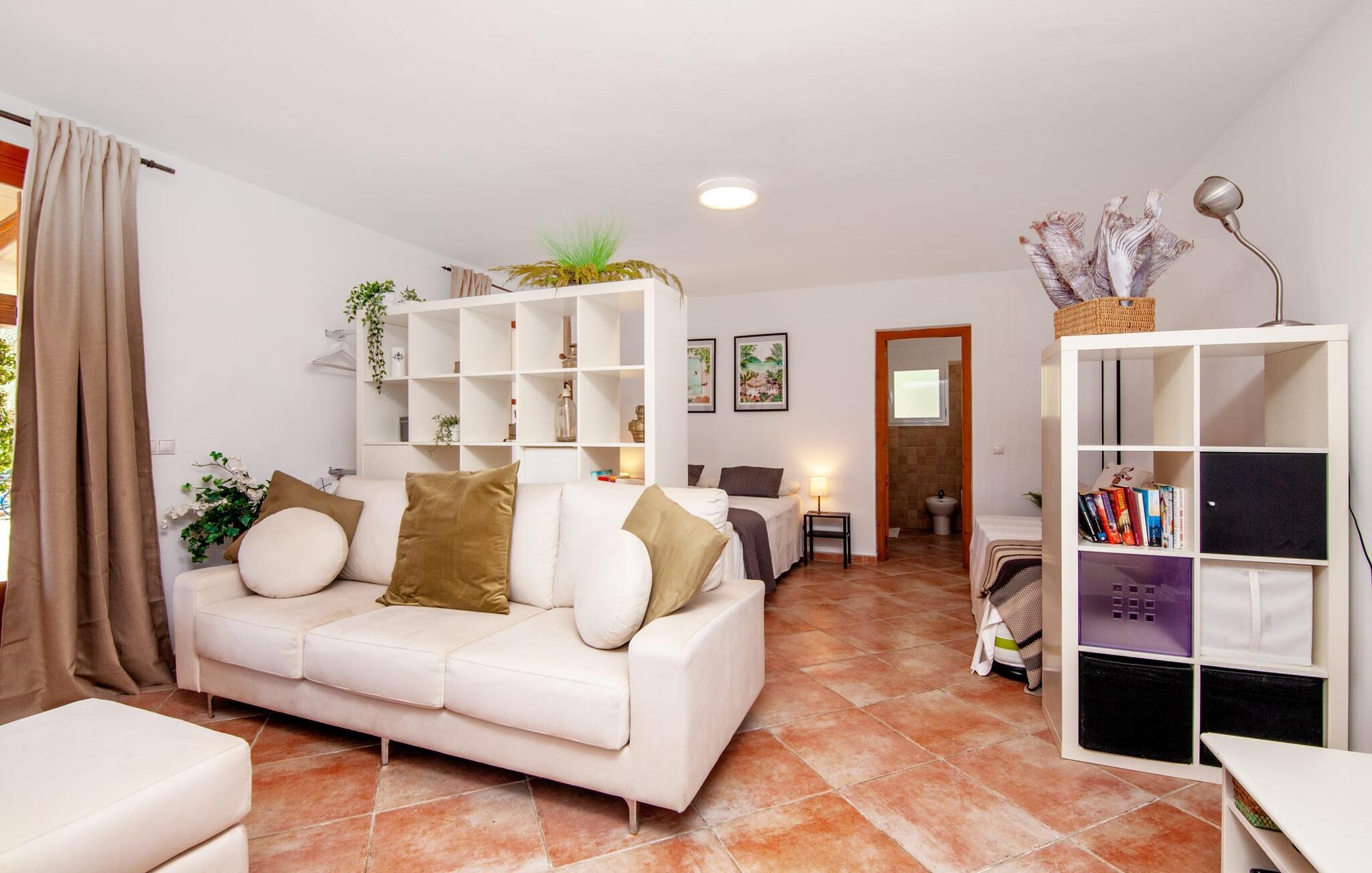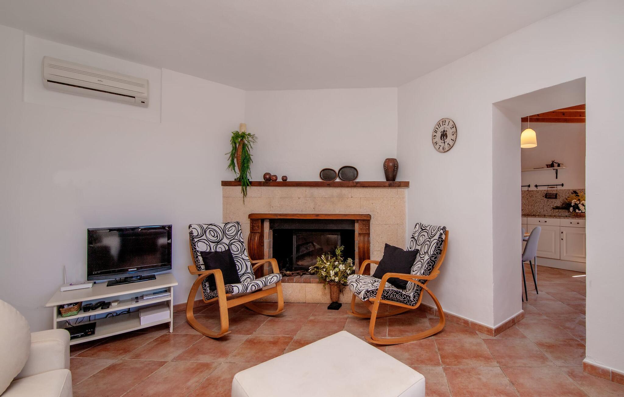 Das Innere des Hauses besticht durch eine originelle Raumaufteilung und ein geschmackvolles Flair. Von der Terrasse aus gelangen Sie in das Wohnzimmer, in dem ein Sessel und ein Sofa zum gemütlichen Verweilen einladen. Der imposante Kamin kann zur heimeligen Atmosphäre beitragen und an kühlen Abenden Wärme verbreiten. Es gibt auch eine Klimaanlage warm/kalt in diesem Raum. Die geräumige und helle Küche ist komplett ausgestattet und mit modernen Geräten ausgestattet. Er bietet ausreichend Stauraum und Arbeitsflächen, auch ein Esstisch findet hier bequem Platz. Ein Wasserkocher und eine Filterkaffeemaschine gehören ebenso zur Ausstattung wie ein Backofen, ein Kochfeld, eine Mikrowelle, ein Geschirrspüler und vieles mehr. Die geschickt abgetrennte, gemütliche Schlafzone sorgt mit einem Bett der Größe 1,60 x 2,00 für eine erholsame Nacht. Ein zeitgemäßes Design erwartet die Gäste im lichtdurchfluteten Badezimmer, das direkt neben dem Schlafbereich liegt. Ein Bügeleisen und ein Haartrockner sind im Haus vorhanden, Sie müssen also keinen eigenen von zu Hause mitbringen.