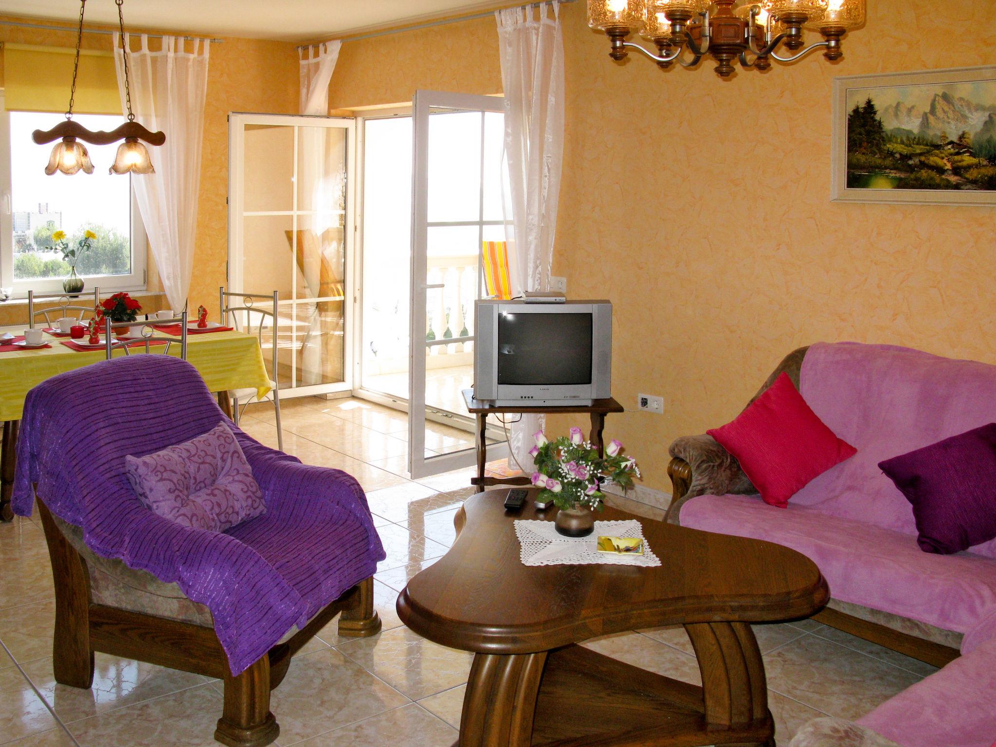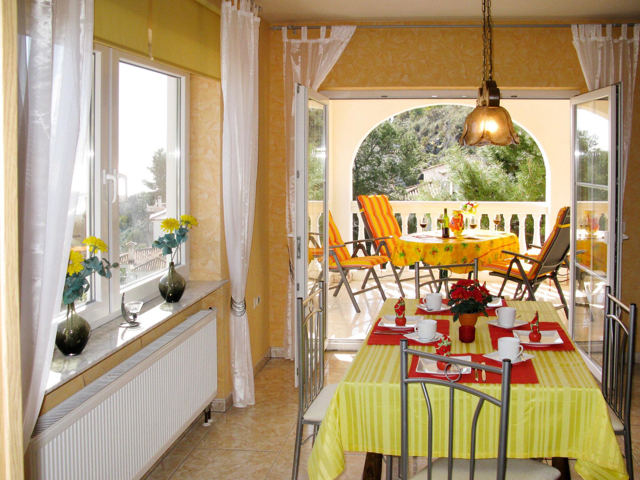 "Salz", 3-room apartment 80 m2, on the ground floor. Wooden furniture furnishings: living/dining room with dining table, satellite TV and DVD. Exit to the terrace. 1 double bedroom with 1 double bed and shower/WC. 1 double bedroom with 1 double bed. Open kitchen (4 ceramic glass hob hotplates, toaster, kettle, microwave, freezer, electric coffee machine). Bath/WC. Oil heating. Terrace 18 m2, roofed. Terrace furniture, electric barbecue. Panoramic view of the sea and the resort. Facilities: iron, children's high chair, baby cot. Parking (extra). VUT/GR/01370 // Reg. Nr.: ESFCTU0000180240002416370000000000000000VUT/GR/013707