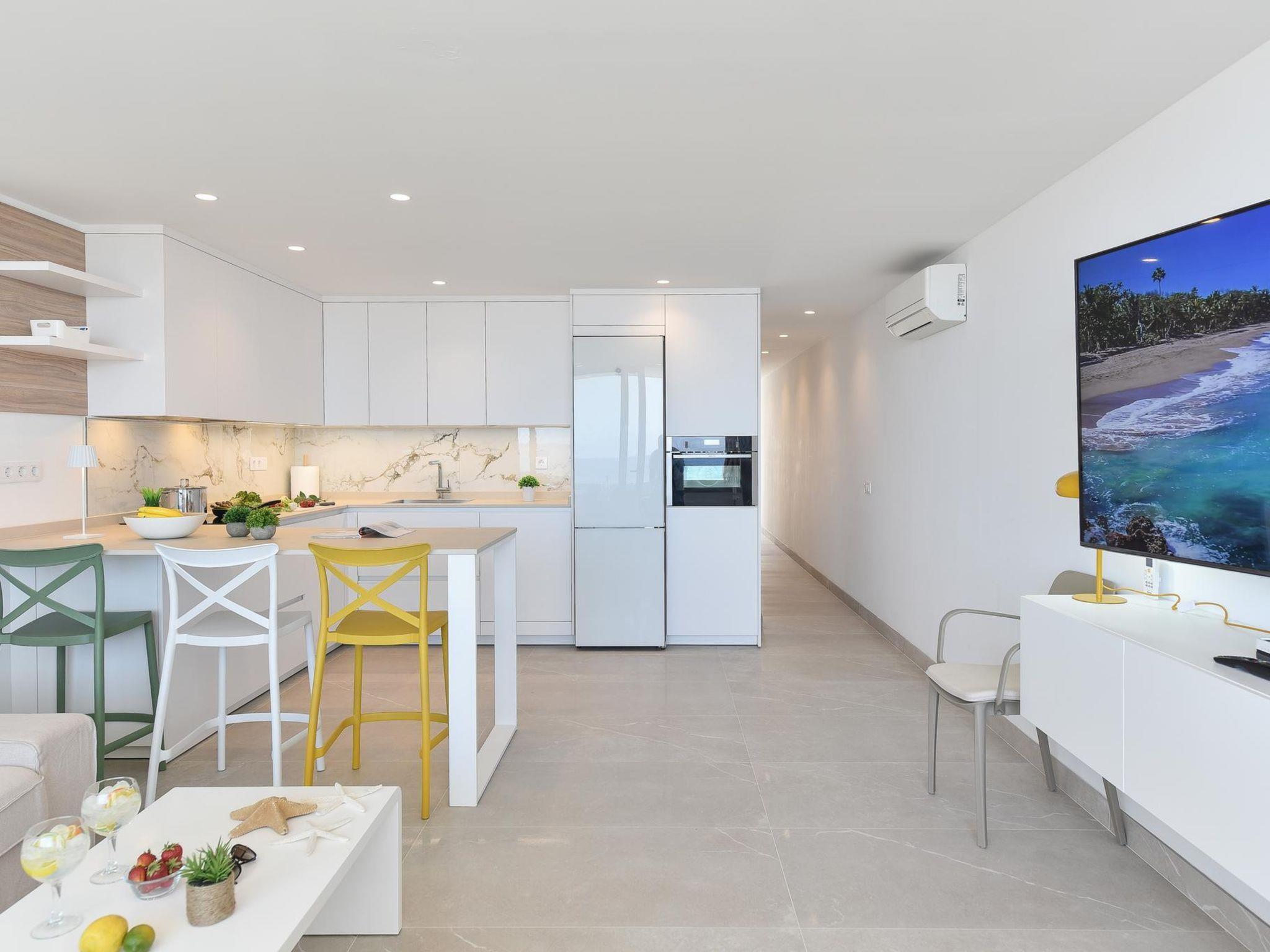 "Nasas 12", 3-room apartment 74 m2, on the upper floor. Comfortable and cosy furnishings: living room with satellite TV, digital TV and air conditioning. Exit to the balcony. 1 room with 1 french bed. 1 room with 2 beds. Open kitchen (oven, dishwasher, toaster, kettle, microwave, freezer, electric coffee machine) with dining table. Shower/WC. Balcony. Balcony furniture. Marvellous view of the sea. Facilities: washing machine, iron, children's high chair, baby cot for up to 2 year olds, hair dryer. Internet (WiFi, free). Please note: non-smokers only. 2021-T2173 // Reg. Nr.: ESFCTU0000350120001899710000000000000VV-35-1-00155962