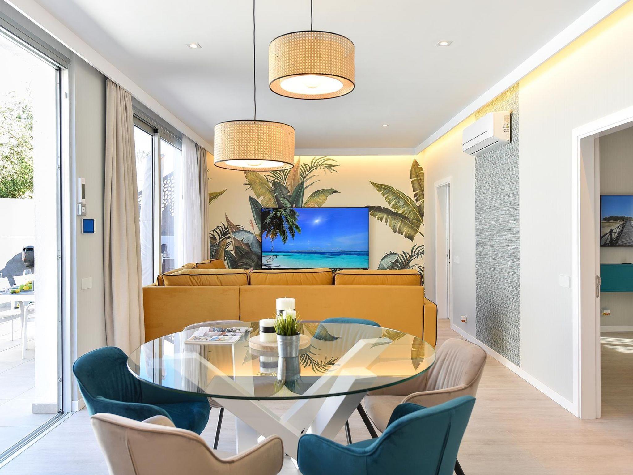 "Villa Joviano", 4-room house 150 m2. Comfortable and modern furnishings: living/dining room with dining table, digital TV and air conditioning. Exit to the patio. 1 room with 1 french bed, shower/WC and air conditioning. 2 rooms, each room with 2 beds and air conditioning. Kitchen (oven, dishwasher, 3 ceramic glass hob hotplates, toaster, kettle, microwave, freezer, electric coffee machine) with dining nook. 2 showers/WC. Patio. Terrace furniture, barbecue, deck chairs. View of the garden. Facilities: washing machine, safe, iron, children's high chair, baby cot for up to 2 year olds, hair dryer. Internet (WiFi, free). Please note: non-smoking house. 2023-T2340