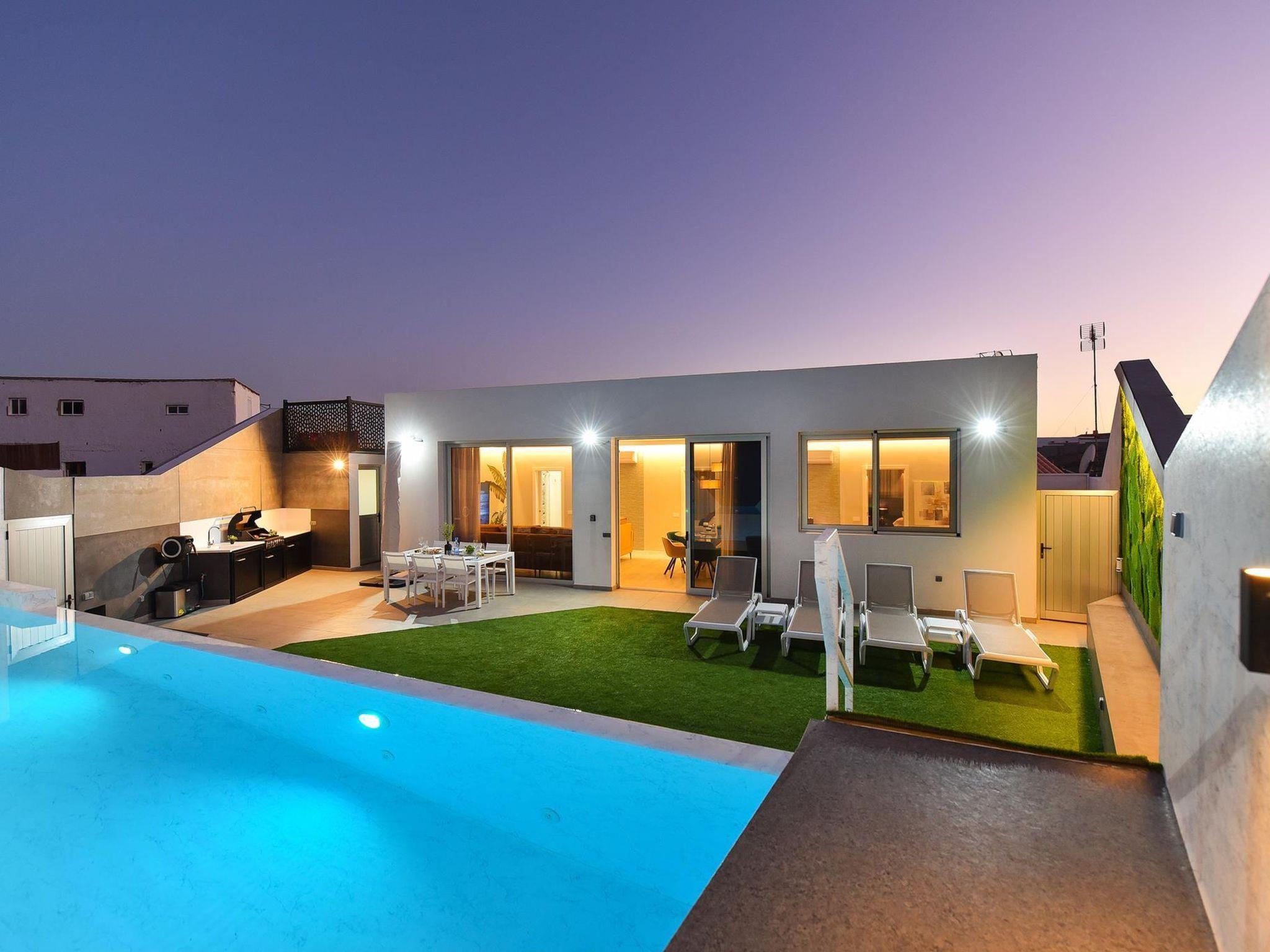 Modern, comfortable villa "Joviano". Above Maspalomas, in the centre of El Salobre. Private: property (fenced), swimming pool angular (7 x 3 m, depth 130 - 130 cm, seasonal availability: 01.Jan. - 31.Dec.). Outdoor shower, barbecue. In the house: sun terrace, air conditioning. Parking, public parking on the road. Shop 2 km, supermarket 2 km, restaurant 2 km, bus stop "Tablero de Maspalomas" 1.2 km. The owner does not accept any youth groups. Please note: airfield 35 km from the property. Neighbourhood highly sensitive to noise. Quietness and good behaviour expected.