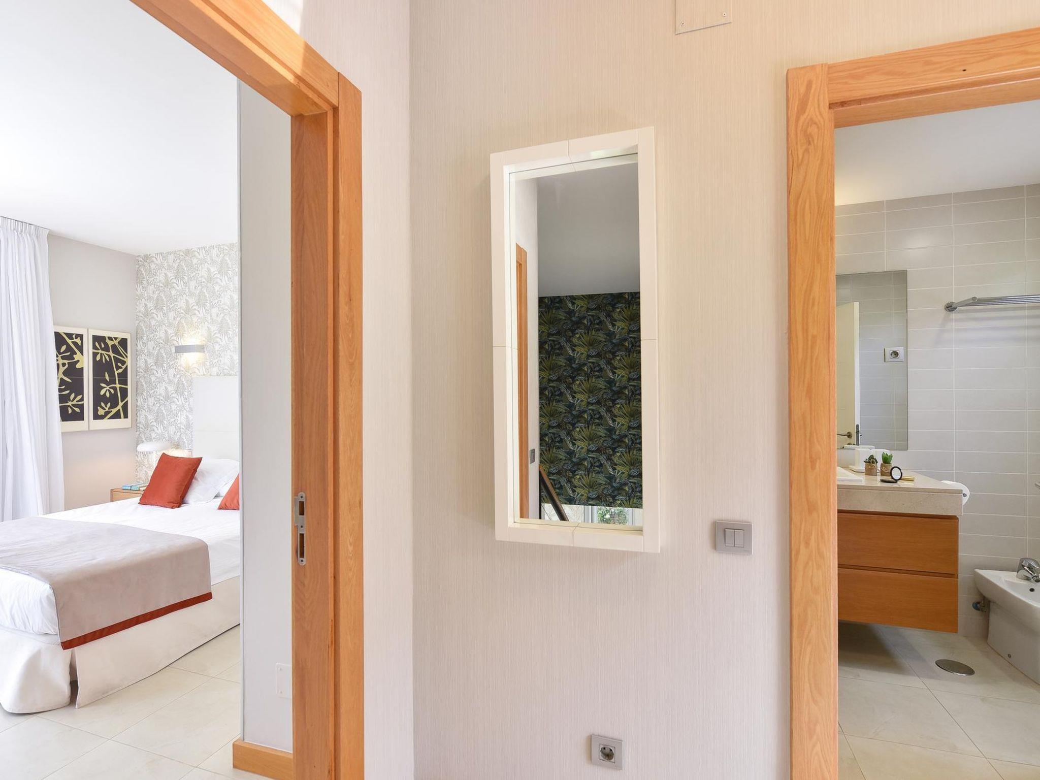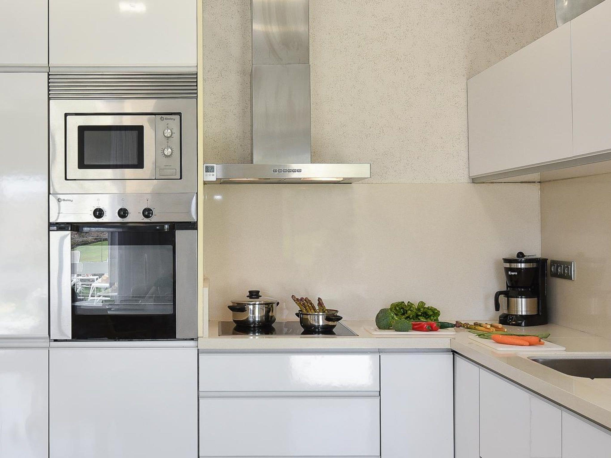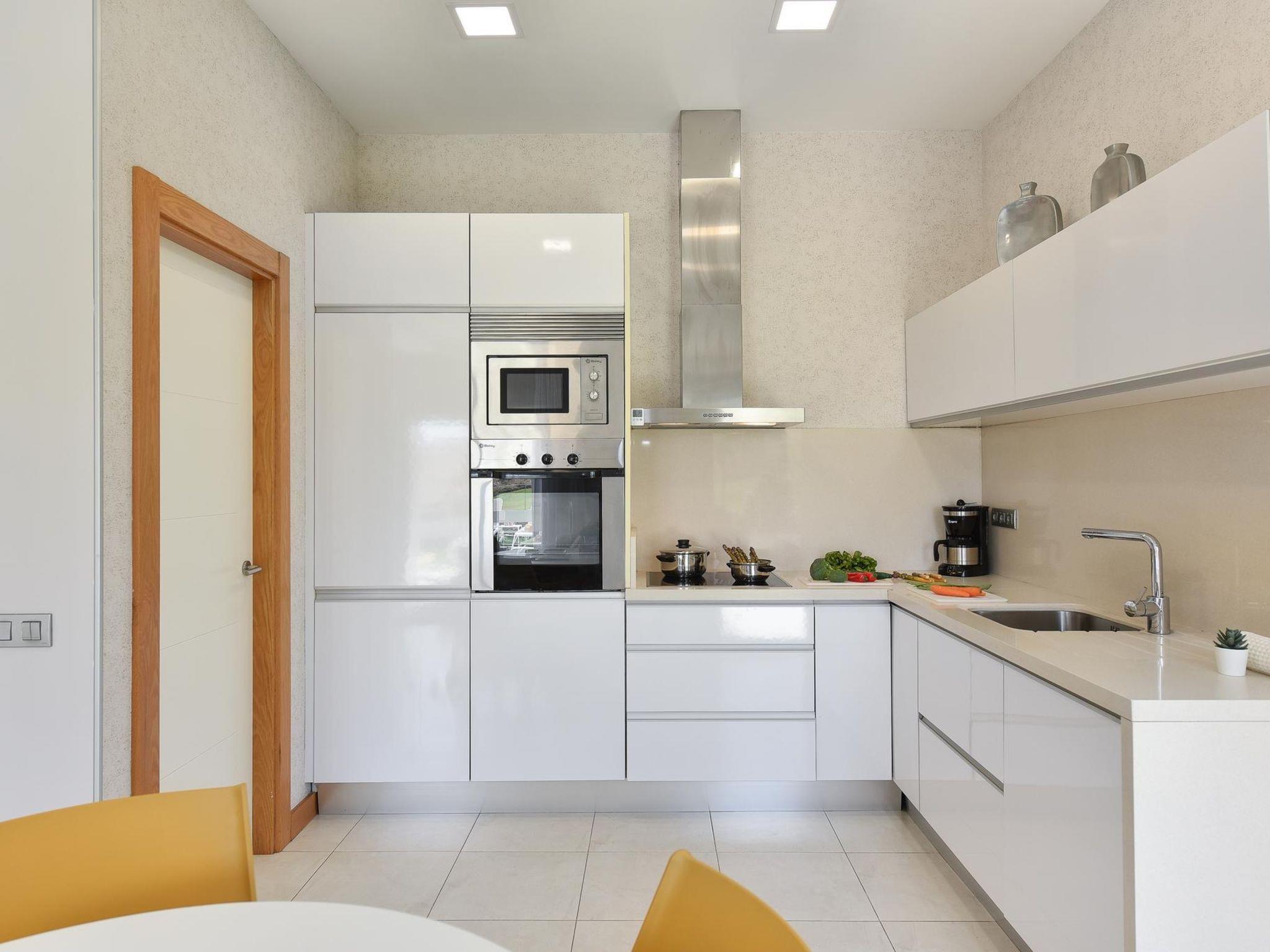"Vista Golf 10", 3-room house 105 m2 on 2 levels. Comfortable and modern furnishings: living room with digital TV and air conditioning. Exit to the patio, to the swimming pool. 1 room with 2 beds and air conditioning. Exit to the patio, to the swimming pool. Kitchen-/living room (oven, dishwasher, 3 ceramic glass hob hotplates, toaster, kettle, microwave, freezer, electric coffee machine) with dining table. Bath/bidet/WC. Upper floor: 1 room with 1 french bed and air conditioning. Exit to the balcony. Shower/bidet/WC. Patio. Terrace furniture, balcony furniture, barbecue, deck chairs. View of the garden and the forest. Facilities: washing machine, safe, iron, children's high chair, baby cot for up to 2 year olds, hair dryer. Internet (WiFi, free). Parking (1 car). Please note: non-smoking house. Maximum 1 pet/ dog allowed. 2023-T5471 // Reg. Nr.: ESFCTU0000350120004894840000000000000VV-35-1-00196592