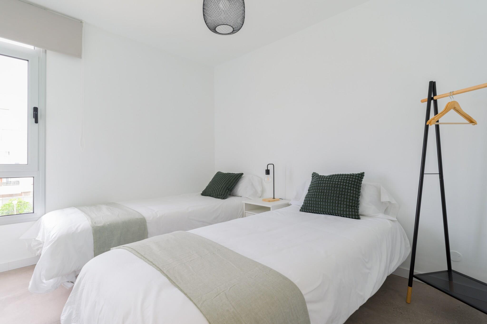 Elevator, Fan, Kitchen(electric kettle, toaster, coffee machine, microwave, dishwasher, fridge, freezer, Juicer, dishes and cutlery), Living/diningroom(TV(satellite), dining table, seating area), bedroom(single bed, single bed), bedroom(double bed), bathroom(shower), Internet access, air conditioning, terrace, sun loungers, parking, swimming pool(shared with other guests), iron, hairdryer