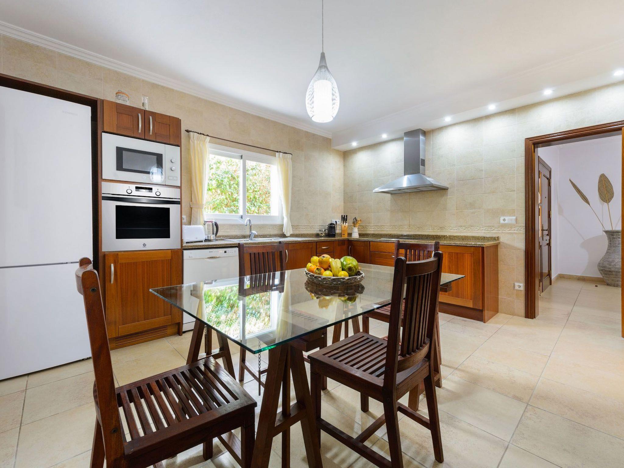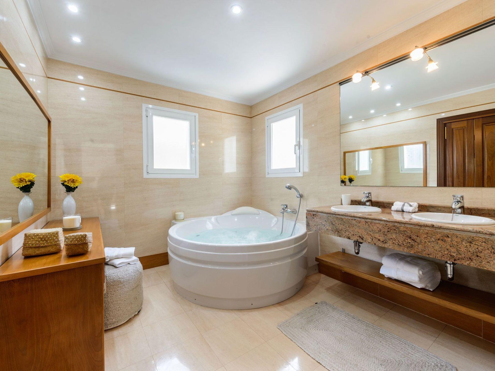 Lovely villa is close to Km 5 Restaurant with four bedrooms and three bathrooms, two Jacuzzis, a big pool heated from 15 September until 15 June, a beautiful garden, one main house, and one extra house only for you.