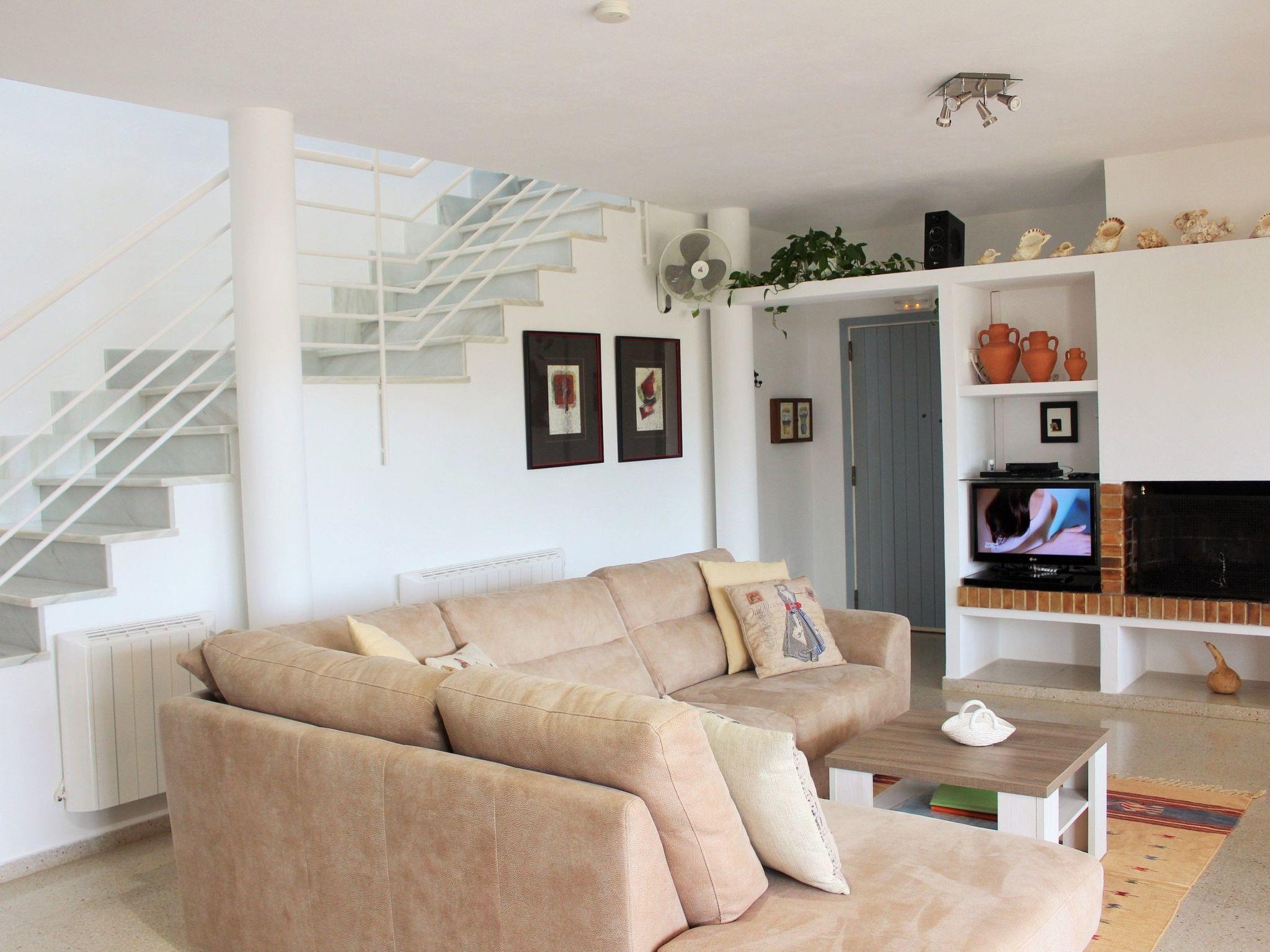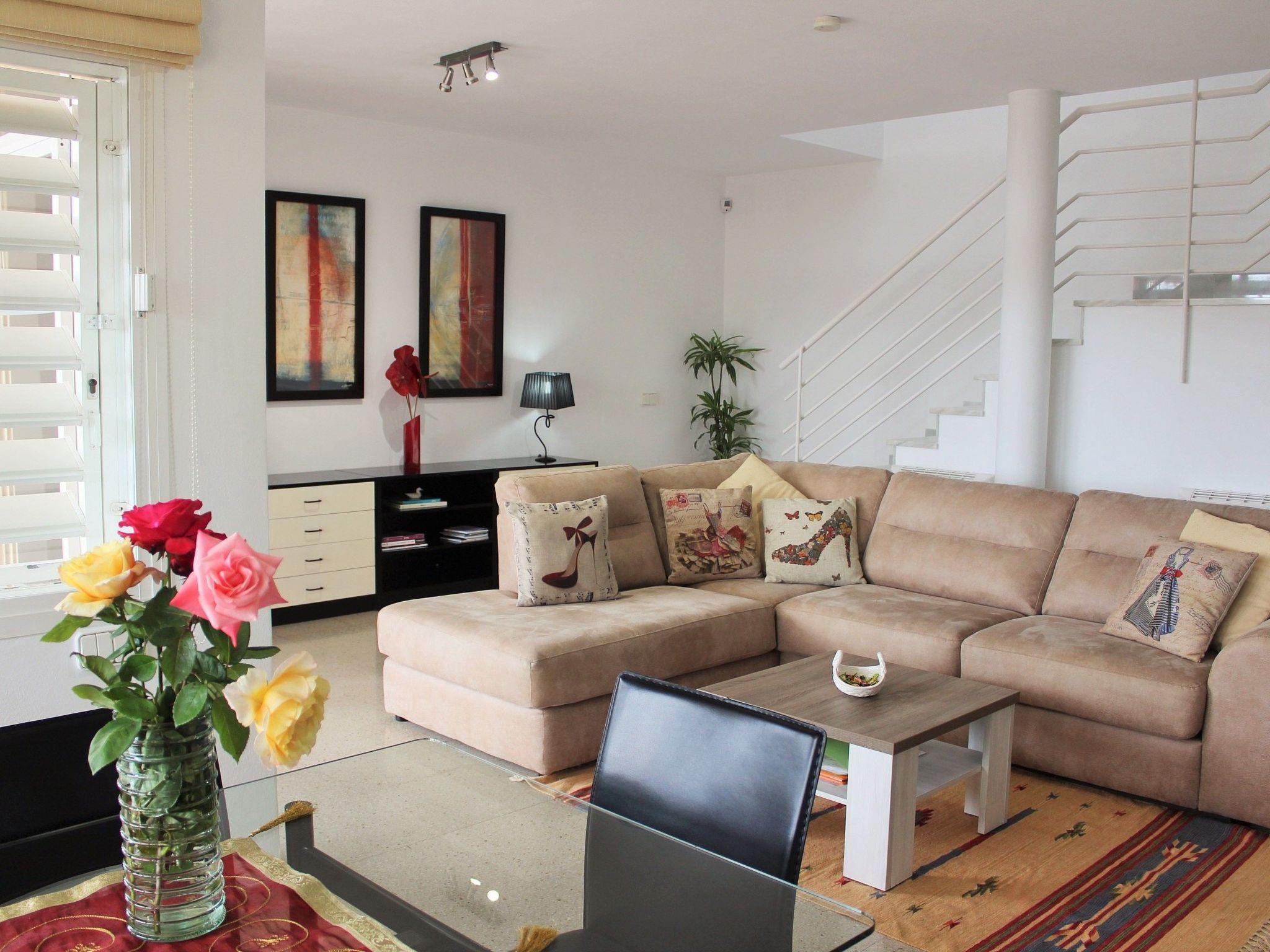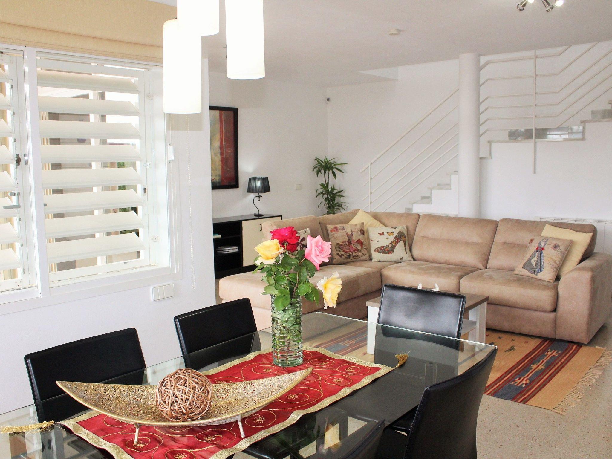 The interior of this holiday home spans a generous 180 m² across two levels, ensuring ample space for comfort and relaxation. On the ground floor, you will find a spacious, open-plan living area that includes a comfortable sofa and an ample dining table with plenty of seating, perfect for gatherings. The modern, fully-equipped kitchen with its latest appliances, including a ceramic hob, oven, large refrigerator, microwave, toaster, and dishwasher, makes cooking a breeze. Also, there's a convenient bathroom with a shower on this level. Upstairs, the house boasts a cozy bedroom with a double bed, two additional bedrooms each with two single beds, and a large bathroom equipped with a bathtub. Each bedroom provides direct access to a terrace, offering a private space to enjoy the outdoors.