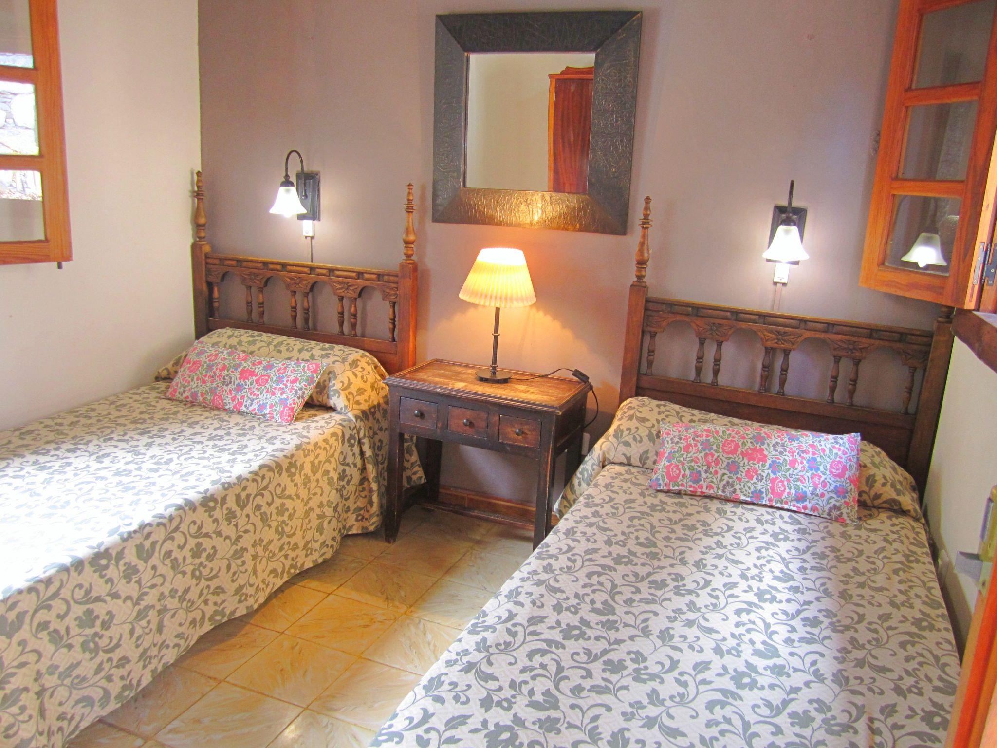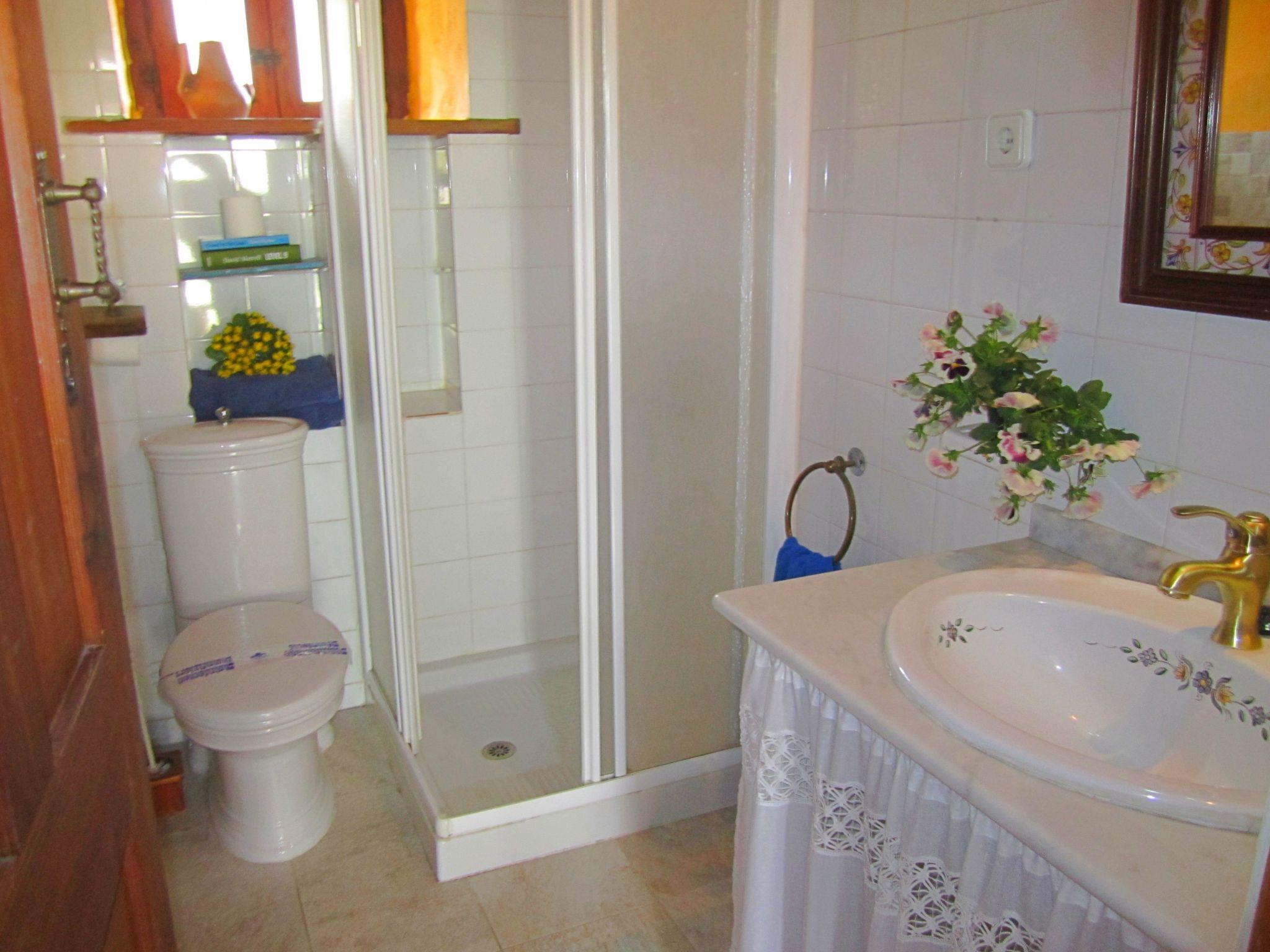 The two-storey holiday home has a living room on the ground floor with a sitting area, satellite TV and a small dining table for communal meals. From there you have direct access to the terrace. The fully equipped kitchen, which is also integrated in the living room, has a ceramic hob, oven and fridge with freezer compartment, as well as a microwave, toaster and kettle. Also on the ground floor is one of the three bathrooms with shower, washbasin, WC and washing machine. Upstairs there are two large bedrooms, one with a double bed and the other with two single beds, with views of the mountains and pine forests, as well as another bathroom with shower, washbasin and WC. On the other side of the courtyard there are two further bedrooms. One with two single beds and the other is a large bedroom with four single beds and a bathroom with shower, washbasin and WC. The house has air conditioning and heating for the winter, as well as WLAN connection.