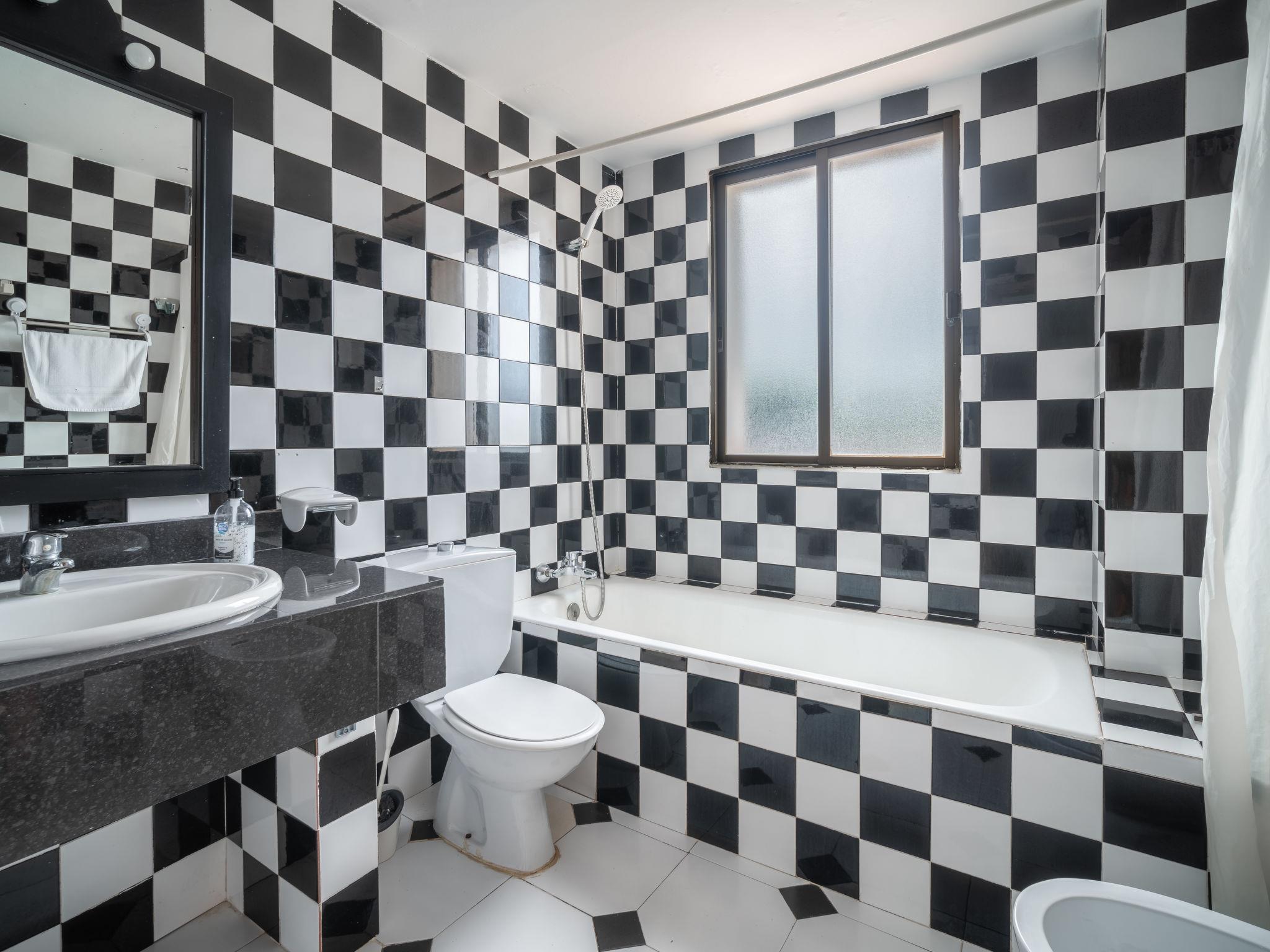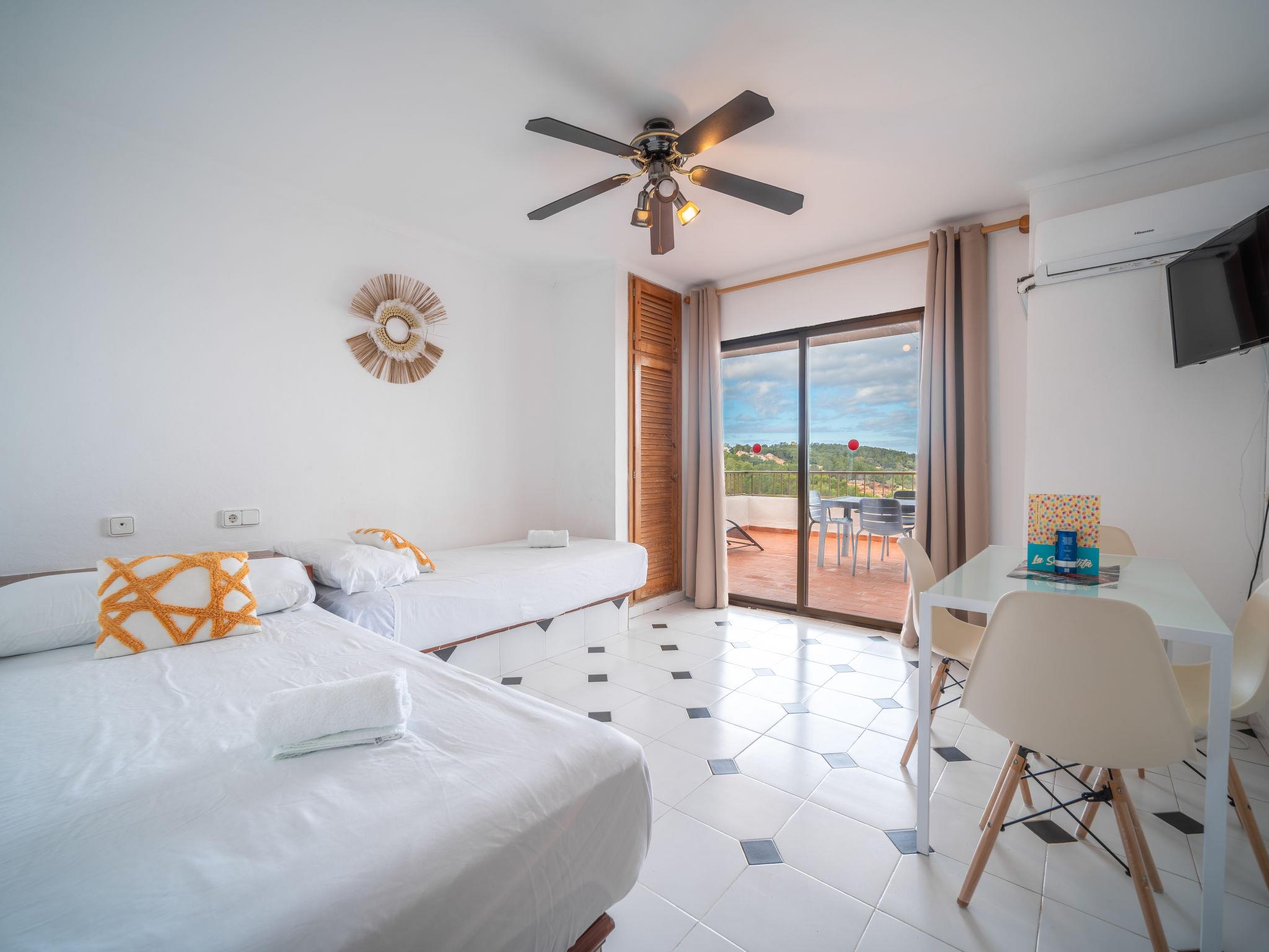 Portinatx 9 km from Sant Joan de Labritja: Cosy, simple aparthotel "Apartamentos Es Grop Portinatx". 17 apartments in the property. In a central, quiet position, 1 km from the edge of the forest, 30 m from the sea, 30 m from the beach, direct access to the beach. For shared use: garden, swimming pool angular (6 x 3 m, seasonal availability: 01.Apr. - 31.Oct.). WC in the pool area, outdoor shower, terrace. In the house: reception, restaurant, bistro, WiFi, lift, air conditioning. Parking (for 10 cars). Shop, grocery 150 m, supermarket 200 m, restaurant, bar 10 m, bakery 150 m, café 100 m, pedestrian zone 10 m, bus stop "Cala Portinatx" 350 m, sandy beach "Platja Portinatx" 15 m, diving center 2 km, outdoor swimming pool 10 m. Nearby attractions: Cala Xarraca 2 km, Cala de Xuclar 850 m, Cala d'en Serra 1.9 km, Faro de Portinatx 1.5 km, Faro de la punta de Moscater 2.5 km. Hiking paths: Sendero del Far des Moscater 1.5 km. Please note: Loading and unloading of baggage is possible at the holiday house. Guarded residence. Main road 60 m from the property. Airfield 36 km from the property. The photograph shows a typical example. The tap water has no drinking water quality. The holiday properties may differ in living space, floorplan, equipment and furnishing.