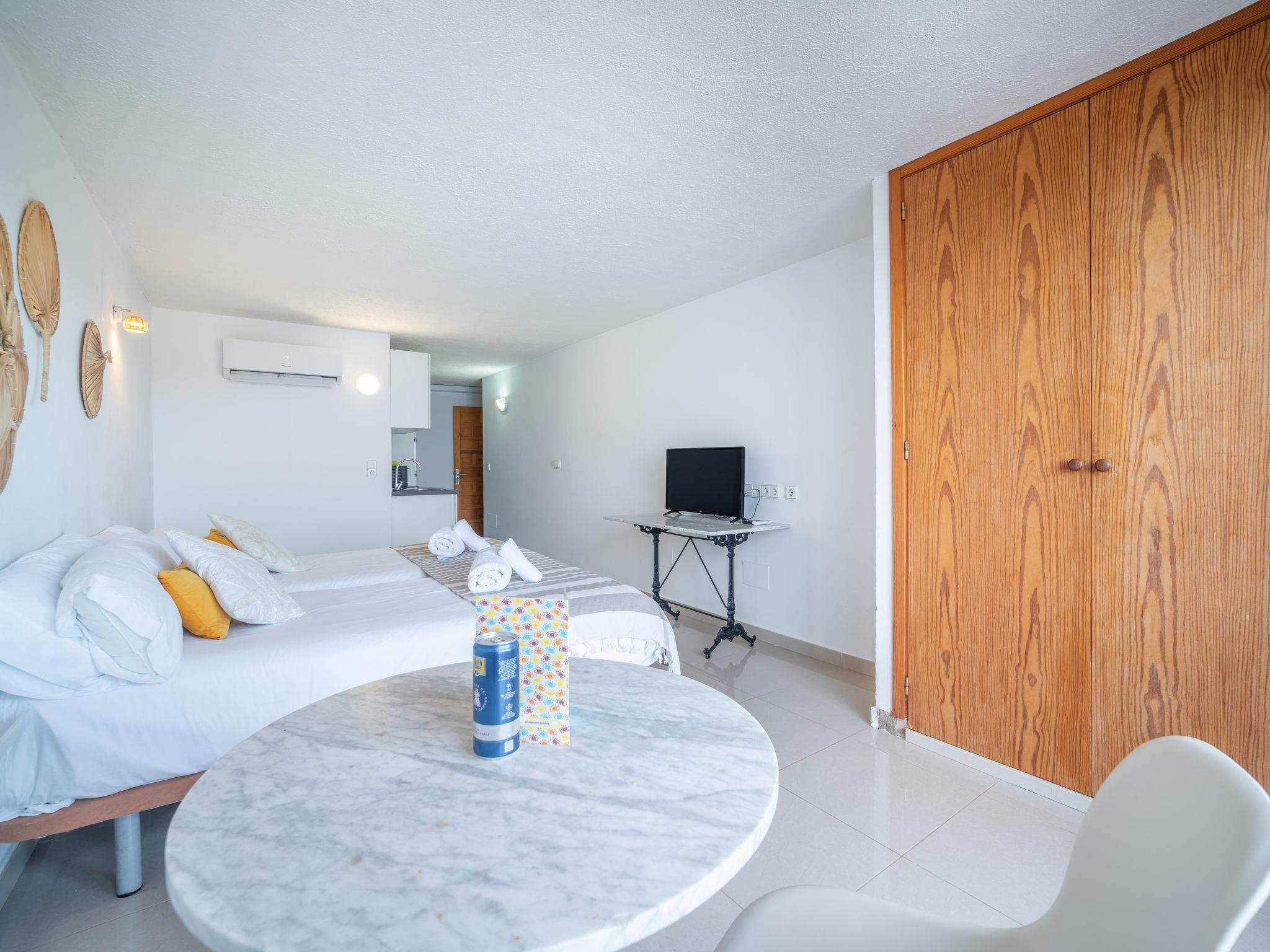"Es Grop Est. Vista Mar", 1-room studio 35 m2. Object suitable for 2 adults. Bright, simple and cosy furnishings: open, Studio with 2 beds (90 cm, length 200 cm), dining table, shower/WC, digital TV, air conditioning, fan and forced-air heating. Exit to the balcony. Kitchenette (mini-oven, oven, 2 ceramic glass hob hotplates, toaster, microwave, electric coffee machine). Natural stone floors. Terrace furniture. Marvellous view of the sea. Facilities: baby cot for up to 2 year olds, hair dryer. Internet (WiFi, free). Parking (fenced 10 cars). APM-2033