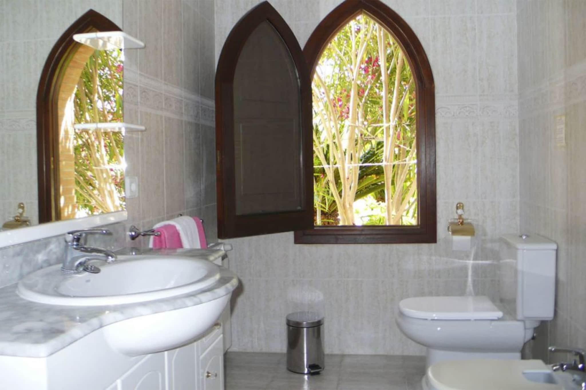Living room(TV(satellite), CD player, stereo unit, terrace), dining room(terrace(roofed)), Large kitchen(cooker(ceramic), oven, microwave, dishwasher, fridge-freezer, washing machine), Bedroom with bathroom(double bed(180 x 200 cm), bath tub, air conditioning), Bedroom with bathroom(2x single bed(100 x 200 cm), bath tub, air conditioning), Bedroom with bathroom(2x single bed(100 x 200 cm), shower, air conditioning), single bed, terrace, garden, swimming pool(private, 9 x 5 m.)