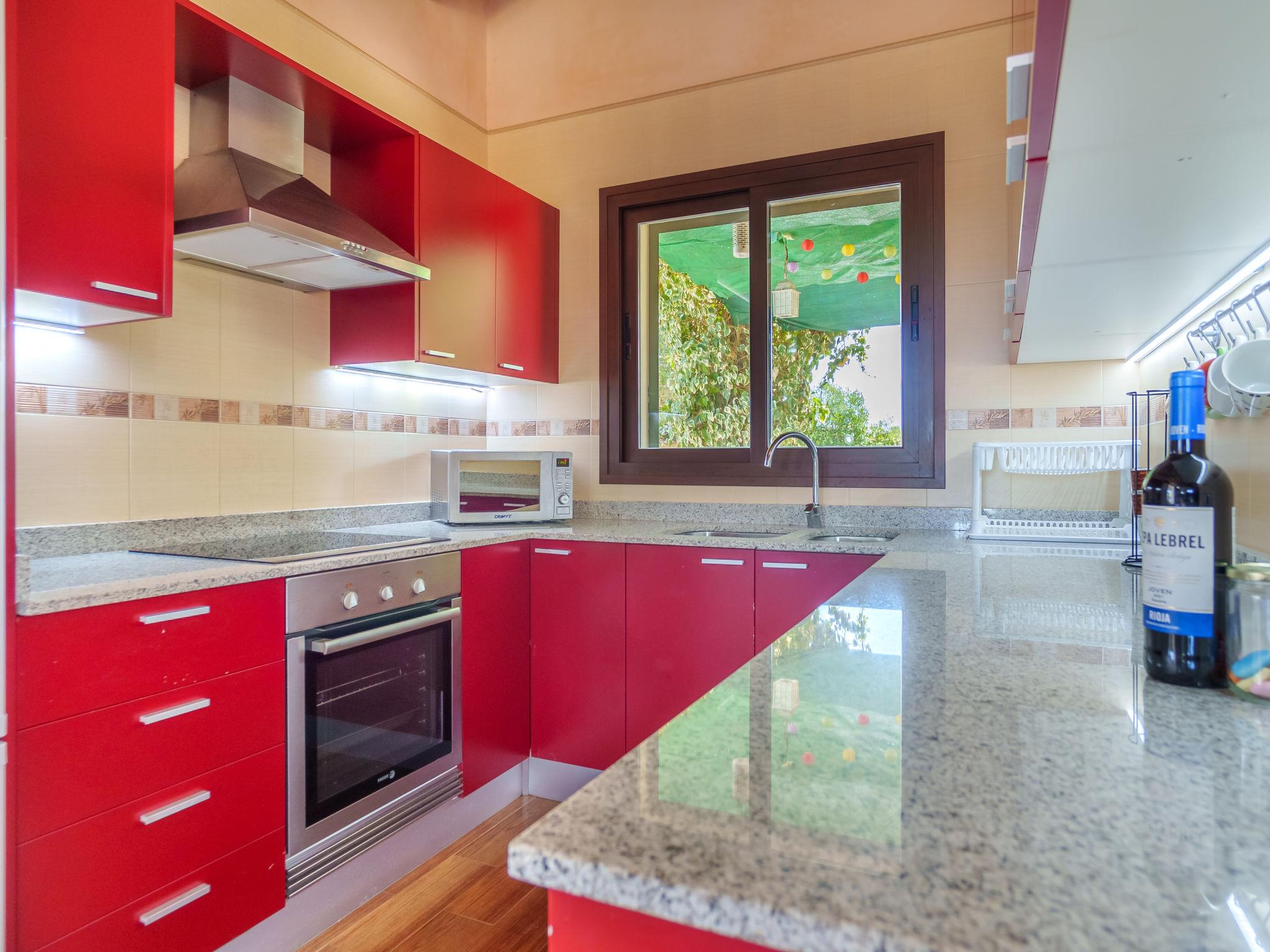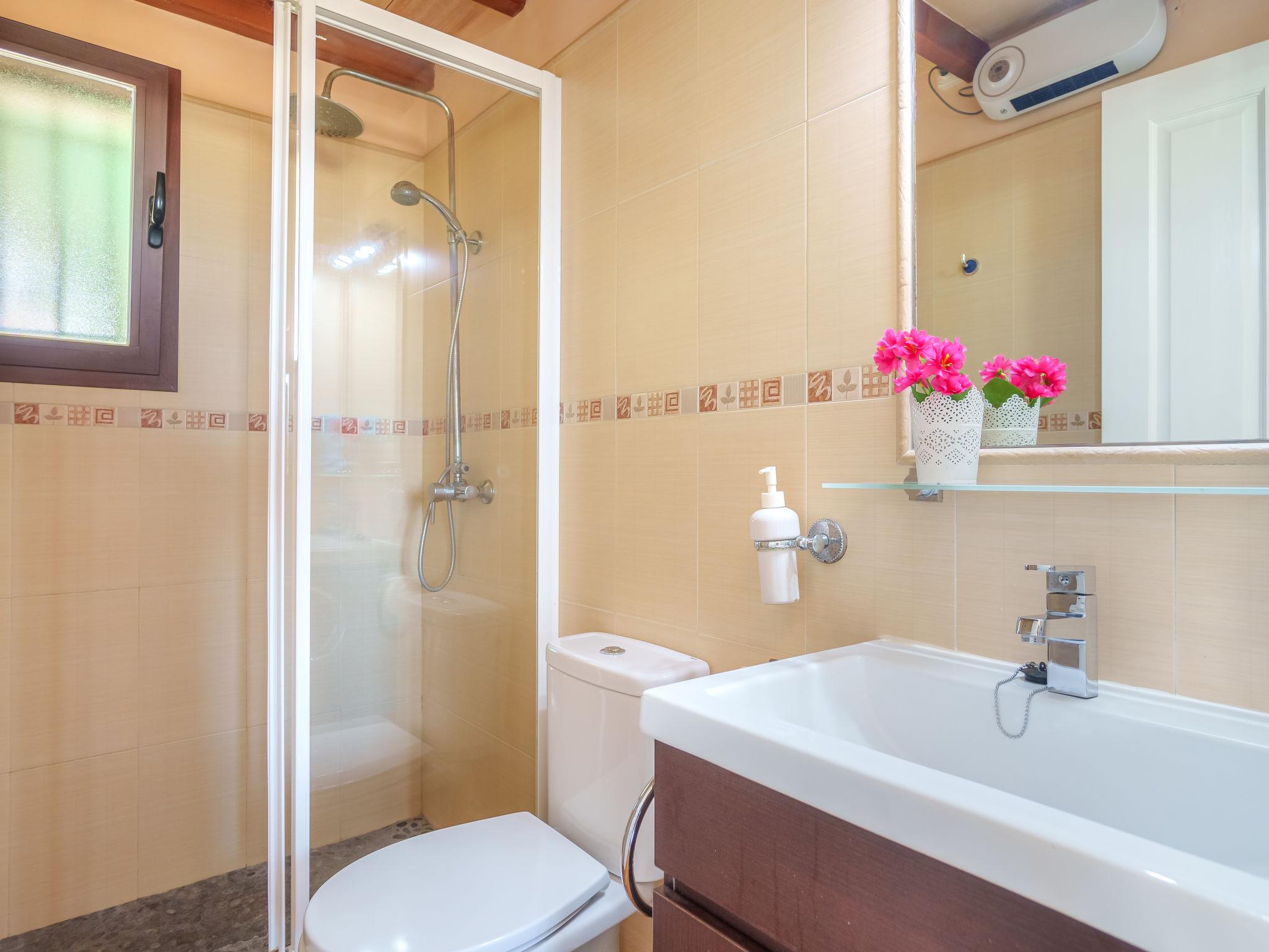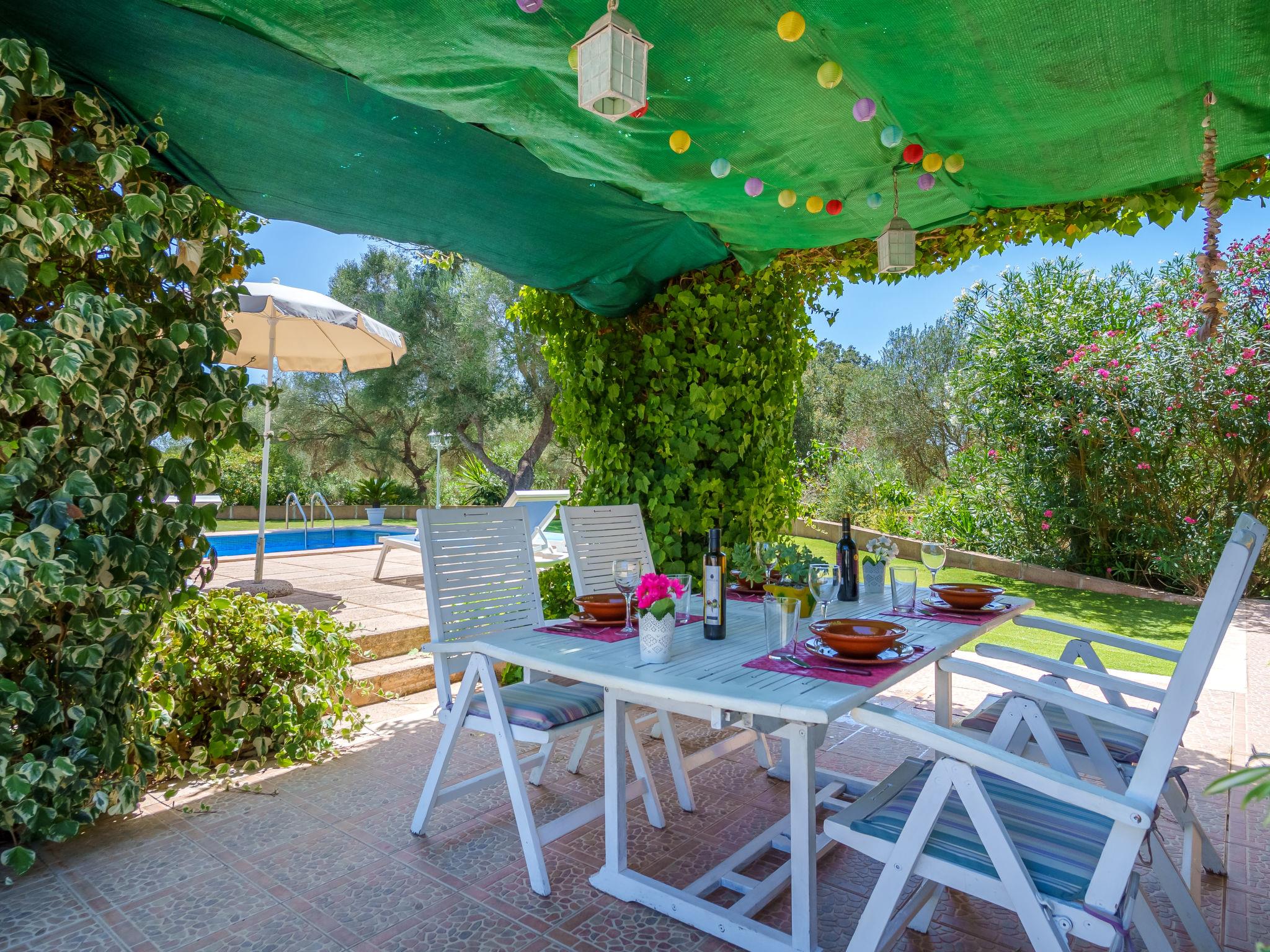"Sa Teulada", 3-room villa 65 m2, lower ground floor. Object suitable for 4 adults. Practical and comfortable furnishings: open living/dining room with open-hearth fireplace (only for decoration), dining table, digital TV, flat screen, air conditioning and forced-air heating. Exit to the patio. 2 large double bedrooms, each room with 2 beds (90 cm, length 200 cm), digital TV, flat screen, air conditioning and forced-air heating. Open kitchen (oven, 3 ceramic glass hob hotplates, toaster, kettle, microwave, freezer, electric coffee machine). Shower/WC. Electric heating. Large patio, porch. Terrace furniture, barbecue, deck chairs, covered balcony. View of the garden and the countryside. Facilities: washing machine, iron, children's high chair, baby cot for up to 2 year olds, hair dryer. Internet (WiFi, free). Parking (fenced) at the house. Please note: non-smoking house. The pool mentioned in the description is for private use. ETV/11875 // Reg. Nr.: ESFCTU00000701100099576300000000000000000000ETV/118750
