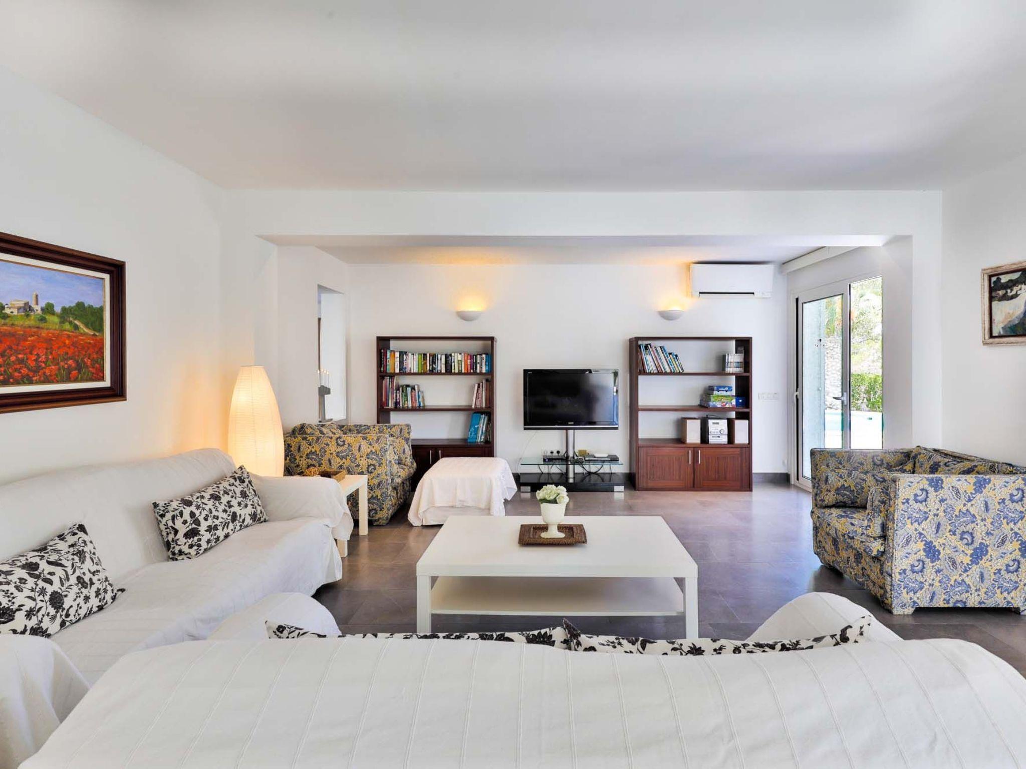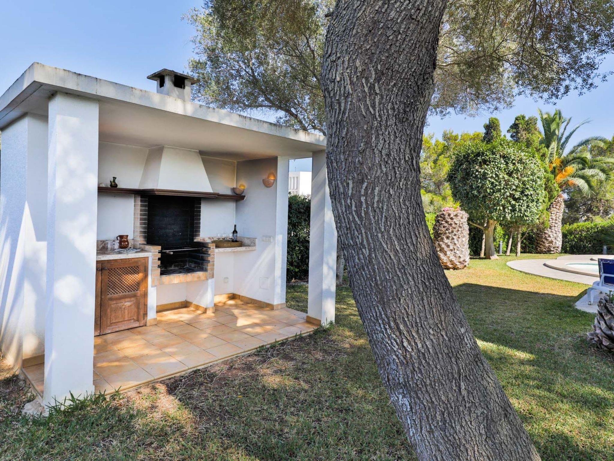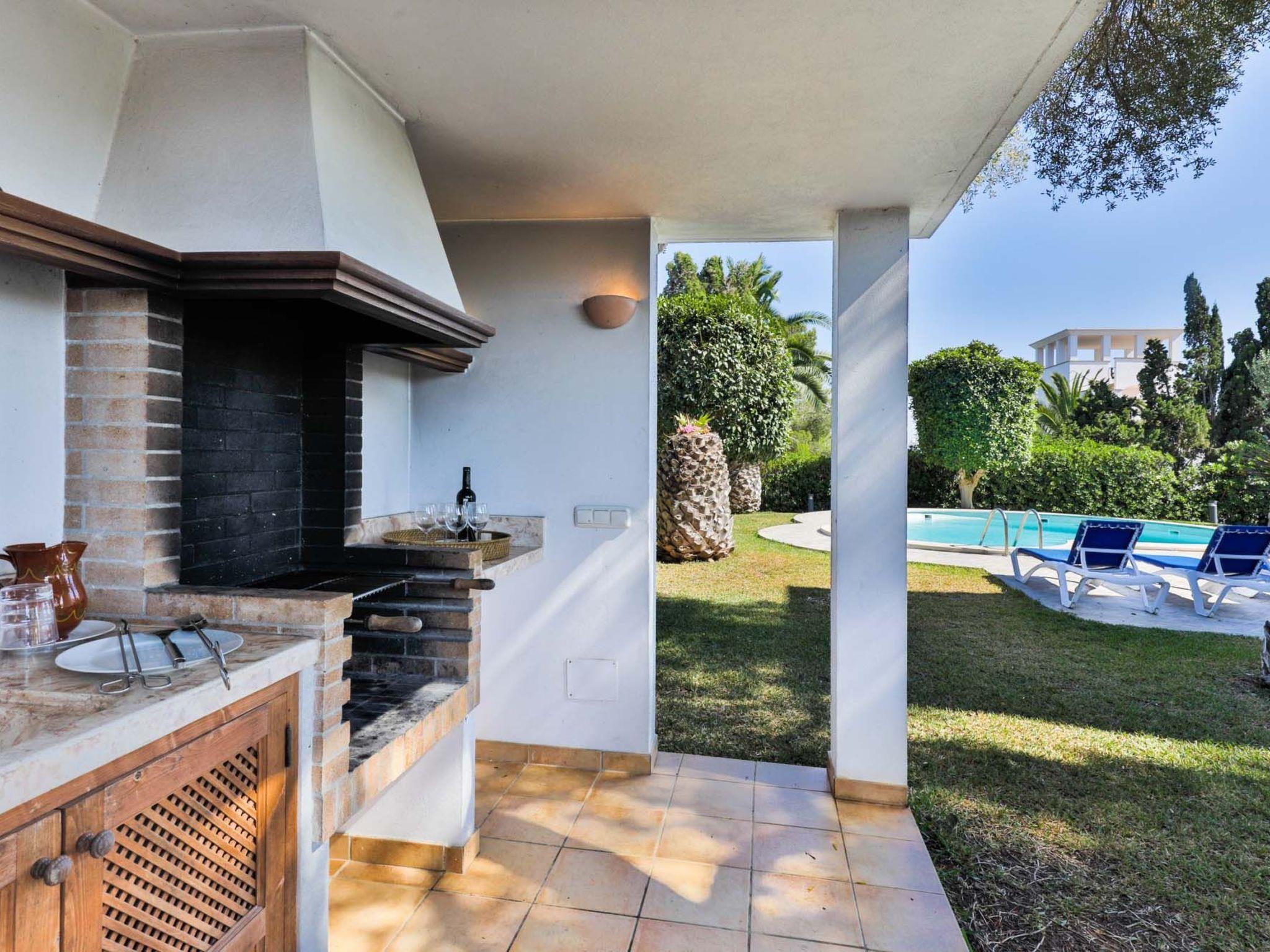 The villa is surrounded by a fairytale garden. Colourful flowers, palm trees, pine trees and the Bougenvillea plants are a feast for the eyes. The large round pool, surrounded by sun loungers and with a large parasol, completes the immaculate outdoor area. There is also a covered barbecue area and a shower with WC.