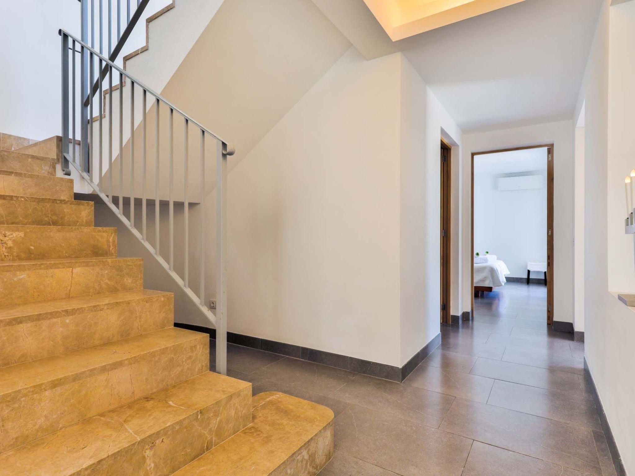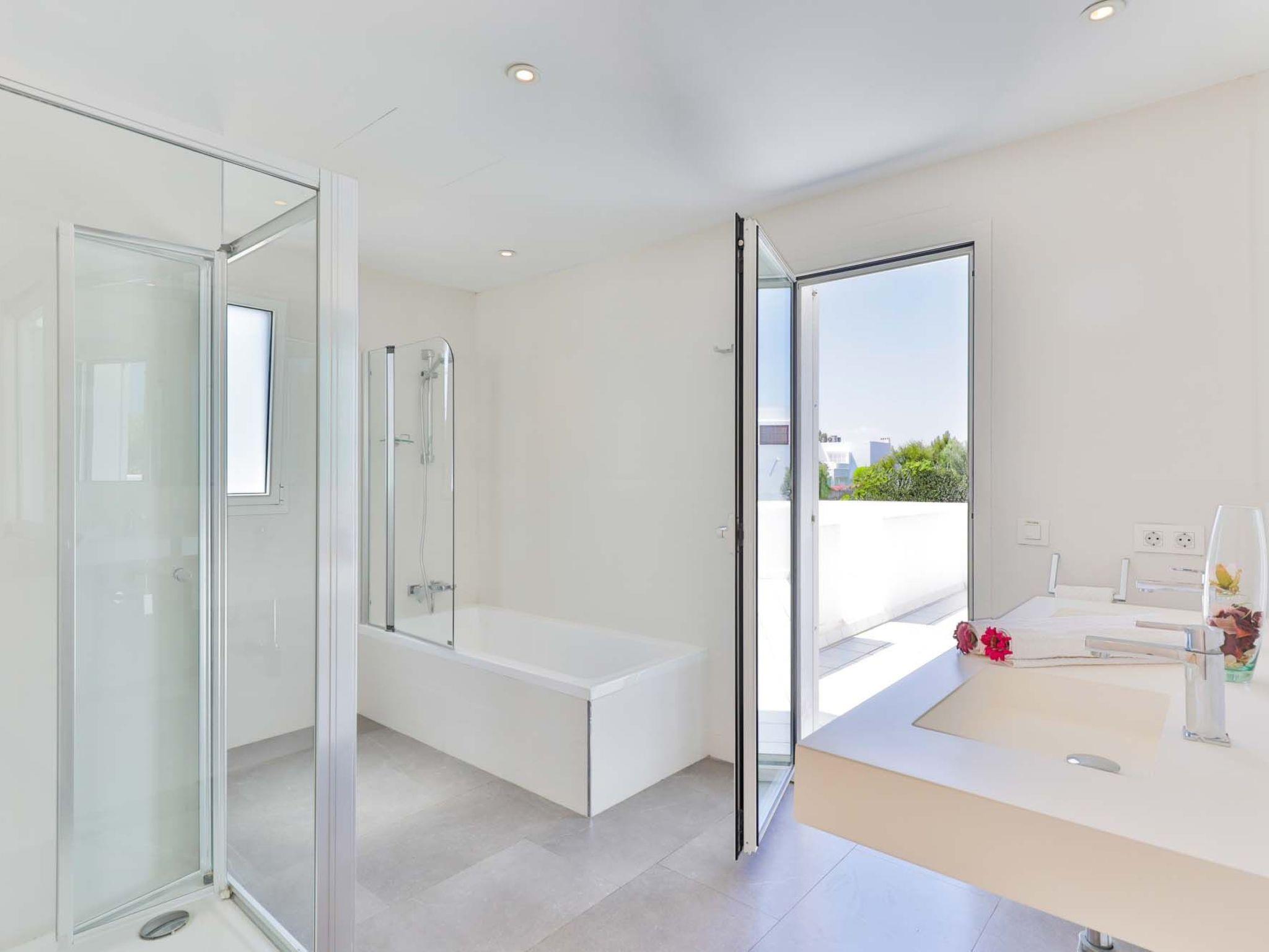 On the upper floor there are 2 double bedrooms, each with an en-suite bathroom. One of these, the master bedroom, is a dream come true with its 2x2 metre four-poster bed and en-suite bathroom with bath, shower and 2 washbasins. The second bedroom, with en-suite shower room, has a beautiful terrace. The sun roof terrace offers a fantastic view of the large round pool and the showpiece garden with mature trees, as well as the Mediterranean Sea.
