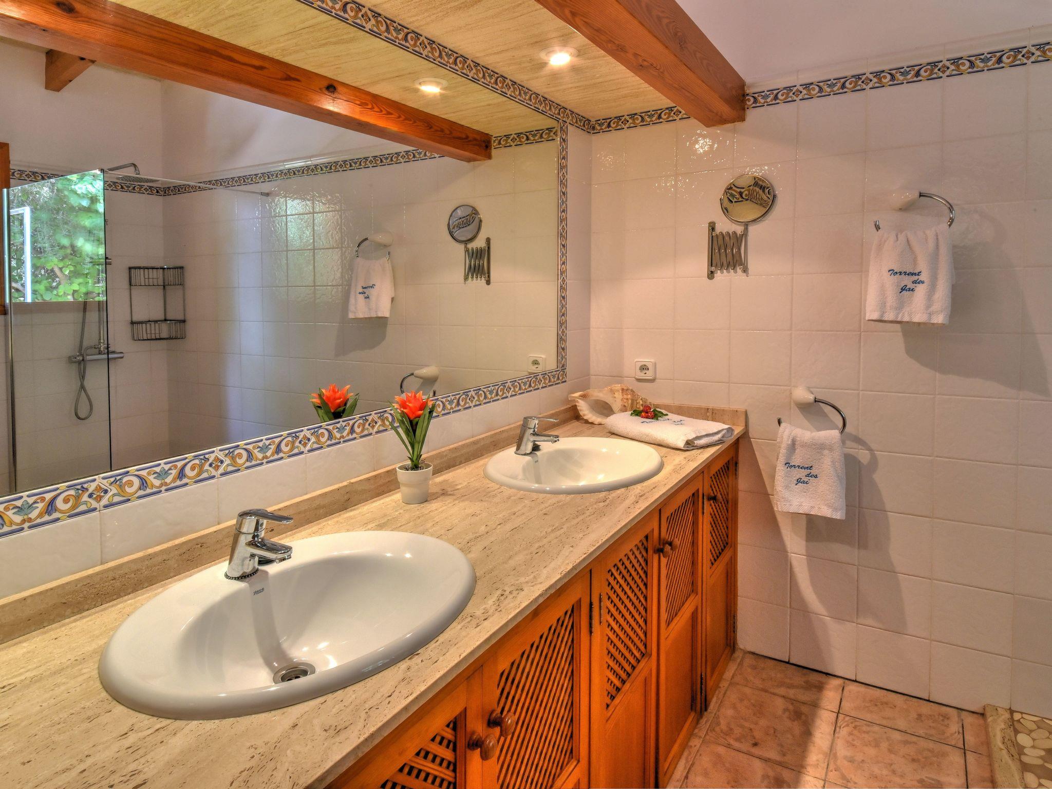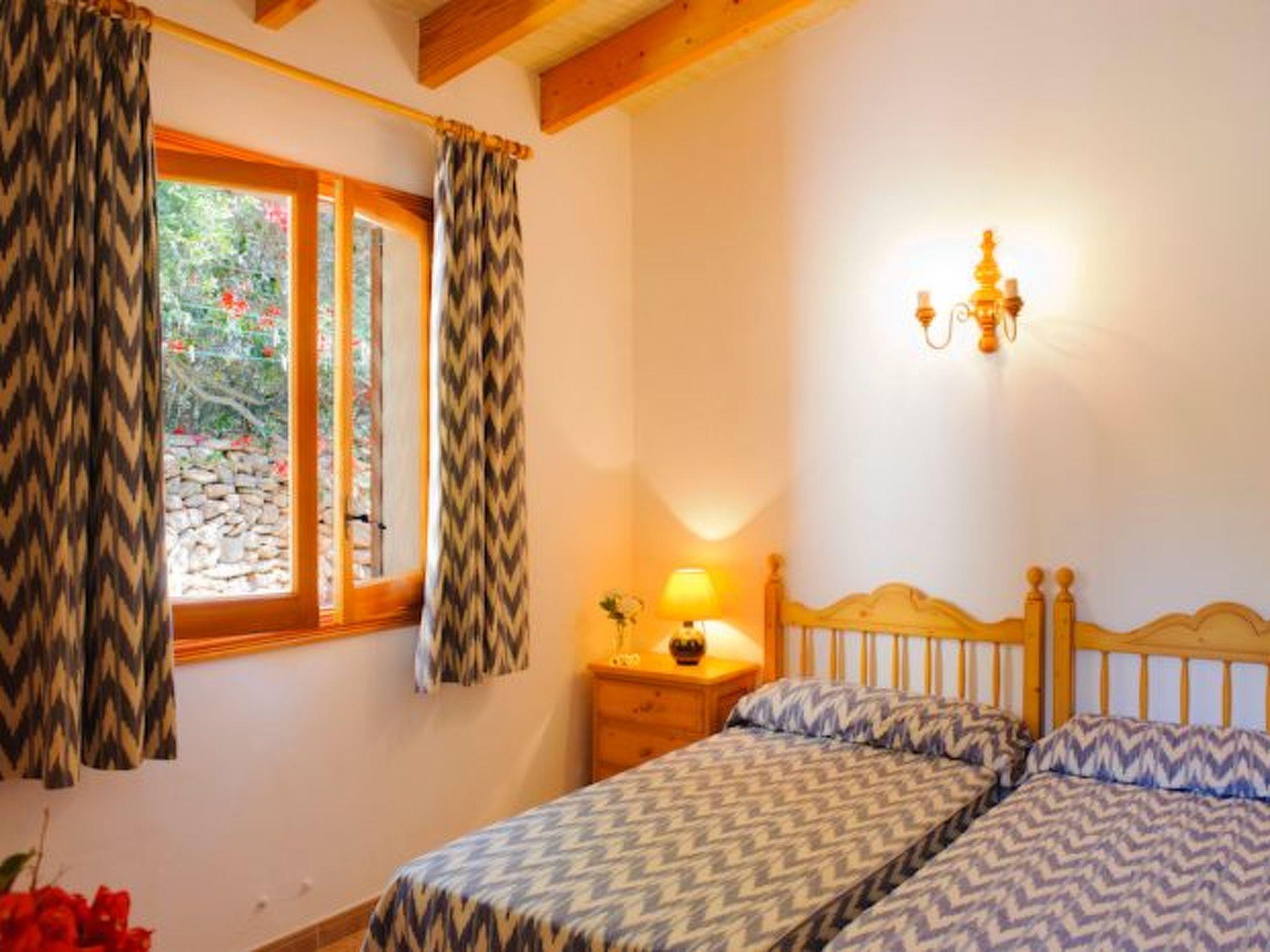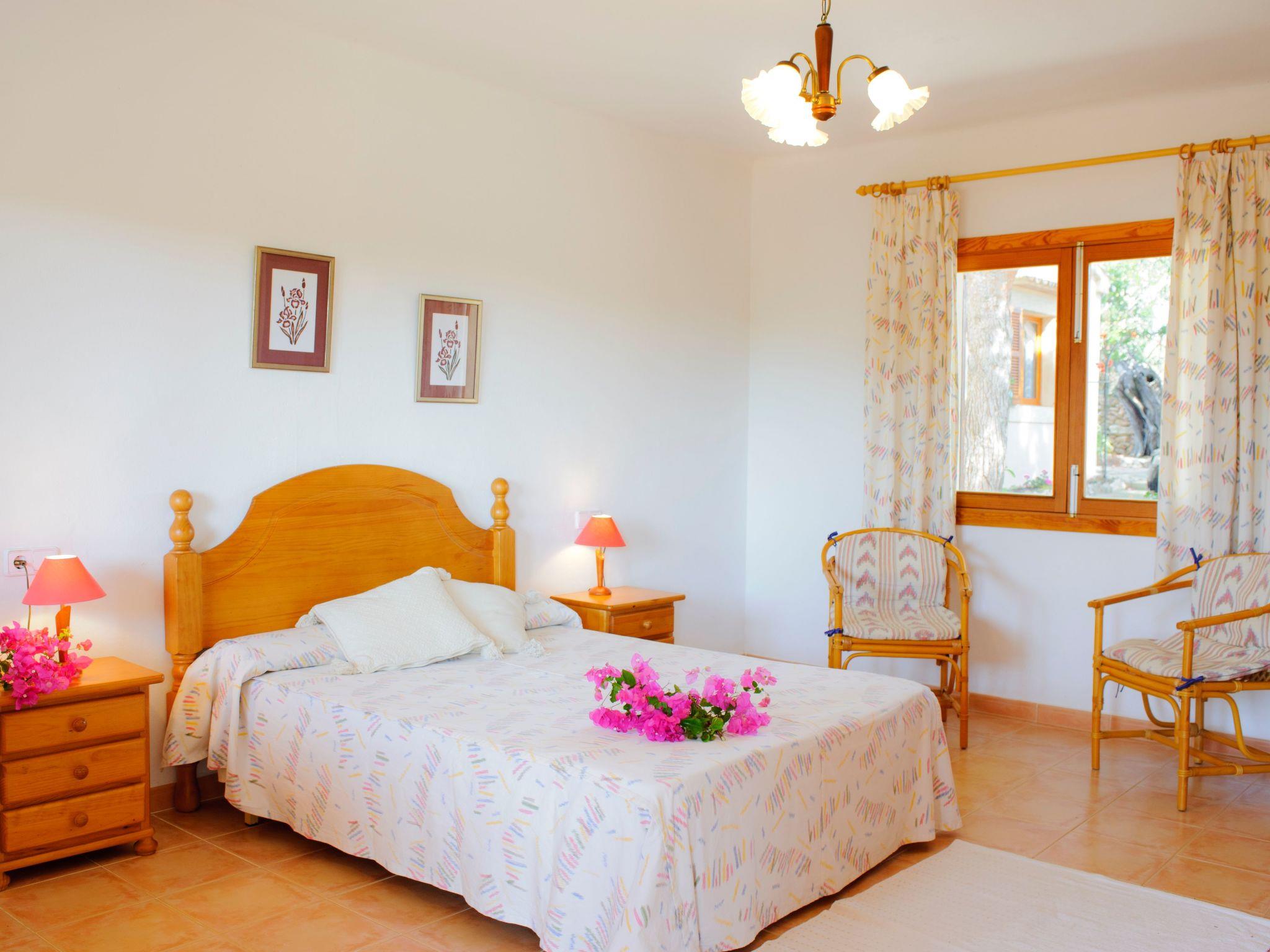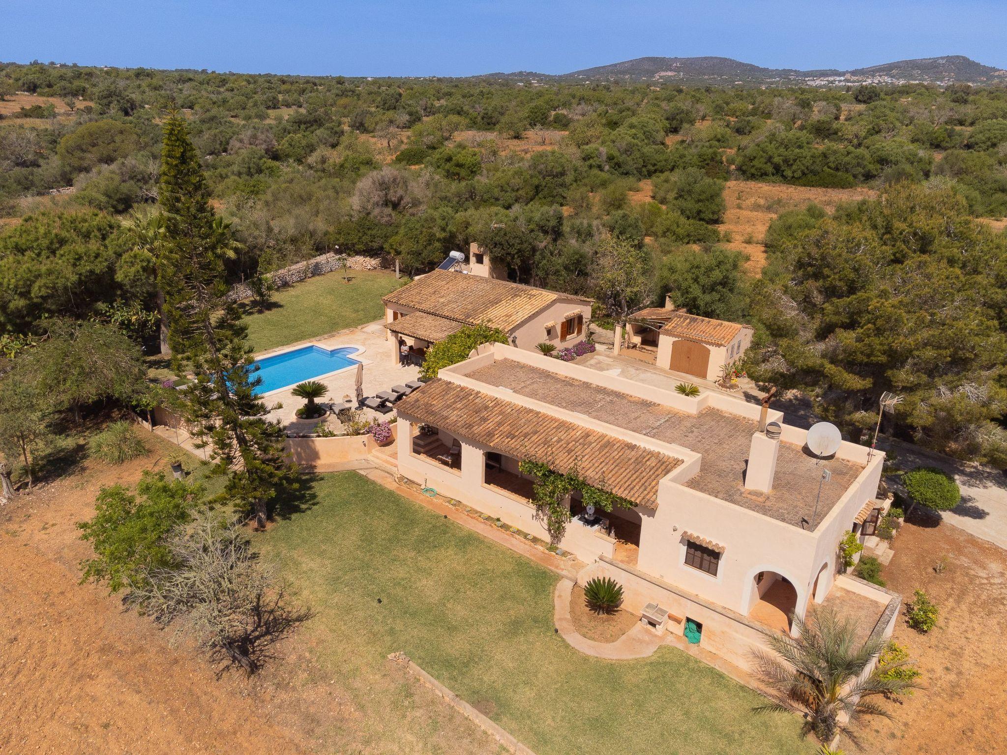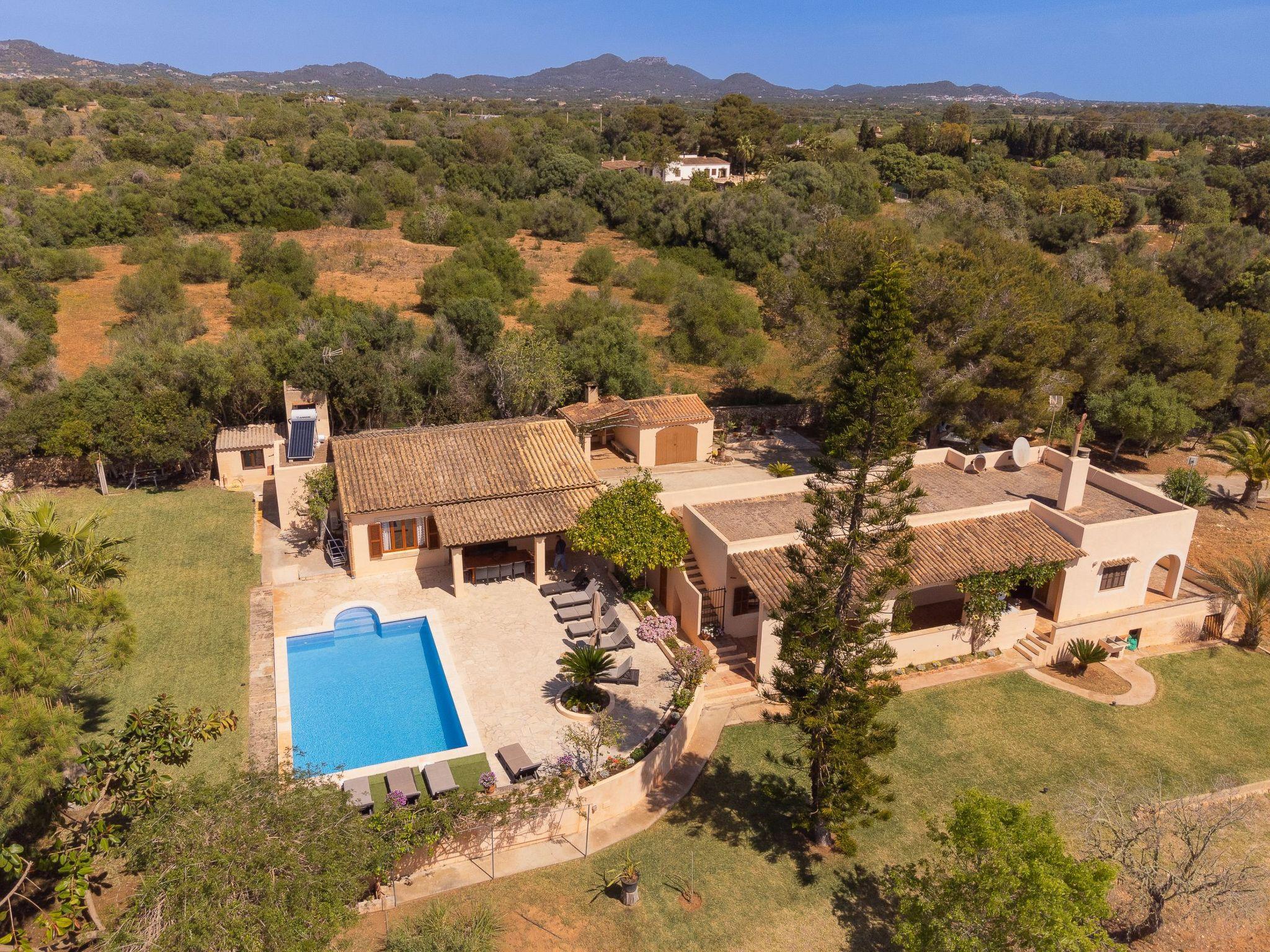 The finca is made up of two separate houses and is therefore ideal for large families and groups who like to holiday together but want to enjoy a certain degree of independence. The main house has a beautiful traditionally furnished living/dining area with vaulted ceilings and the American kitchen directly connected to it. In the main house there are two bedrooms with en suite bathrooms, one with a double bed and the other with two single beds. From the living/dining area you have access to the covered terrace and the pool. Here you can enjoy meals in the open air.