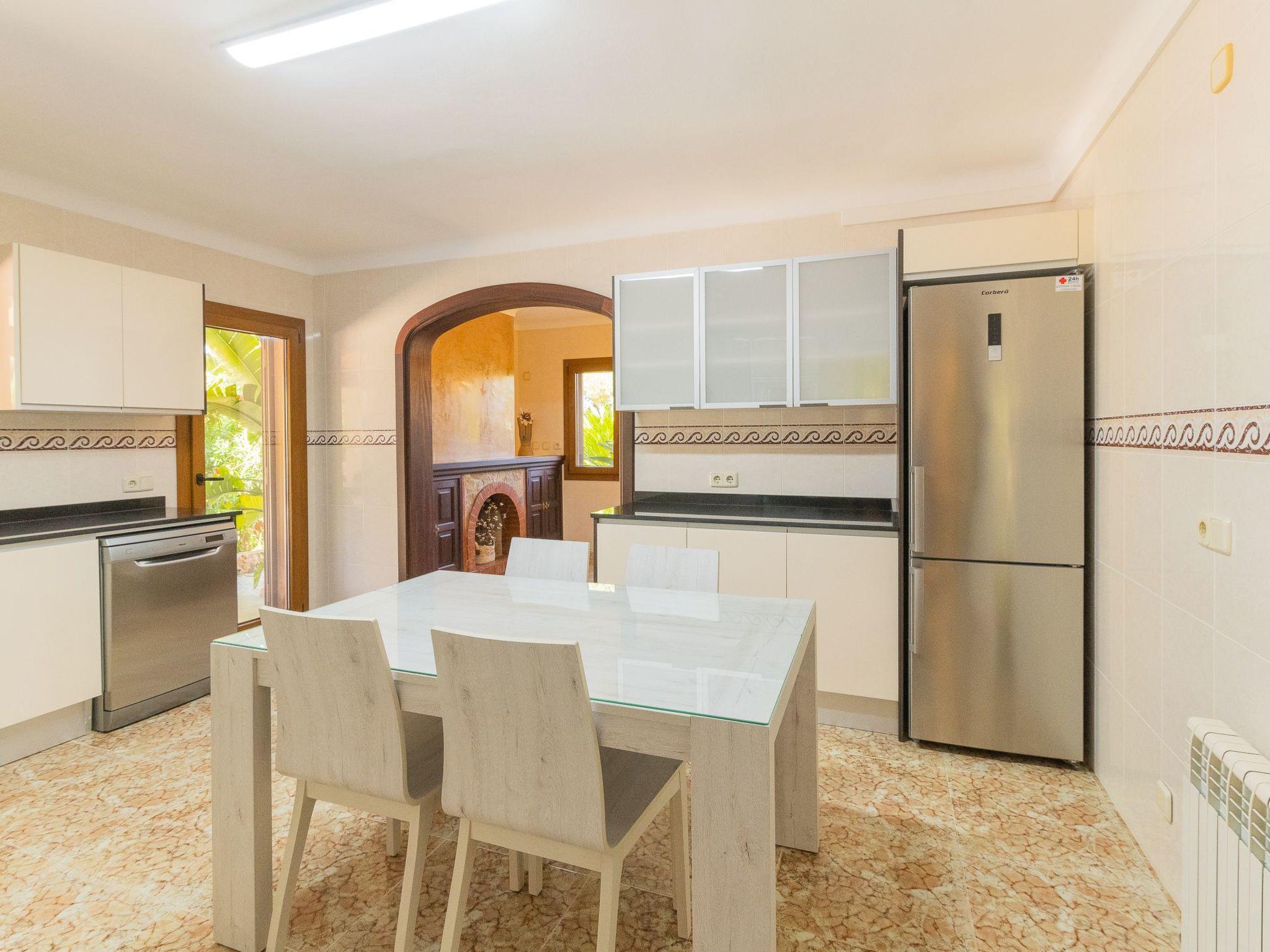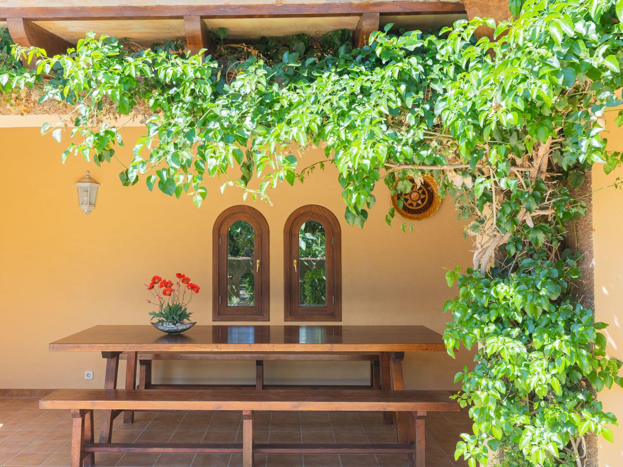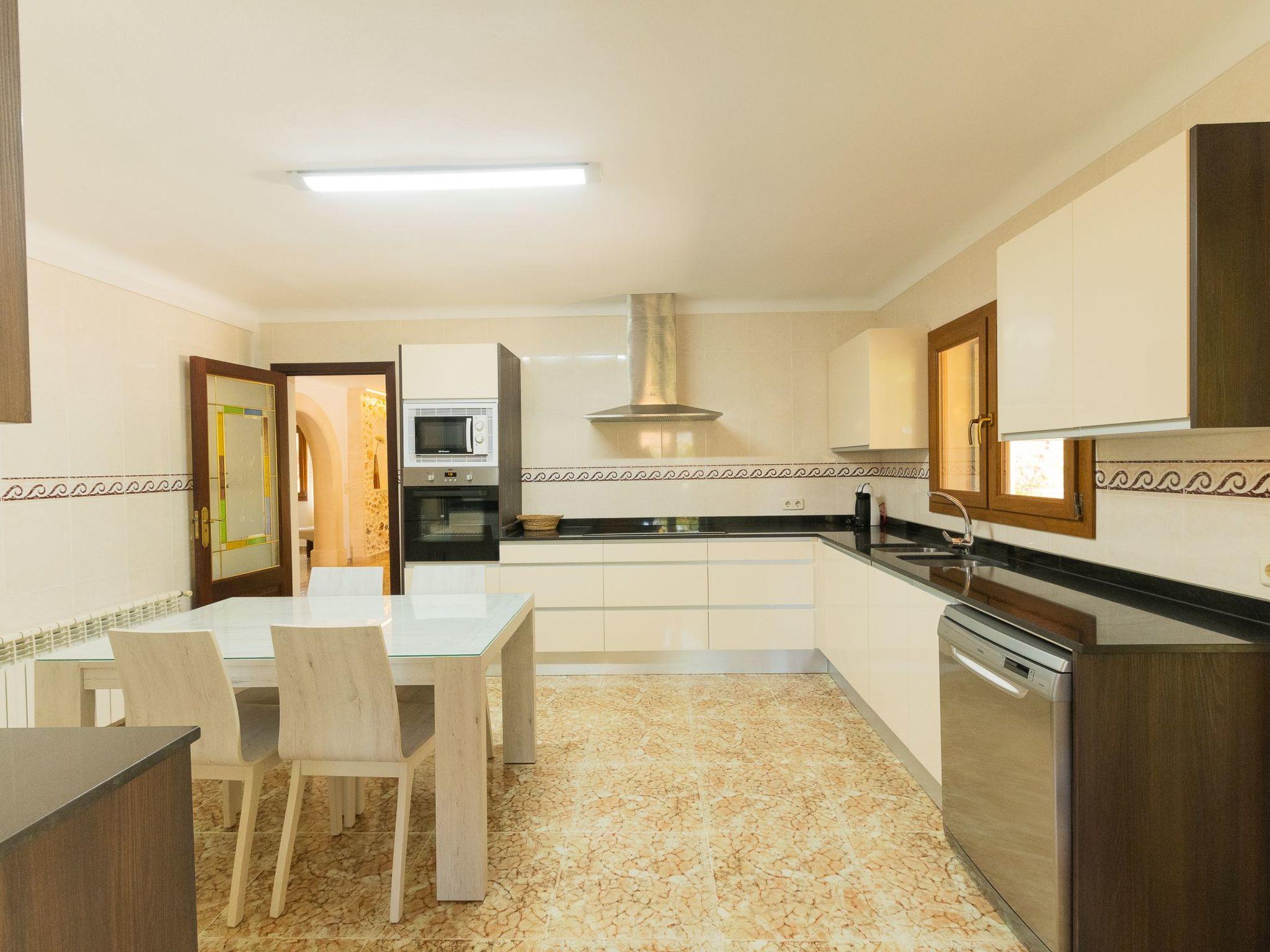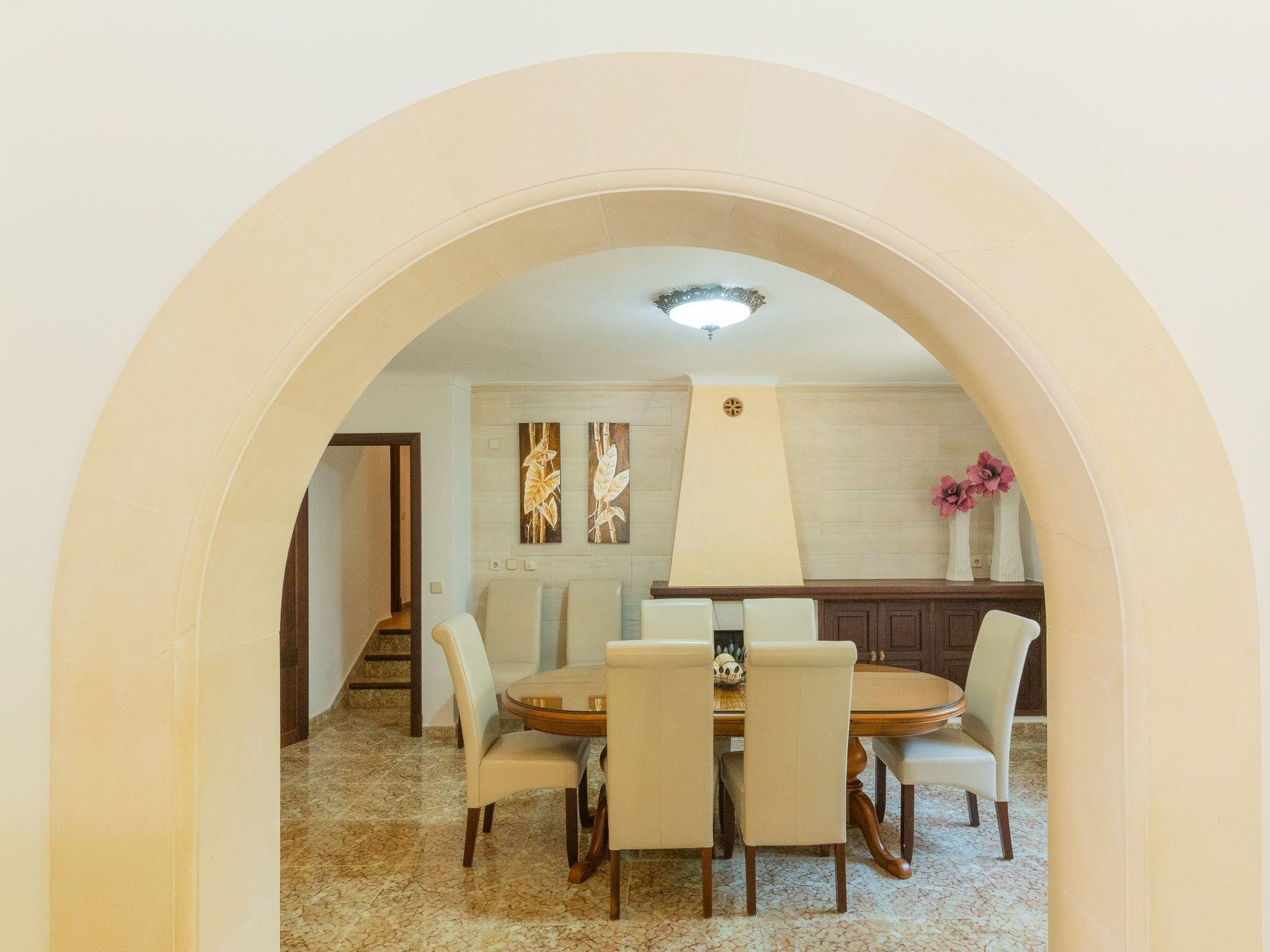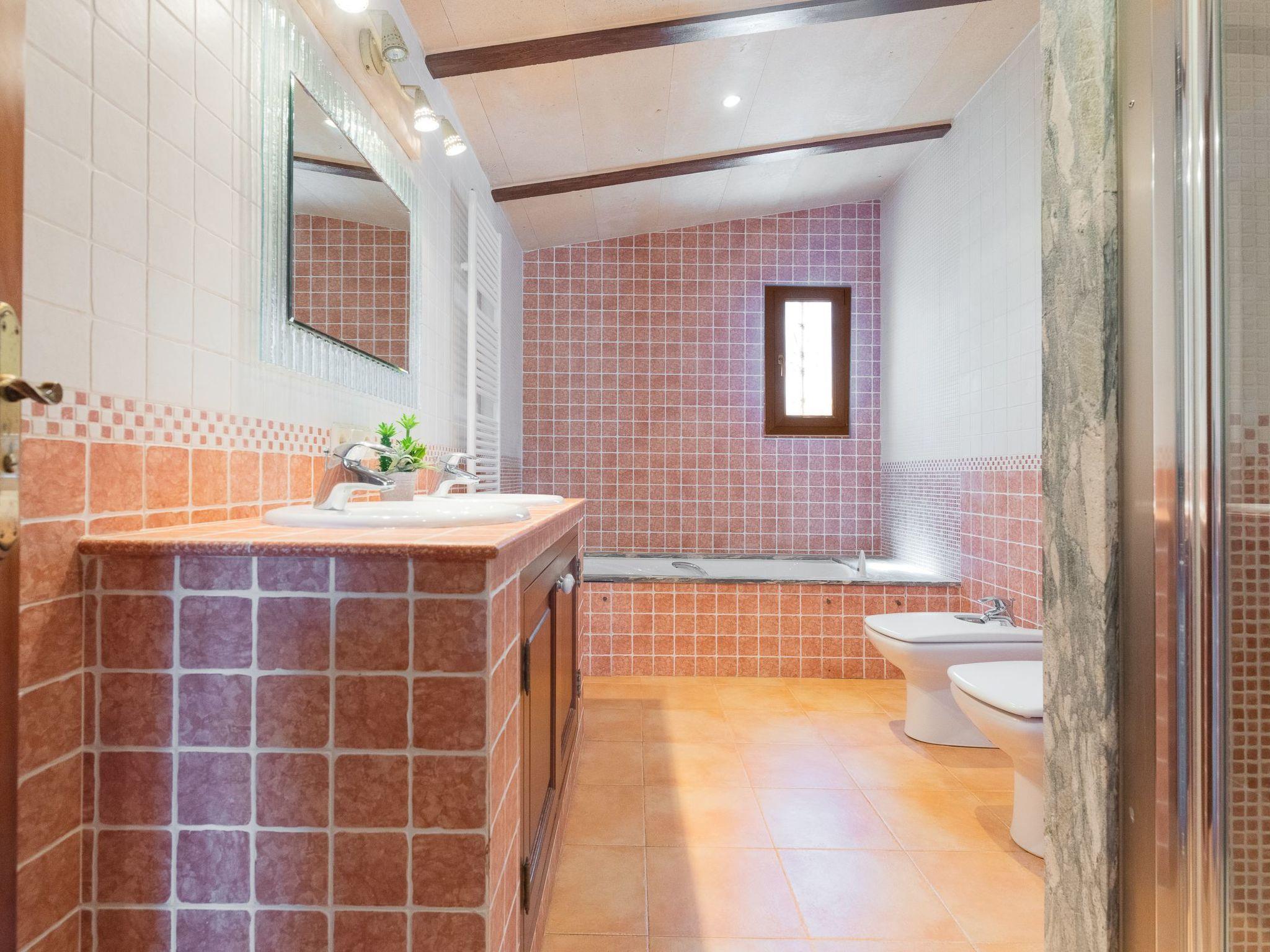 Casa Jardi is a beautiful two-storey country house in classic style with spacious rooms. The outside area is very spacious with a large garden with lawn and tall palm trees. From the main entrance, the entrance hall leads to the lower level with guest toilet and spacious living room with access to the covered terrace overlooking the pool. Next to the living room is the dining room. On the other side is the kitchen with a breakfast table and access to the pool area. The ground floor has two bedrooms; the master bedroom with a nice rustic touch, double bed, en-suite bathroom with bathtub and access to the outside. Close to this bedroom is the laundry room, which also has access to the outside. The second bedroom has two single beds and an en-suite shower room. From the entrance, a staircase leads to the first floor where there are three bedrooms; one with a double bed, en suite bathroom with bathtub and French doors leading to a partially covered terrace with stunning views of the surrounding area and pool area. The other two bedrooms each have two single beds and an en suite shower room. These bedrooms have access to the terrace from the hallway.