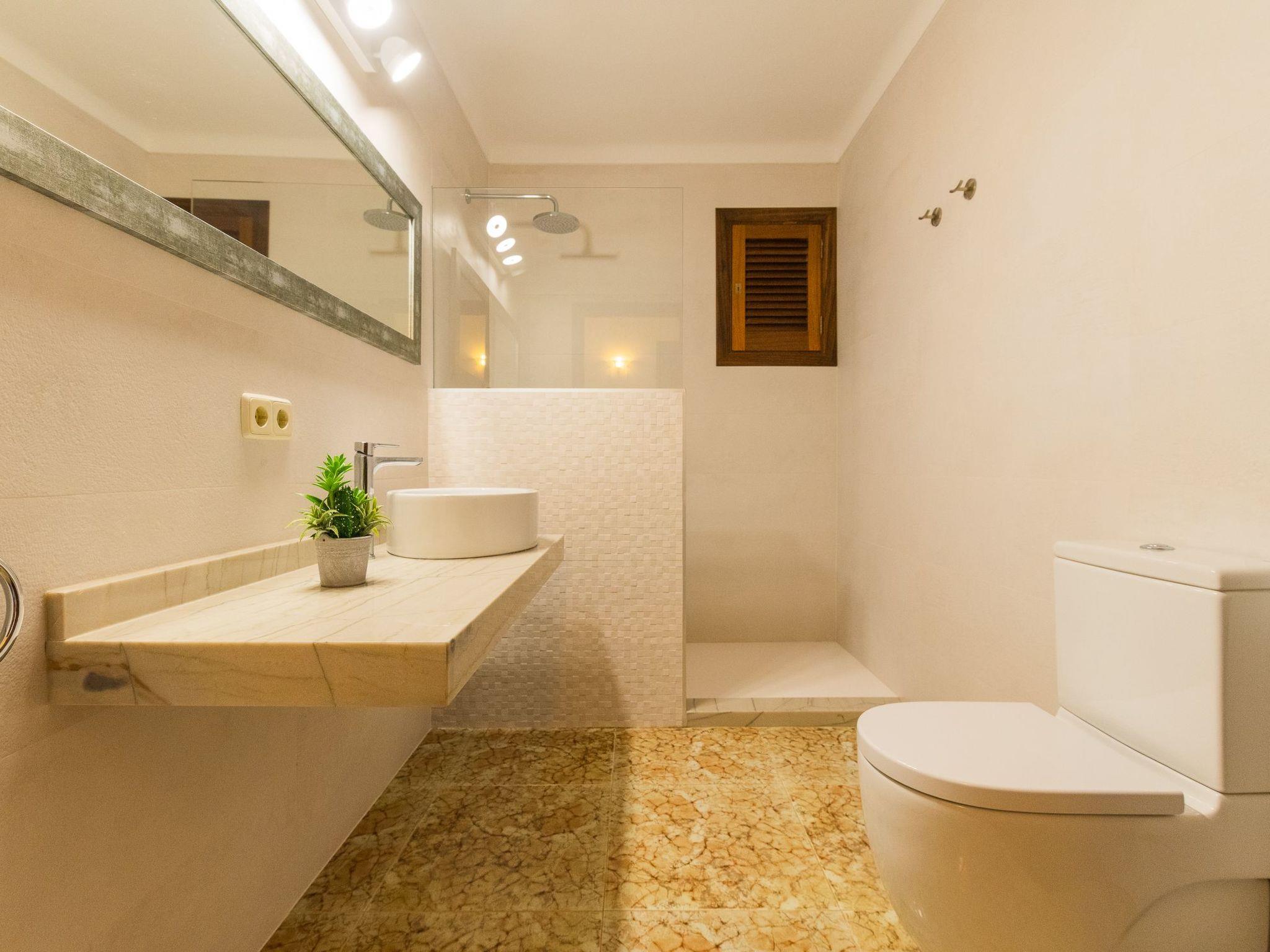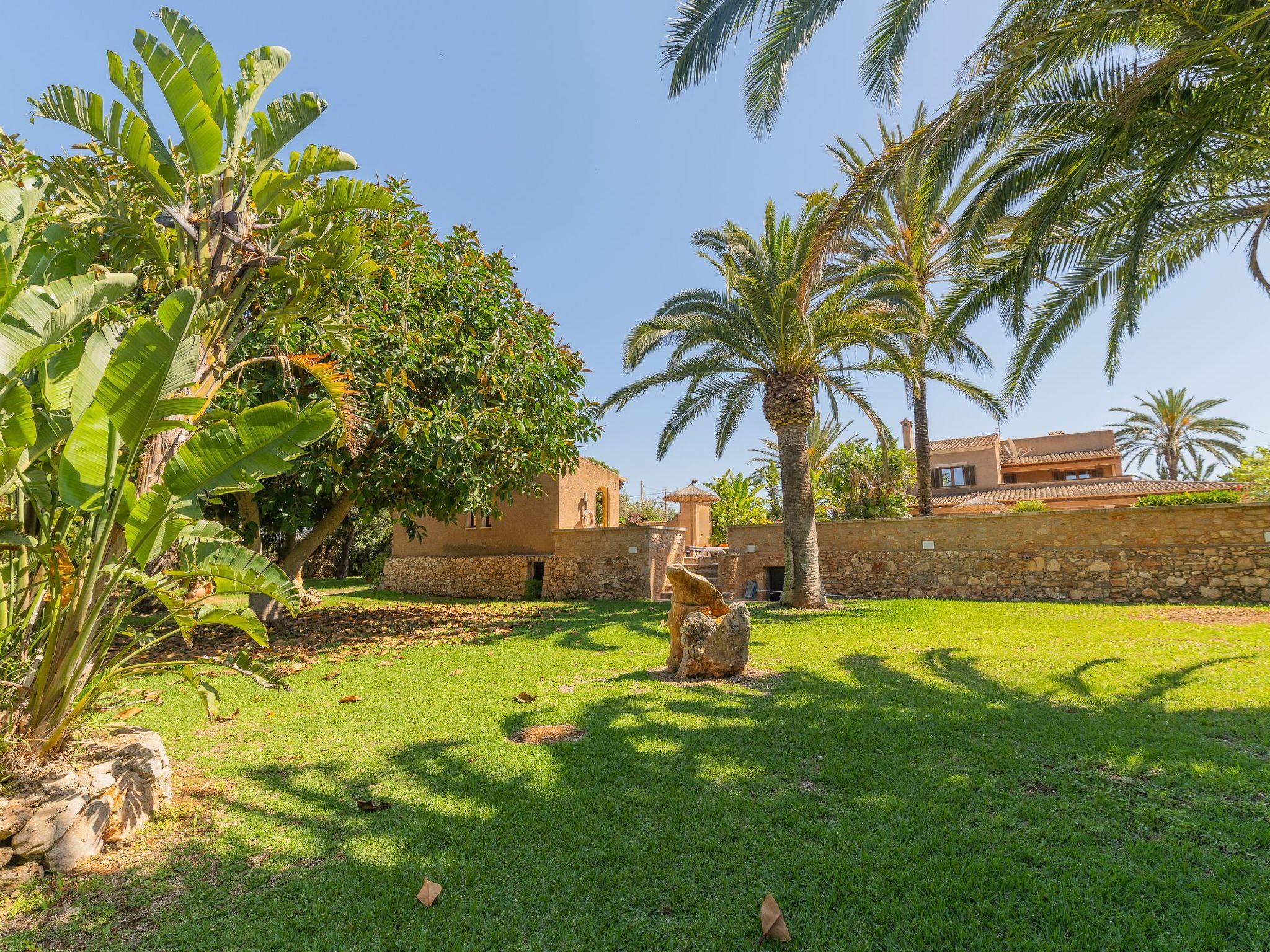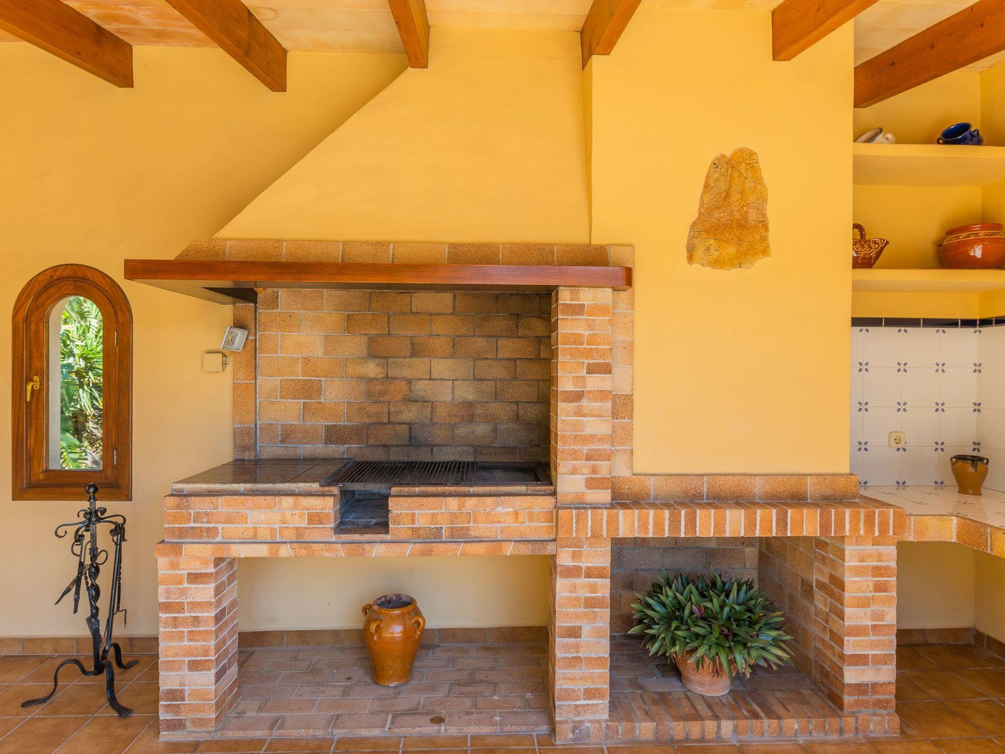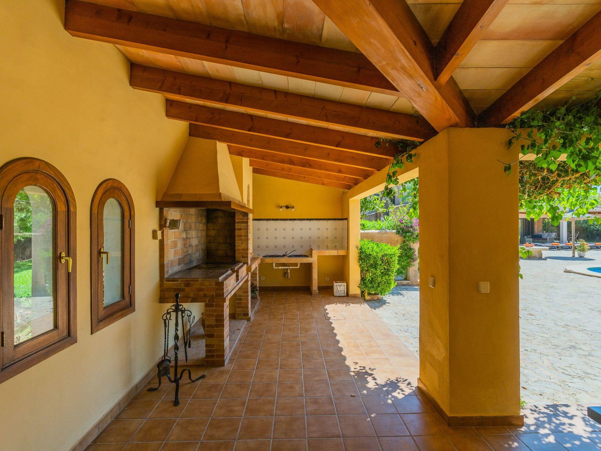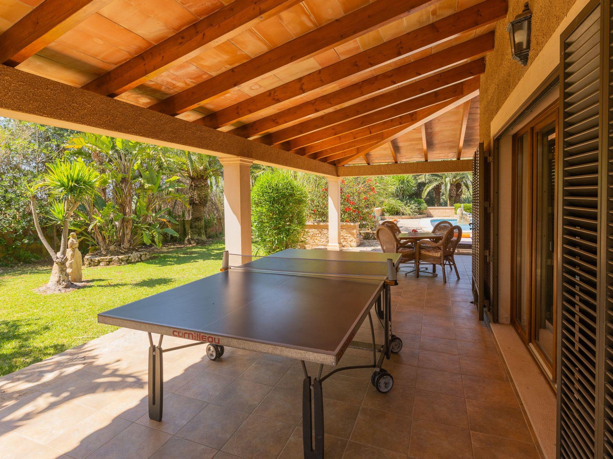 Casa Jardi is a beautiful two-storey country house in classic style with spacious rooms. The outside area is very spacious with a large garden with lawn and tall palm trees. From the main entrance, the entrance hall leads to the lower level with guest toilet and spacious living room with access to the covered terrace overlooking the pool. Next to the living room is the dining room. On the other side is the kitchen with a breakfast table and access to the pool area. The ground floor has two bedrooms; the master bedroom with a nice rustic touch, double bed, en-suite bathroom with bathtub and access to the outside. Close to this bedroom is the laundry room, which also has access to the outside. The second bedroom has two single beds and an en-suite shower room. From the entrance, a staircase leads to the first floor where there are three bedrooms; one with a double bed, en suite bathroom with bathtub and French doors leading to a partially covered terrace with stunning views of the surrounding area and pool area. The other two bedrooms each have two single beds and an en suite shower room. These bedrooms have access to the terrace from the hallway.