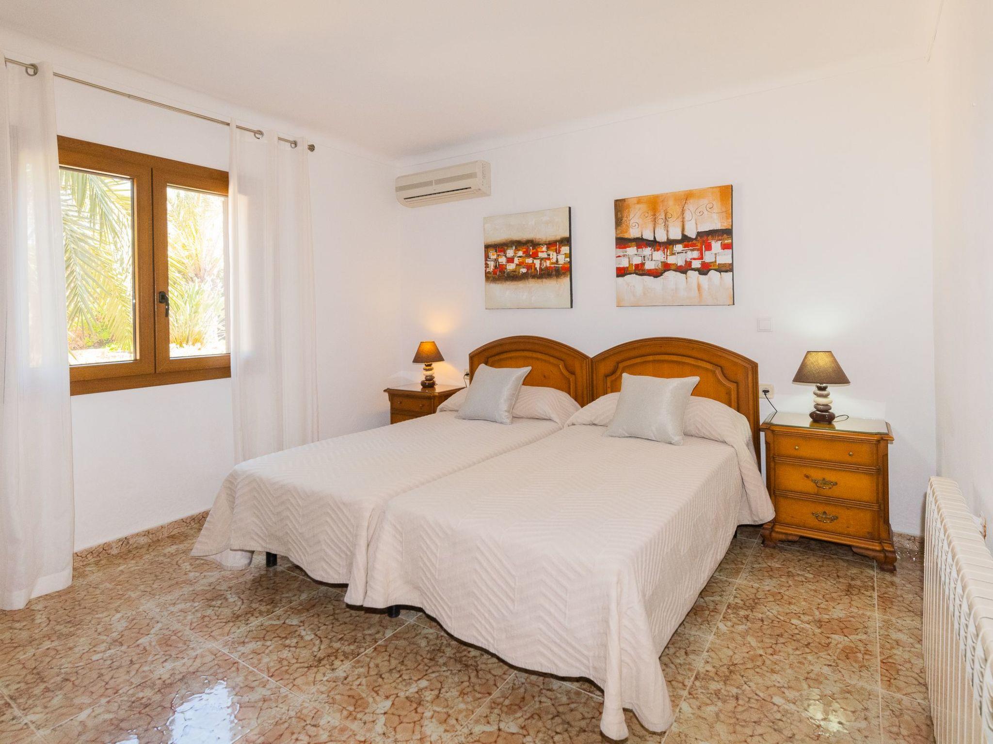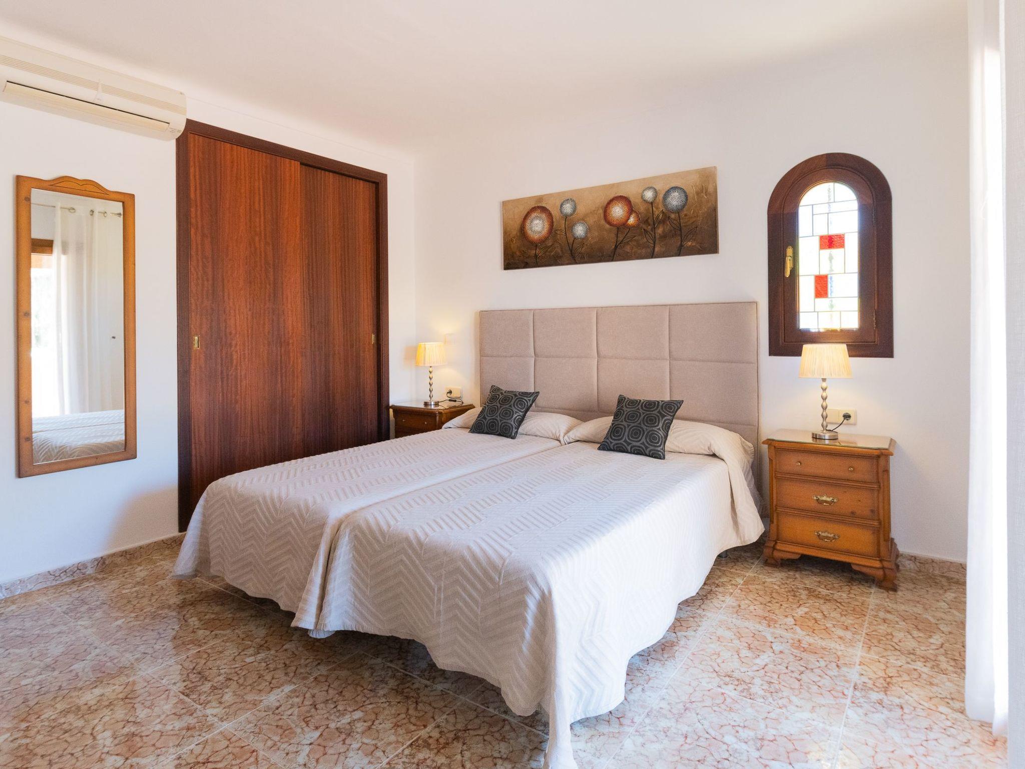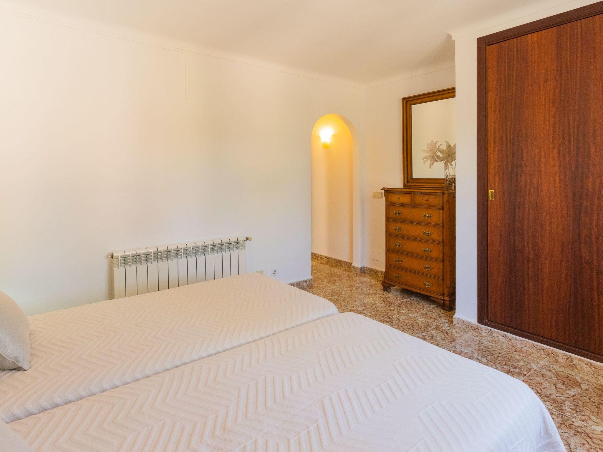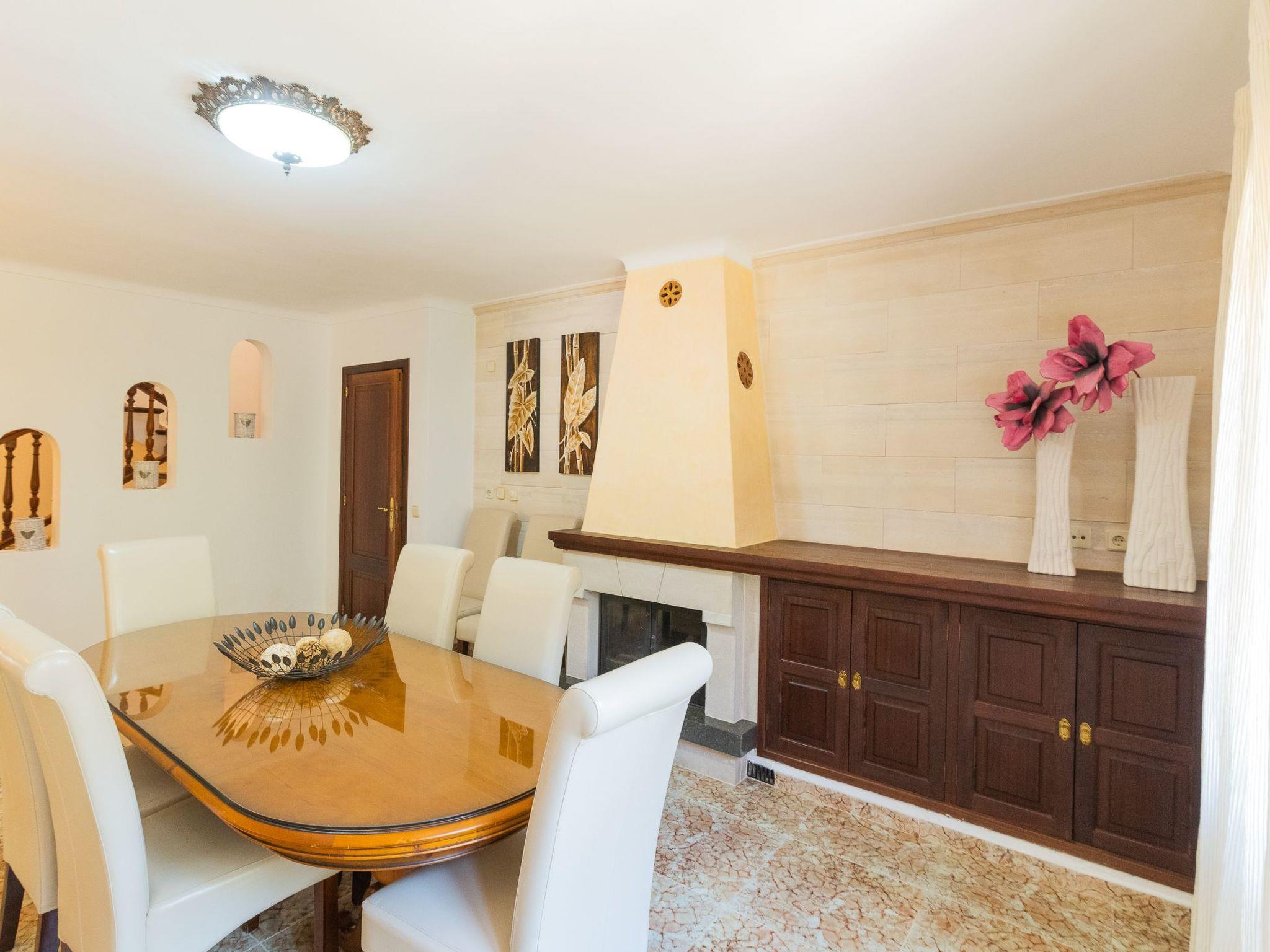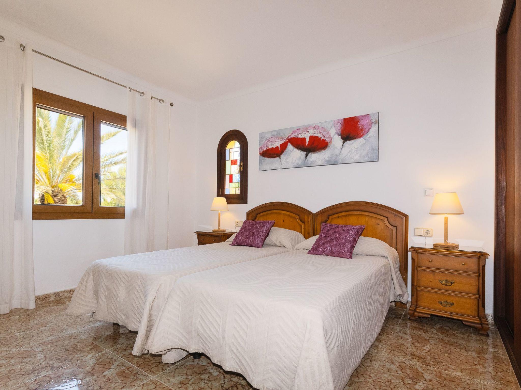 Casa Jardi is a beautiful two-storey country house in classic style with spacious rooms. The outside area is very spacious with a large garden with lawn and tall palm trees. From the main entrance, the entrance hall leads to the lower level with guest toilet and spacious living room with access to the covered terrace overlooking the pool. Next to the living room is the dining room. On the other side is the kitchen with a breakfast table and access to the pool area. The ground floor has two bedrooms; the master bedroom with a nice rustic touch, double bed, en-suite bathroom with bathtub and access to the outside. Close to this bedroom is the laundry room, which also has access to the outside. The second bedroom has two single beds and an en-suite shower room. From the entrance, a staircase leads to the first floor where there are three bedrooms; one with a double bed, en suite bathroom with bathtub and French doors leading to a partially covered terrace with stunning views of the surrounding area and pool area. The other two bedrooms each have two single beds and an en suite shower room. These bedrooms have access to the terrace from the hallway.