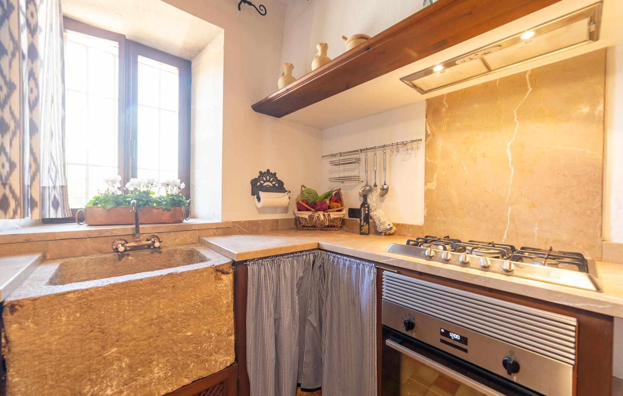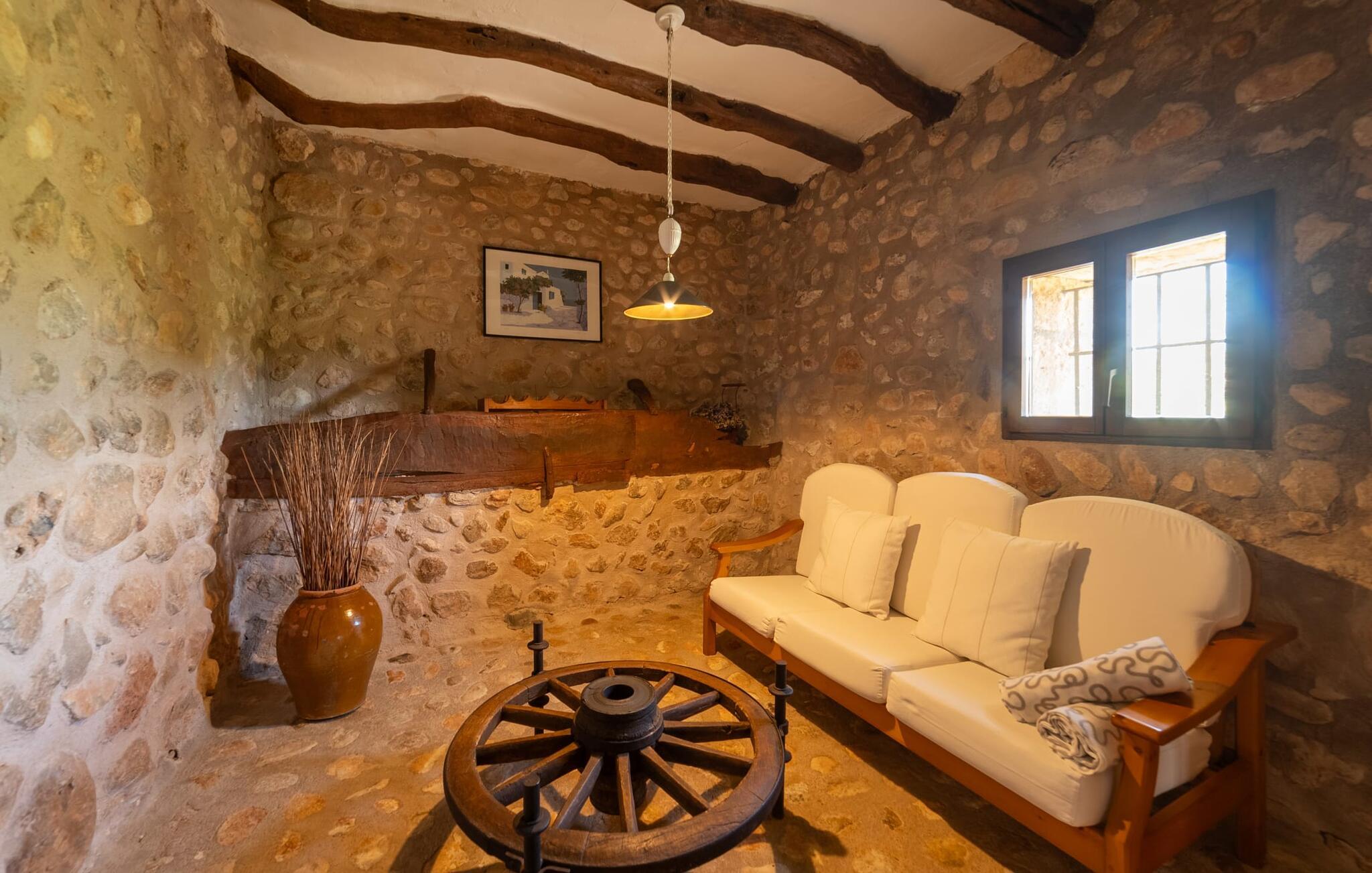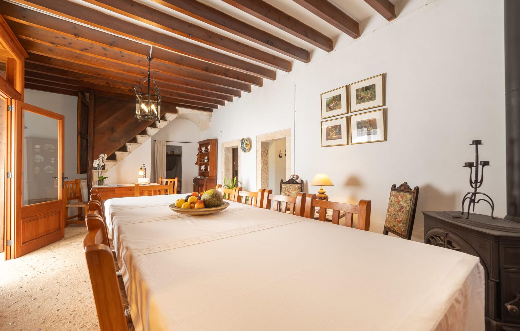 Schon beim Betreten des mallorquinischen Hauses herrscht eine sehr behagliche Atmosphäre und wer Authentizität und traditionellen Charme liebt, wird sofort begeistert sein. Viel Naturstein, dicke Wände, klassische Sichtbalkendecken und spanische Dekorationen tragen zu diesem individuellen Flair bei, in dem Sie sich schnell wie zu Hause fühlen werden. Sie können noch immer die jahrhundertealte Mühle und den ehemaligen Futtertrog sehen! Im Erdgeschoss befinden sich ein Schlafzimmer und zwei Badezimmer (eines davon en-suite) sowie ein elegantes Esszimmer, in dem Sie drinnen umgeben von Natursteinmauern speisen können. In der originalen, alten Küche finden Sie einen angenehmen Platz am Kamin – hier können Sie einen romantischen Abend zusammensitzen und in die knisternden Flammen blicken. In der anderen Küche können Sie Ihre Mahlzeiten zubereiten und verfügen über eine komplette Ausstattung, sodass Sie sich problemlos weiter selbst versorgen können. Das Steinwaschbecken ist ein echter Hingucker! Direkt neben der beeindruckenden Getreidemühle befindet sich ein weiterer großer Esstisch, an dem jeder bequem Platz findet. In der obersten Etage befindet sich ein Wohnzimmer mit einem weiteren Kamin. Hier können Sie fernsehen, ein gutes Buch lesen oder sich gut unterhalten. Darüber hinaus befinden sich auf dieser Etage drei Schlafzimmer und ein drittes Badezimmer. Das Schlafzimmer bietet tolle Entspannungszonen im klassischen Design für die Nacht oder für eine Siesta; Insgesamt stehen Ihnen ein 1,50 x 1,90-Bett und vier 0,90 x 1,90-m-Betten zur Auswahl.