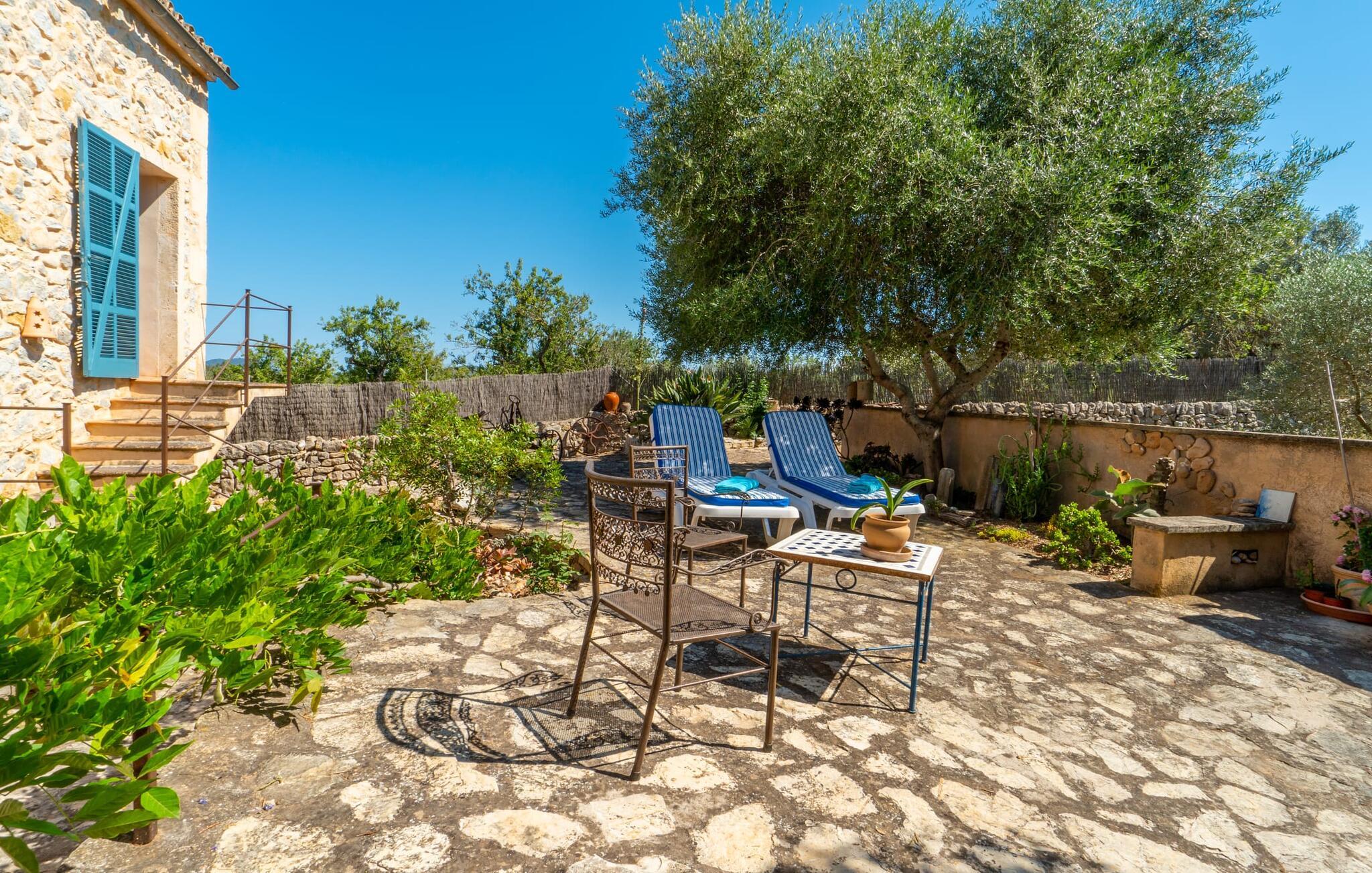 Ein absolut bezauberndes Ambiente empfängt die Gäste in der Villa „Ses Velletes“. Das Anwesen liegt herrlich idyllisch und ruhig, ist komplett umzäunt und durch ein Tor zur Einfahrt hin abgeschlossen. Auf dem weitläufigen Grundstück, geprägt von Rasenflächen und vielen mediterranen Pflanzen, finden Sie hübsche, offene und überdachte Terrassen mit vielfältigen Blumen und Gestaltungsdetails, die zum Entdecken und Entdecken einladen. Liebevoll arrangierte Sitzmöglichkeiten laden zum genussvollen Entspannen und Verweilen im Freien ein, während Sie immer wieder auf der Suche nach neuen Lieblingsplätzen sind. Der rustikale Esstisch mit gemauerten Bänken eignet sich zu jeder Tageszeit für gesellige Mahlzeiten, die man gemütlich und mit herrlichem Blick in den Garten genießen kann. Wenn Sie möchten, können Sie das Essen auch einfach in der Außenküche zubereiten und direkt hier genießen. Auf dem Grill können Sie allerlei frische regionale Köstlichkeiten zubereiten und vielleicht alle gemeinsam einen kulinarischen Grillabend feiern. Kleine Nischen, Treppen und Mauern verleihen dem Außenbereich ein besonders malerisches und heimeliges Flair. Der niedliche Teich beherbergt sogar Schildkröten. Herzstück des Gartens ist der 7 x 4 m große Pool, geschmückt mit dekorativen hellblauen Fliesen und ausgestattet mit einem bequemen Treppeneinstieg. Hier finden Groß und Klein eine angenehme Erfrischung nach Herzenslust. Für ausgiebiges Sonnenbaden stehen bequeme Liegen zur Verfügung, sowie mehrere Sonnenschirme, falls die UV-Strahlen zu stark werden. Einfach nichts tun und die Sorgen hinter sich lassen – das können Sie hier auf außergewöhnliche Weise genießen.