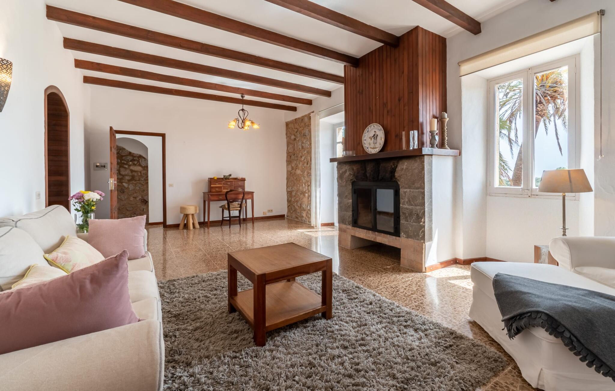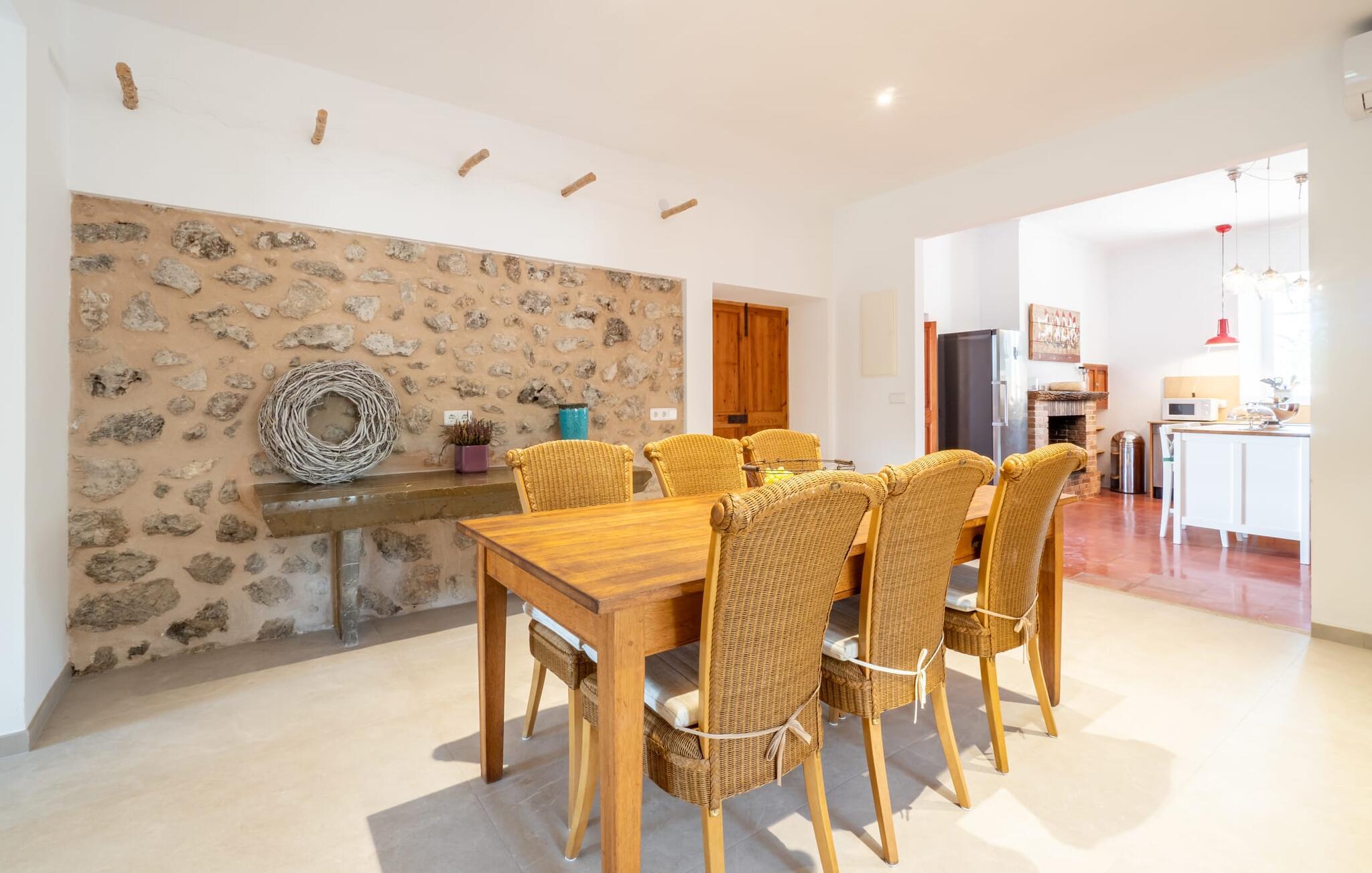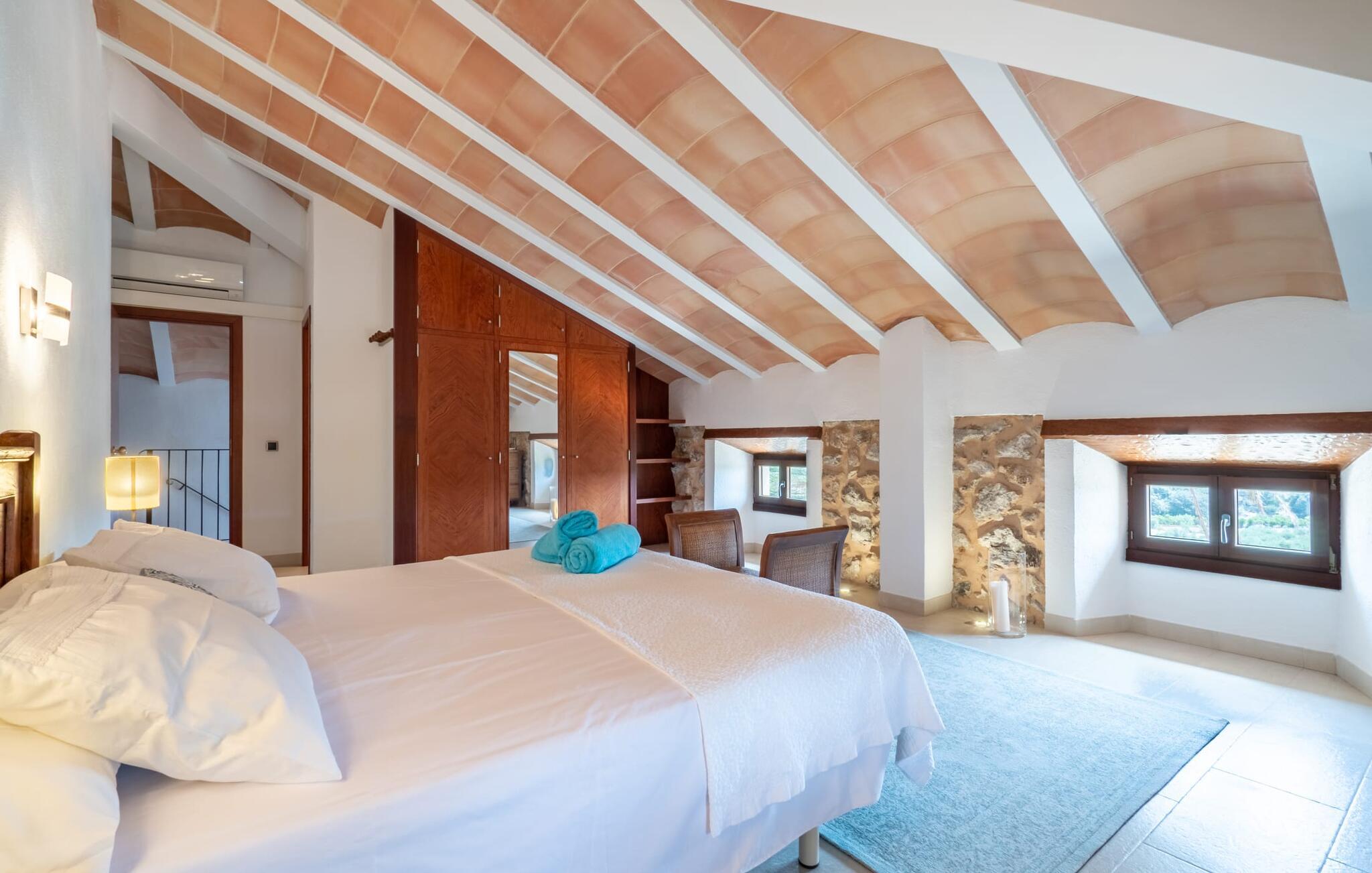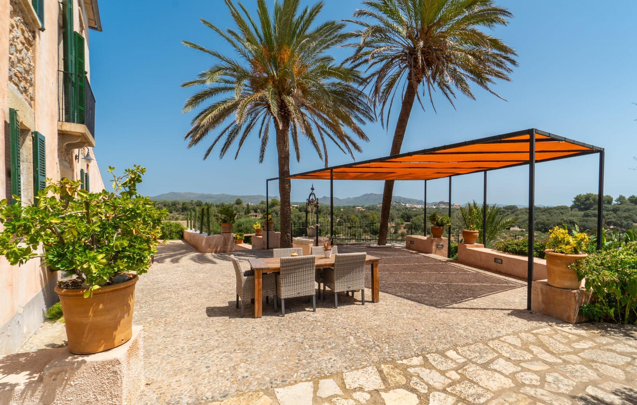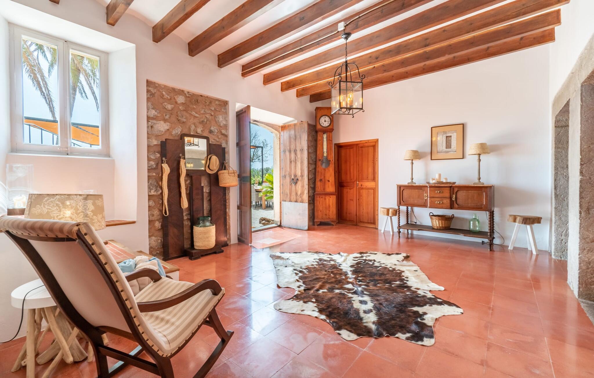 Zum Wohnen erwartet Sie ein wunderschön renoviertes Landhaus mit einer großzügig gestalteten Wohnfläche von 500 m². Das traditionelle Haus kann ganzjährig gemietet werden, was auch in den milden Herbst- und Wintermonaten preislich äußerst attraktiv ist. Das Haus verfügt nicht nur über zwei Kamine, sondern wird auch durch die Warm-Kalt-Klimaanlage jederzeit auf einer angenehmen Temperatur gehalten. Sie erleben modernsten Komfort und eine gelungene Raumaufteilung mit weitgehend offenem Grundriss. Verpackt ist dies in einer inspirierenden Mischung aus puristisch-klarem Landhausstil zwischen Tradition und Bohème. Sichtbare Bruchstein-, Terrakotta- und industriell anmutende Bodenbeläge, viel Holz und stilvoll zurückhaltende Dekoartikel verstärken die Wirkung. Das ist angenehm reduziert und verwöhnt auch Ästheten. Geschlafen wird auf insgesamt drei Ebenen. Drei Schlafzimmer befinden sich im Erdgeschoss, das vierte im Obergeschoss zusammen mit einem zweiten Lounge-Wohnzimmer; Zwei Dachgeschossstudios mit gemütlicher Hanglage bestätigen die hohe Qualität. Darüber hinaus verfügen alle sechs Schlafzimmer entweder über ein eigenes Badezimmer oder eine direkt zuordenbare begehbare Dusche oder Badewanne. Unser Fazit: „Son Caminals“ ist das Äquivalent der Perfektion in einem mallorquinischen Ferienhaus. Besser geht es nicht! Das prächtige Bauernhaus „Son Caminals“ ist ein renoviertes Anwesen, das auf den sanften Hügeln rund um Artà thront. Von dem hervorragend ausgestatteten Ferienhaus in angenehm ruhiger Lage erreichen Sie sehr schnell das mittelalterliche Dorf, das Einkaufsmöglichkeiten in der Fußgängerzone, auf dem beliebten Dienstagsmarkt sowie gute Restaurants und lokale Cafés bietet. In nur 12 Autominuten erreichen Sie die Bucht von Alcúdia, die 16 km Strände bietet, darunter Son Serra de Marina und Colònia de Sant Pere.