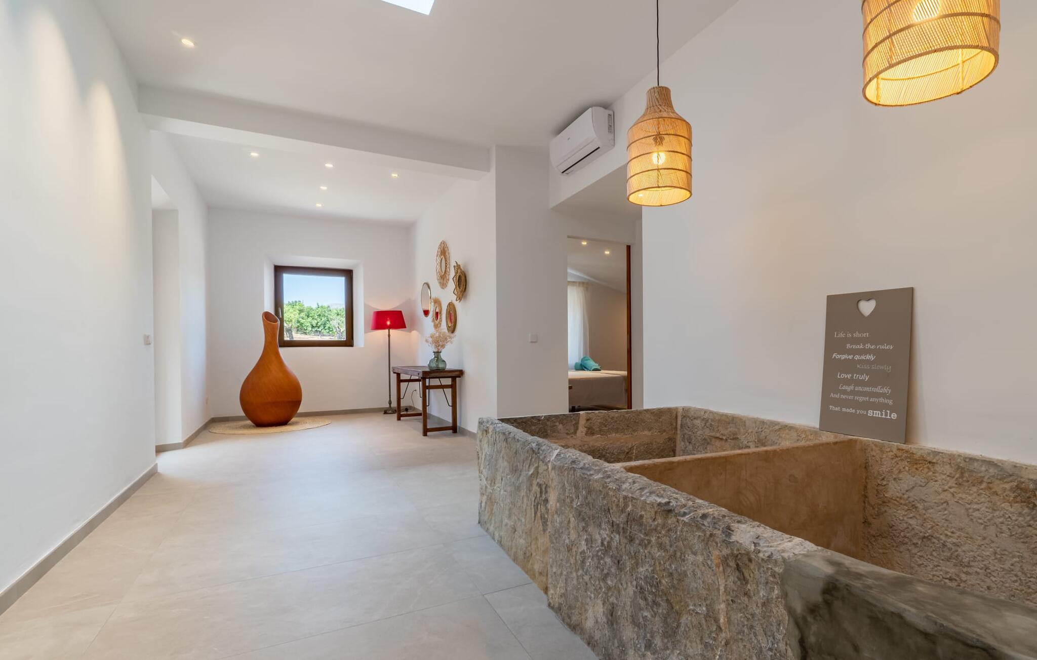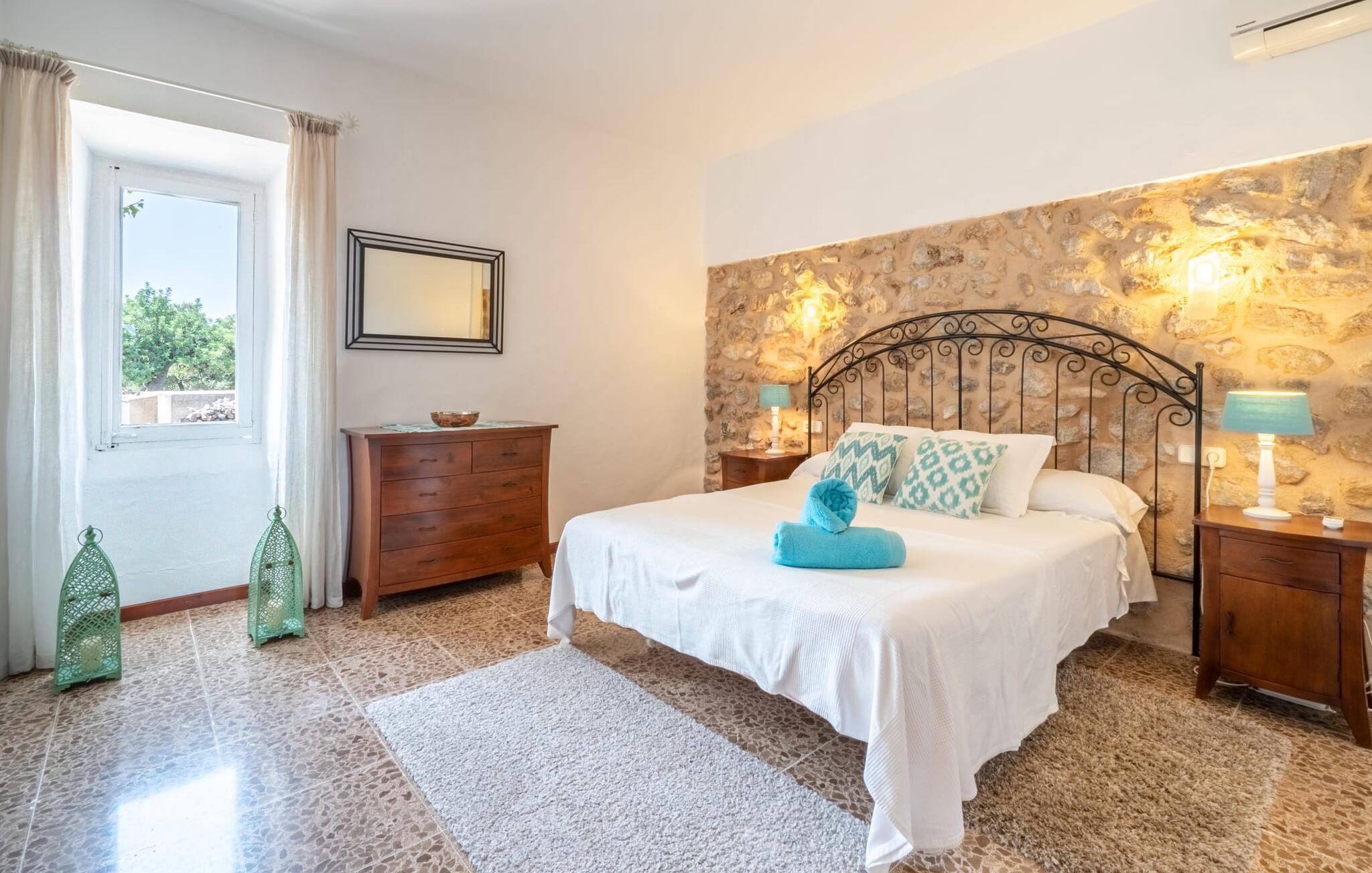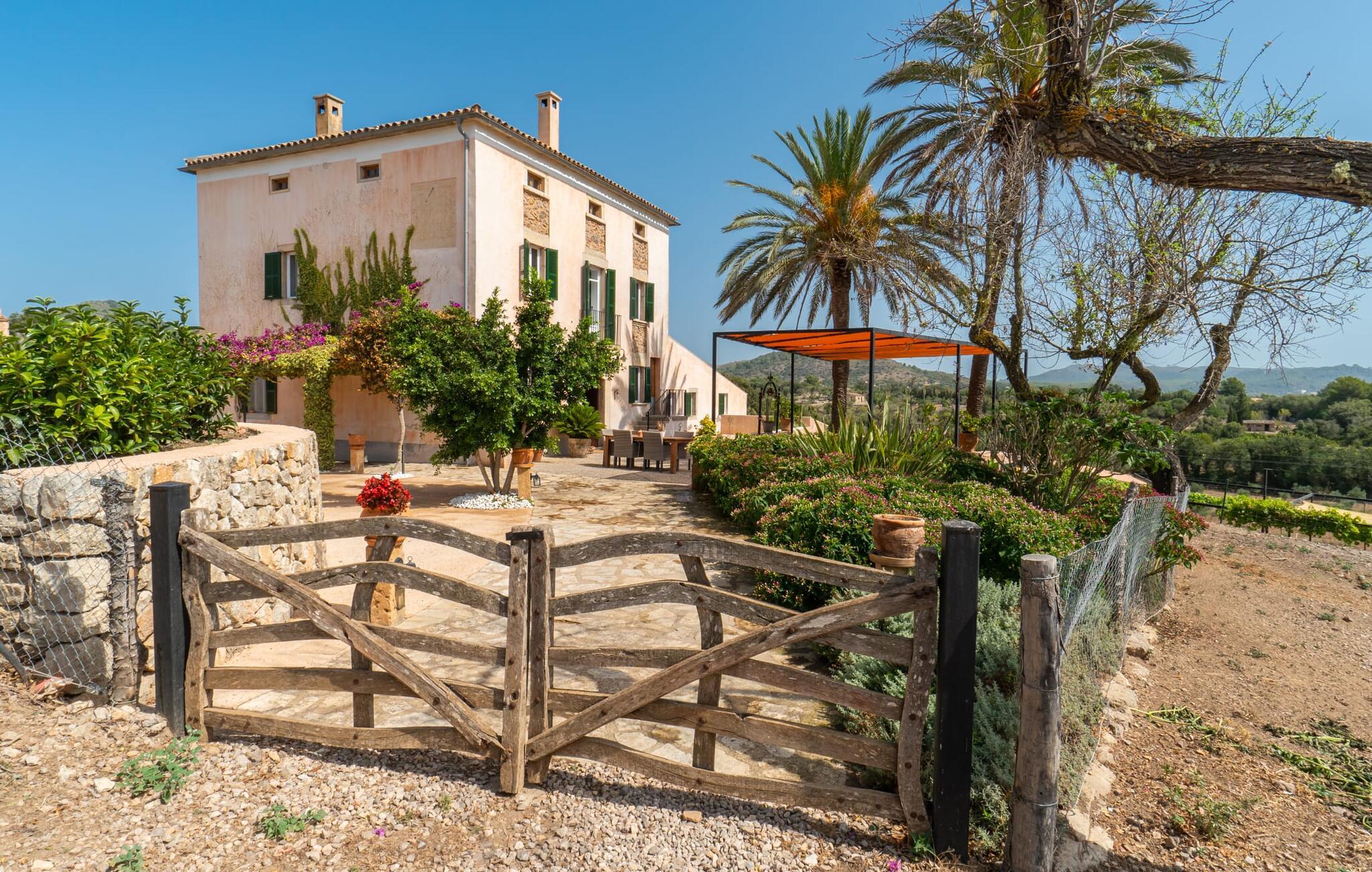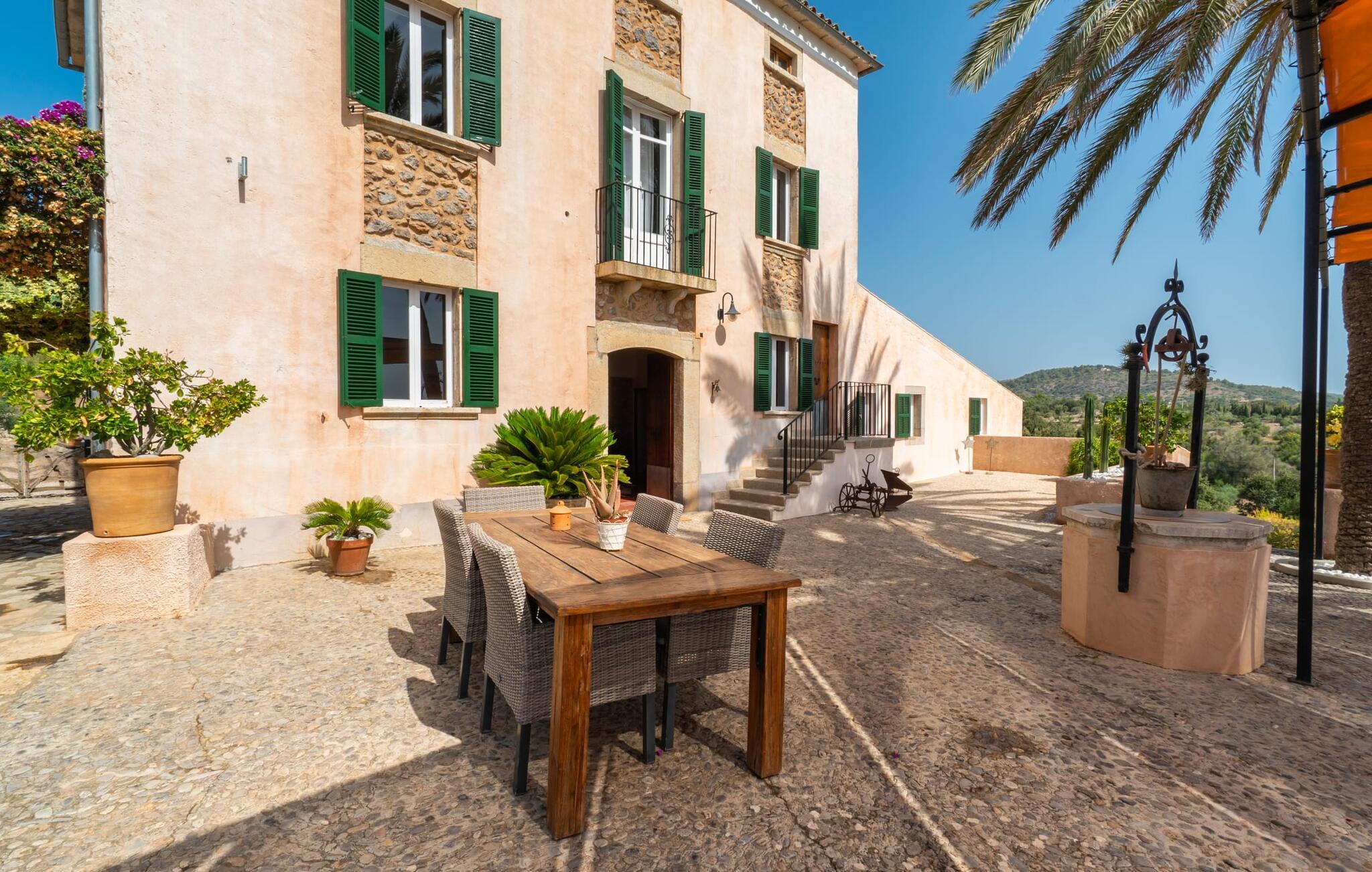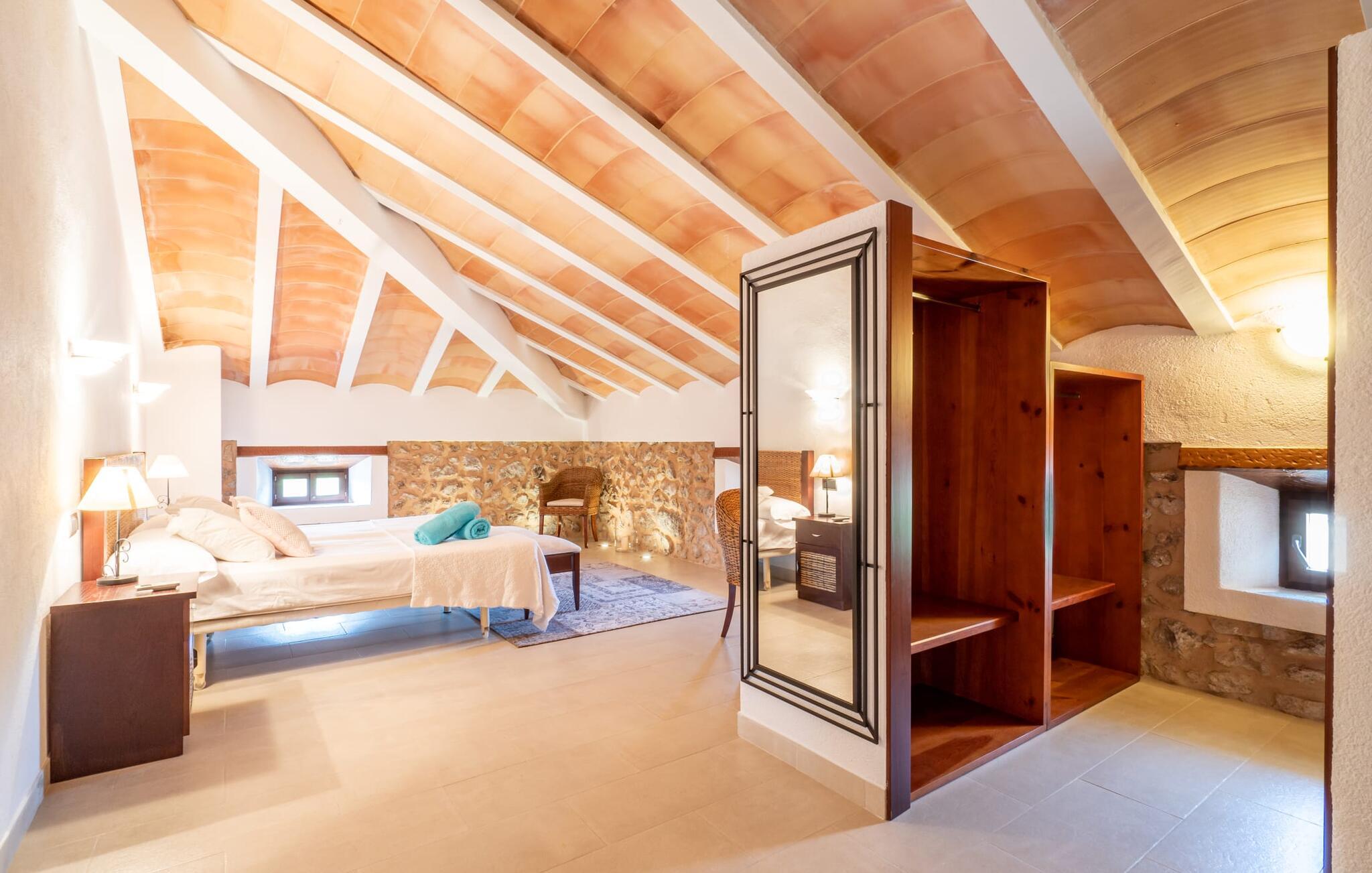 Zum Wohnen erwartet Sie ein wunderschön renoviertes Landhaus mit einer großzügig gestalteten Wohnfläche von 500 m². Das traditionelle Haus kann ganzjährig gemietet werden, was auch in den milden Herbst- und Wintermonaten preislich äußerst attraktiv ist. Das Haus verfügt nicht nur über zwei Kamine, sondern wird auch durch die Warm-Kalt-Klimaanlage jederzeit auf einer angenehmen Temperatur gehalten. Sie erleben modernsten Komfort und eine gelungene Raumaufteilung mit weitgehend offenem Grundriss. Verpackt ist dies in einer inspirierenden Mischung aus puristisch-klarem Landhausstil zwischen Tradition und Bohème. Sichtbare Bruchstein-, Terrakotta- und industriell anmutende Bodenbeläge, viel Holz und stilvoll zurückhaltende Dekoartikel verstärken die Wirkung. Das ist angenehm reduziert und verwöhnt auch Ästheten. Geschlafen wird auf insgesamt drei Ebenen. Drei Schlafzimmer befinden sich im Erdgeschoss, das vierte im Obergeschoss zusammen mit einem zweiten Lounge-Wohnzimmer; Zwei Dachgeschossstudios mit gemütlicher Hanglage bestätigen die hohe Qualität. Darüber hinaus verfügen alle sechs Schlafzimmer entweder über ein eigenes Badezimmer oder eine direkt zuordenbare begehbare Dusche oder Badewanne. Unser Fazit: „Son Caminals“ ist das Äquivalent der Perfektion in einem mallorquinischen Ferienhaus. Besser geht es nicht! Das prächtige Bauernhaus „Son Caminals“ ist ein renoviertes Anwesen, das auf den sanften Hügeln rund um Artà thront. Von dem hervorragend ausgestatteten Ferienhaus in angenehm ruhiger Lage erreichen Sie sehr schnell das mittelalterliche Dorf, das Einkaufsmöglichkeiten in der Fußgängerzone, auf dem beliebten Dienstagsmarkt sowie gute Restaurants und lokale Cafés bietet. In nur 12 Autominuten erreichen Sie die Bucht von Alcúdia, die 16 km Strände bietet, darunter Son Serra de Marina und Colònia de Sant Pere.