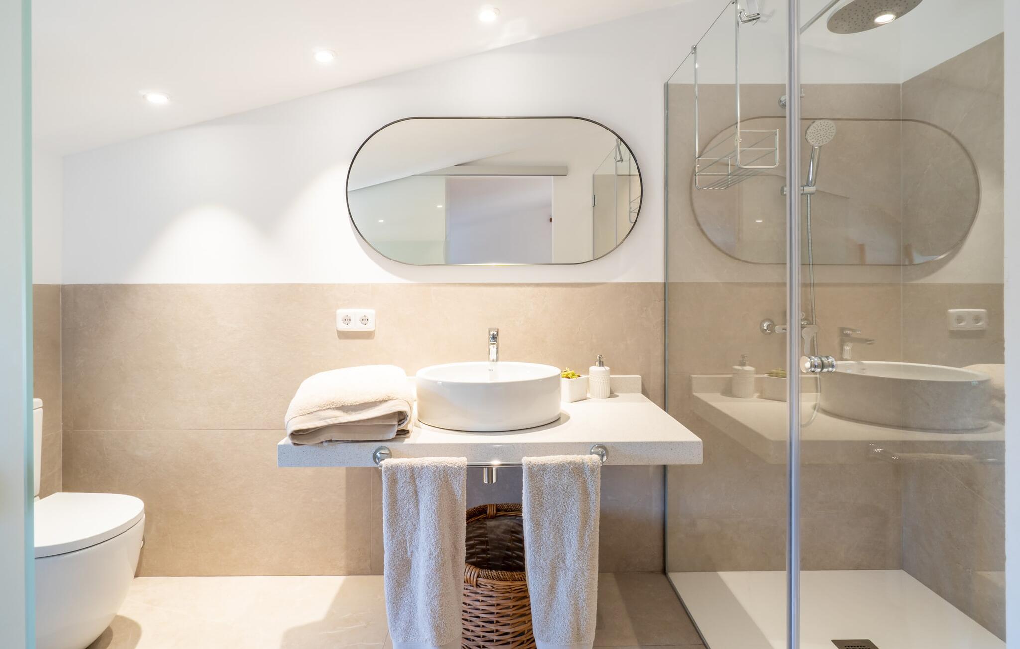Das Bauernhaus „Son Caminals“, in traumhafter ländlicher Lage, repräsentiert unser Portfolio bestmöglich. Neben dem restaurierten Ferienhaus trägt auch das riesige Gelände in ländlicher Idylle mit Eseln, Schafen und Hühnern zu einem Urlaubsgefühl der Extraklasse bei. Das Grundstück erstreckt sich über das Auge hinaus und bietet Ihnen den Vorteil einer völlig ungestörten Lage mit ländlichem Flair. Die Großzügigkeit spiegelt sich auch in der Aufteilung des Areals wider – es gibt einfach unglaublich viel Platz. Da stört es auch nicht, dass der Poolbereich nur wenige Meter vom Haupthaus entfernt liegt und über die majestätische Freitreppe erreichbar ist. Dort finden Sie ein hautfreundliches Schwimmbad mit Liegewiese und Sonnenterrasse. Daneben lockt ein überdachter Bereich, unter dem Sie einen herrlichen Blick auf unsere geliebten, das ganze Jahr über grünen Hügellandschaften genießen können. Da es auch eine gemütliche Außenküche mit Gasgrill gibt, können Sie den Aufenthalt in der Natur zu jeder Tageszeit genießen. Auch für Familienfeiern oder eine Gruppe von Freunden ist das Bauernhaus ein Traum. Die Auswahl an zahlreichen attraktiven Sitzbereichen – einen weiteren finden Sie auf Poolebene unter dem mit Bambus gedeckten Toldo – macht dieses inspirierende Ferienhaus noch attraktiver. Wenn Sie bis zur Ferienhausebene schweben, finden Sie weitere wunderschöne Aussichtspunkte – überdacht oder frei, aber immer mit Premium-Panorama. Die beiden nach Geschlechtern getrennten Außentoiletten runden das unbeschwerte Leben im Freien ab.