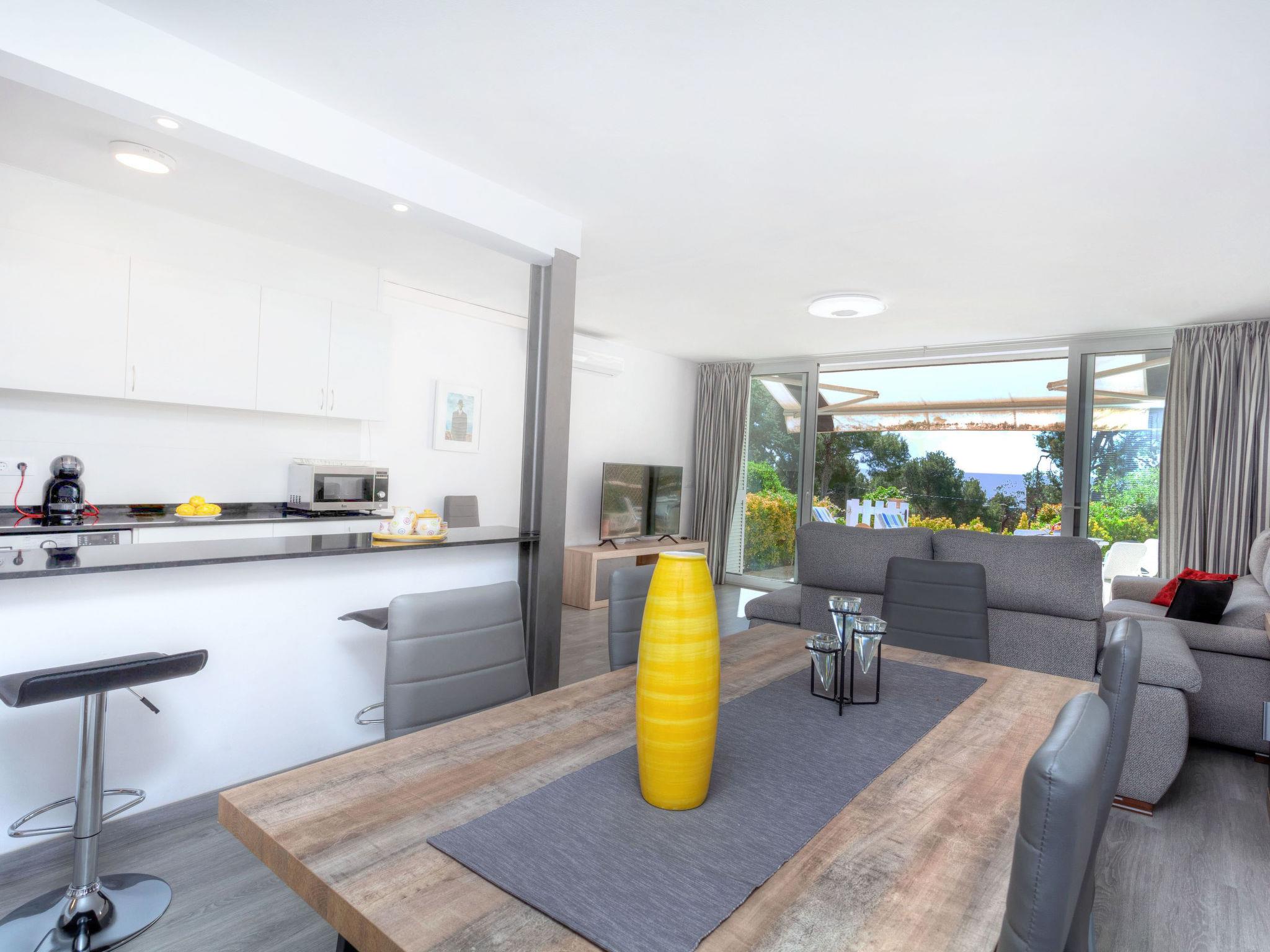 "Cap Roig", 3-room apartment 65 m2, on the ground floor. Spacious, renovated in 2019, practical furnishings: living/dining room with digital TV. Exit to the terrace. 1 room with 2 beds (90 cm, length 190 cm). 1 room with 1 french bed (150 cm, length 190 cm). Open kitchen (oven, dishwasher, 3 induction hot plates, toaster, kettle, microwave, electric coffee machine, Capsules for coffee machine (Dolce Gusto)). Shower/WC. Air-conditioning, forced-air heating. Large terrace. Terrace furniture. View of the sea. Facilities: washing machine, children's high chair, baby cot. Internet (WiFi, free). Please note: non-smoking house. TV only ES. HUTG-044786 // Reg. Nr.: ESFCTU00001701500024653200000000000000000HUTG-0447860