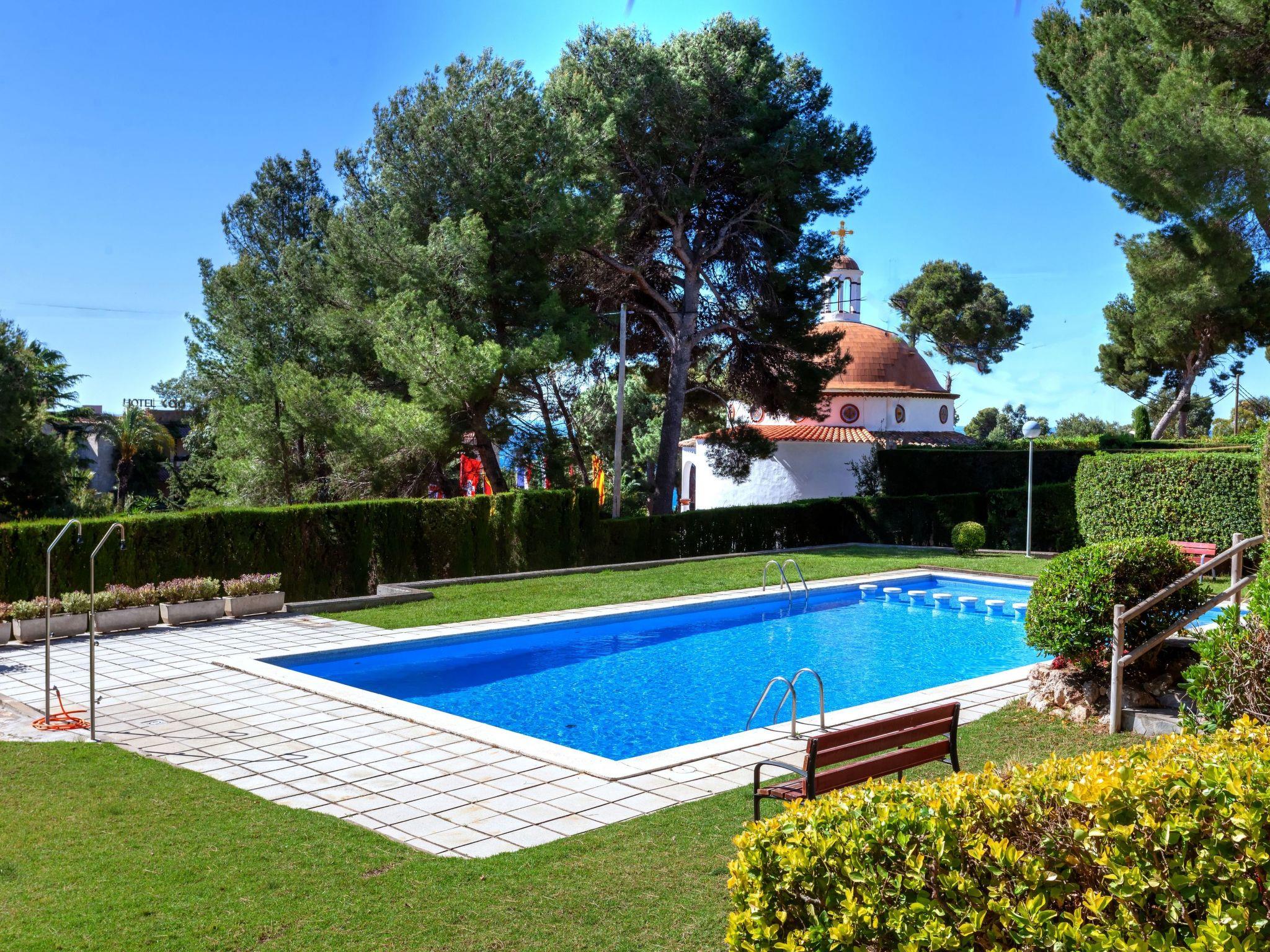 Comptat de Sant Jordi 2 km from Calonge: Apartment block "Byblos". In a quiet, sunny position, 120 m from the sea, 120 m from the beach, road to cross. For shared use: garden (fenced) with lawn, swimming pool angular (12 x 6 m, seasonal availability: 15.May. - 15.Oct.). Outdoor shower. Stepped path to the house. Public parking on the road. Shop 2 km, supermarket 2 km, bar 200 m, bus stop 300 m, sandy beach "Playa" 150 m. Sports harbour 7 km, golf course (18 hole) 5 km. Nearby attractions: Parque Acuatico Aquadiver 2 km. The owner does not accept any youth groups.