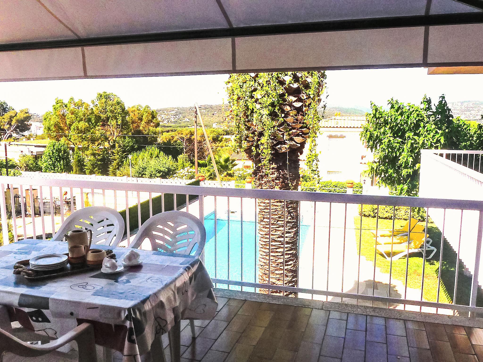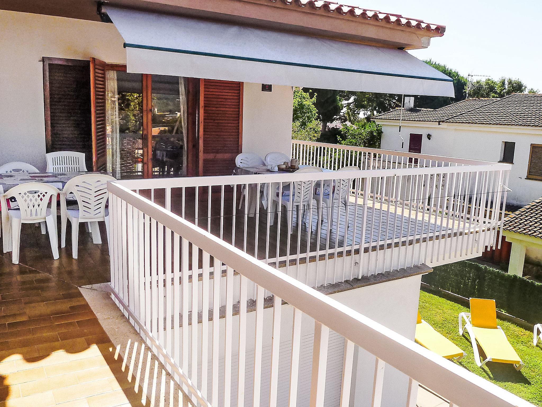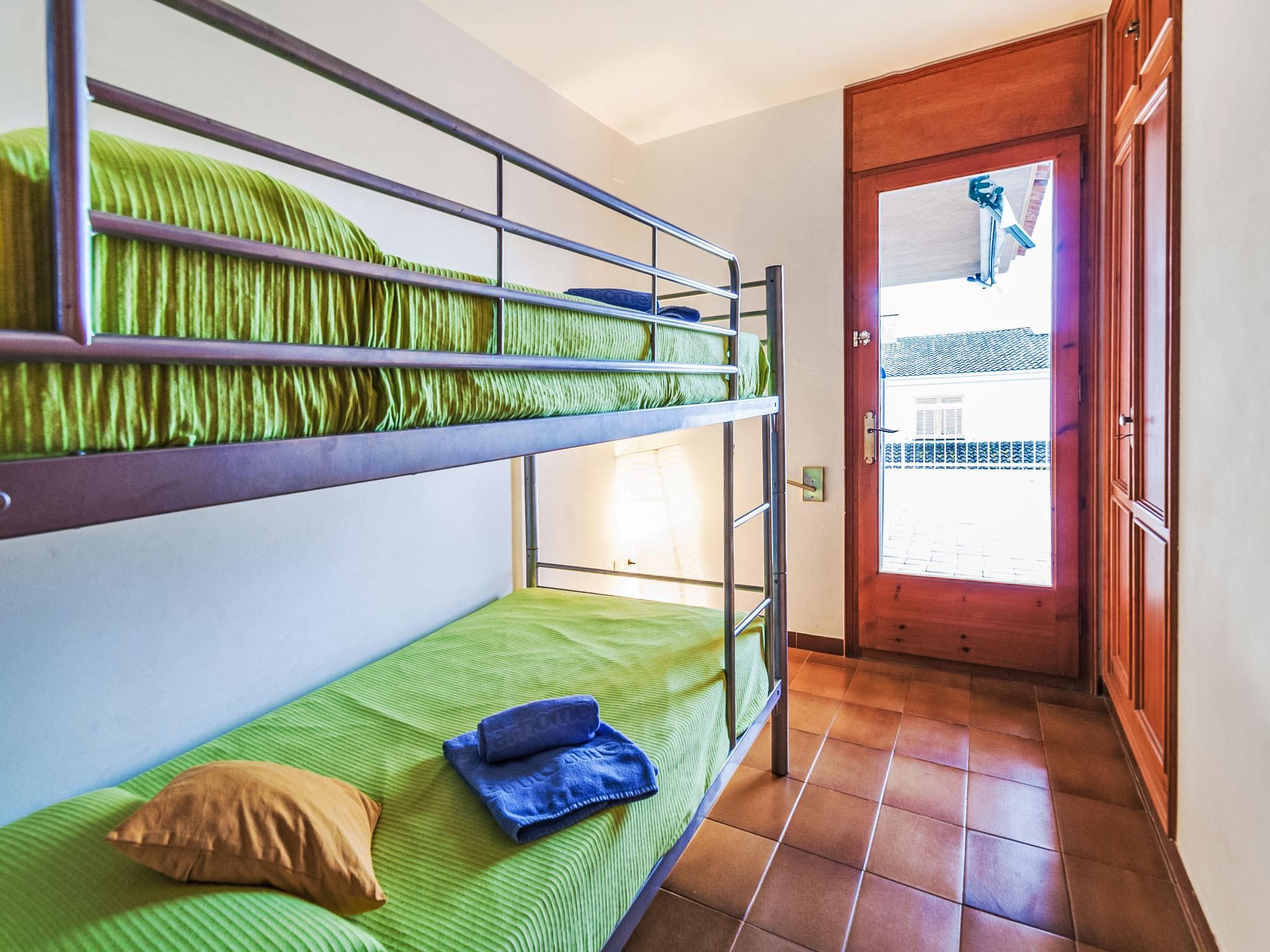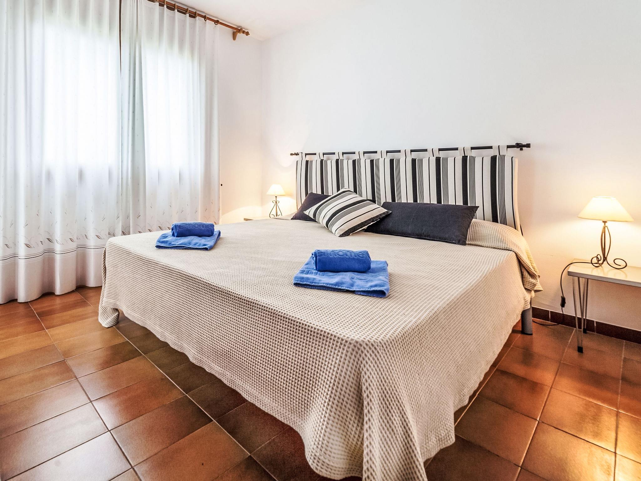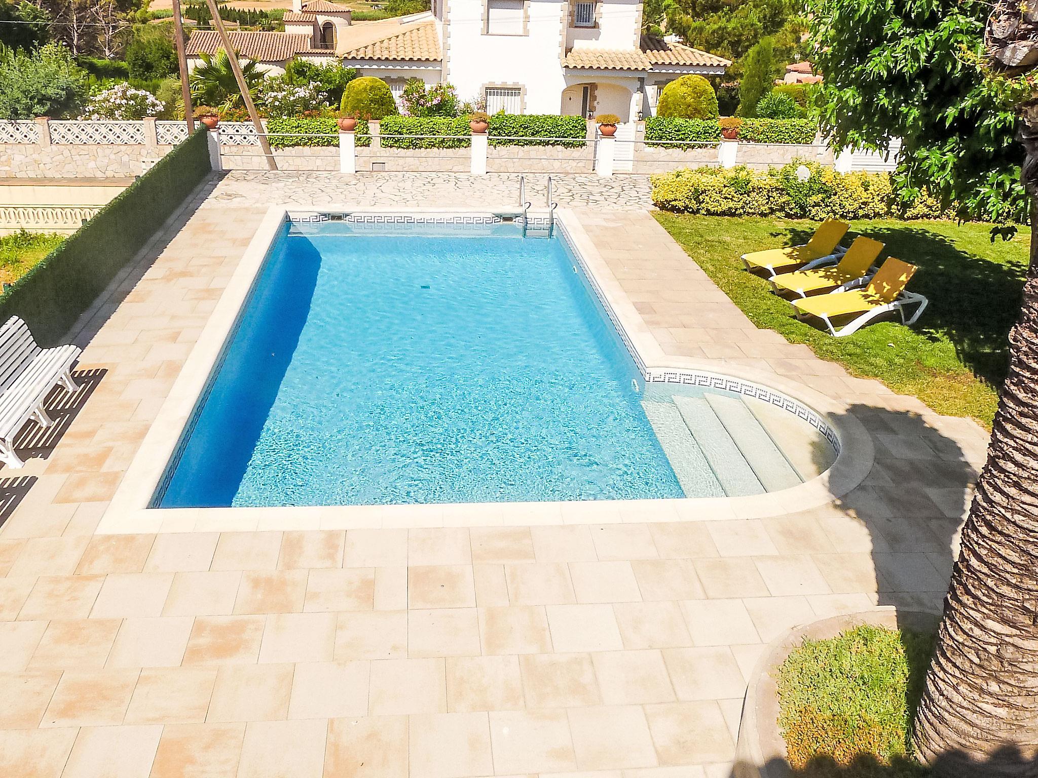 "Eva", 5-room house 130 m2, on the upper floor. Simple furnishings: living/dining room with digital TV, DVD and fan. Exit to the terrace. 1 room with 1 x 2 bunk beds (90 cm, length 190 cm). Exit to the terrace. 1 room with 2 beds (90 cm, length 190 cm). Exit to the terrace. 1 room with 1 french bed (150 cm, length 190 cm). Exit to the terrace. 1 room with 1 double bed (2 x 90 cm, length 190 cm), bath/bidet/WC and hand-basin. Exit to the terrace. Kitchen (3 hot plates, oven, dishwasher, toaster, kettle, microwave, electric coffee machine). Bath/shower/bidet/WC, double hand-basin. No heating option. Large terrace. Terrace furniture, deck chairs (8). View of the swimming pool. Facilities: washing machine, iron, children's high chair, baby cot, hair dryer. Internet (WiFi, free). Please note: non-smoking house. TV only ES. HUTG-010955 // Reg. Nr.: ESFCTU00001701500002385000000000000000000HUTG-0109559
