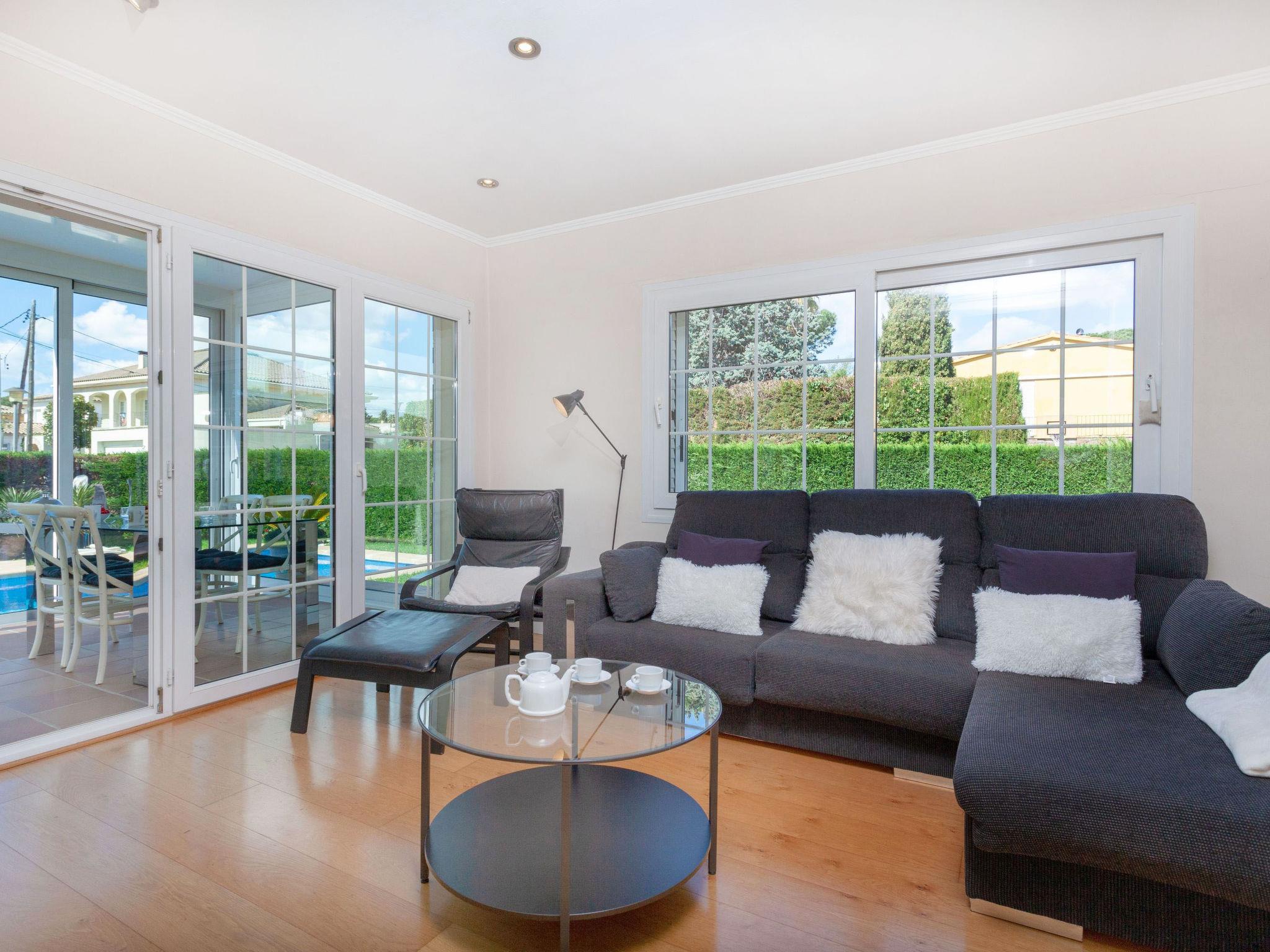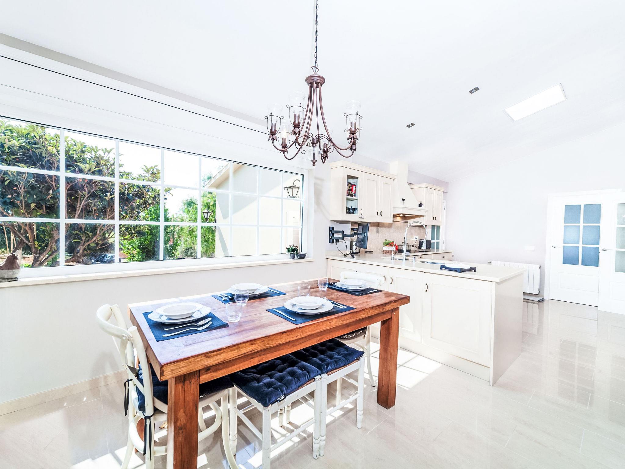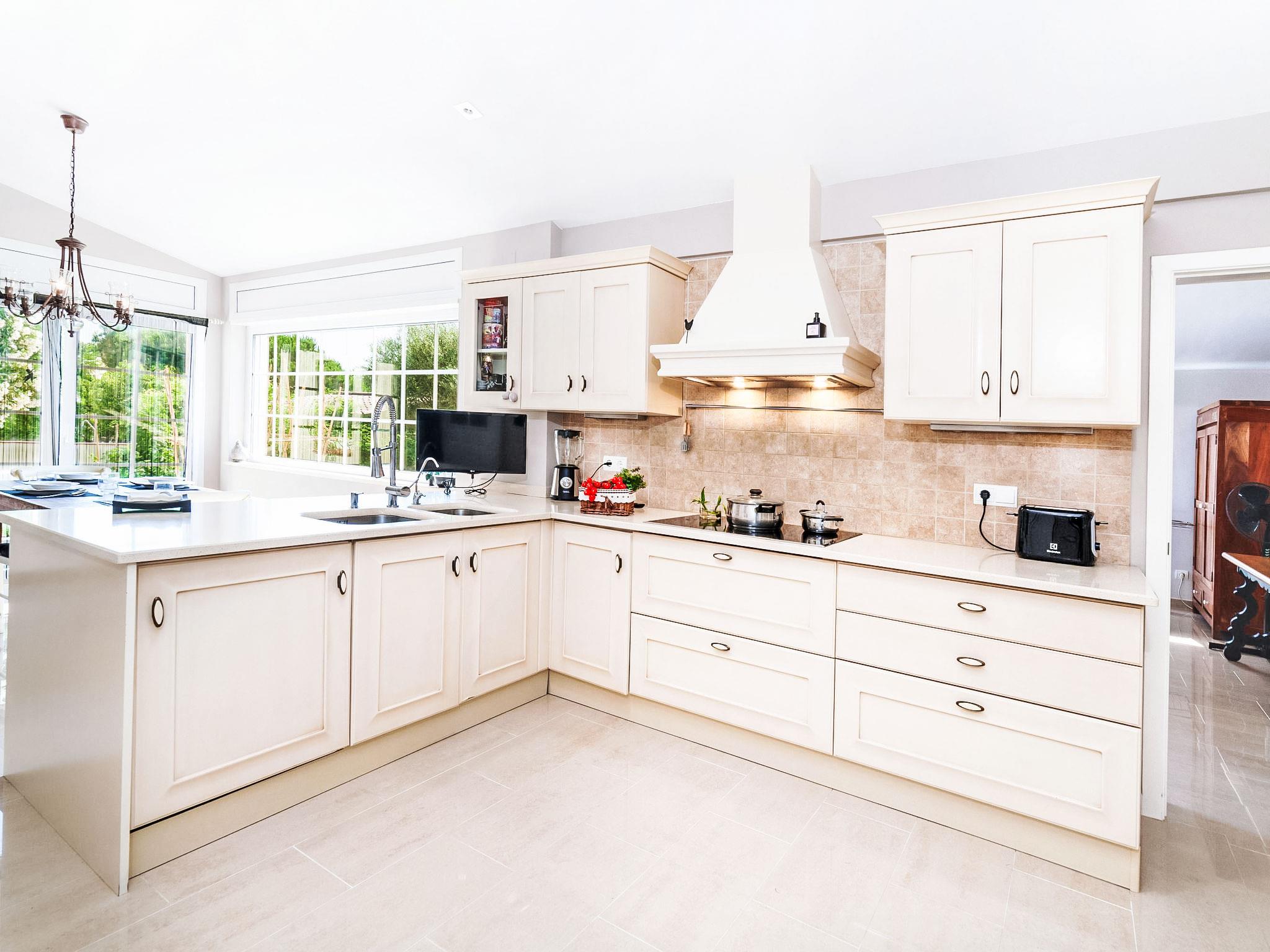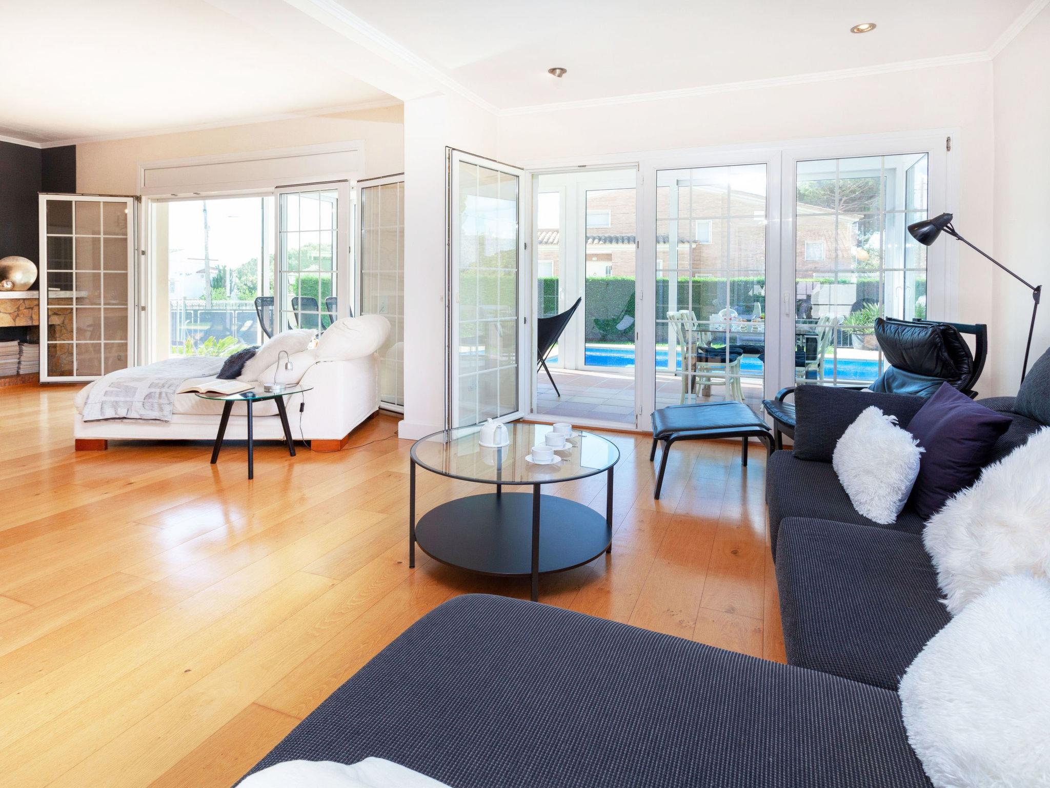 "Amsterdam", 5-room house 350 m2, lower ground floor. Spacious, comfortable and cosy furnishings: living/dining room with satellite TV (flat screen), fan. Exit to the patio, to the swimming pool. 1 room with 2 beds (90 cm, length 190 cm), fan. 3 rooms, each room with 1 french bed (135 cm, length 190 cm), fan. Kitchen (oven, dishwasher, 4 ceramic glass hob hotplates, toaster, kettle, microwave) with dining table. Exit to the patio. Bath/bidet/WC, shower/WC. No heating option. Large terrace, patio. Terrace furniture, barbecue, deck chairs, covered balcony. Facilities: washing machine, baby cot for up to 2 year olds, hair dryer. Internet (WiFi, free). Please note: suitable for families. Non-smoking house. HUTG-028711 // Reg. Nr.: ESFCTU00001701500019241900000000000000000HUTG-0287118