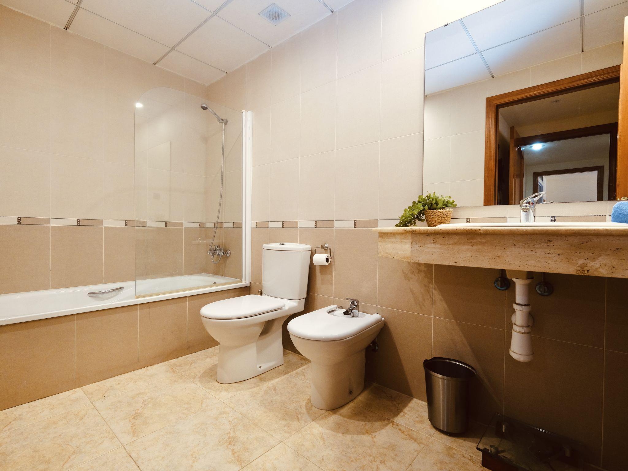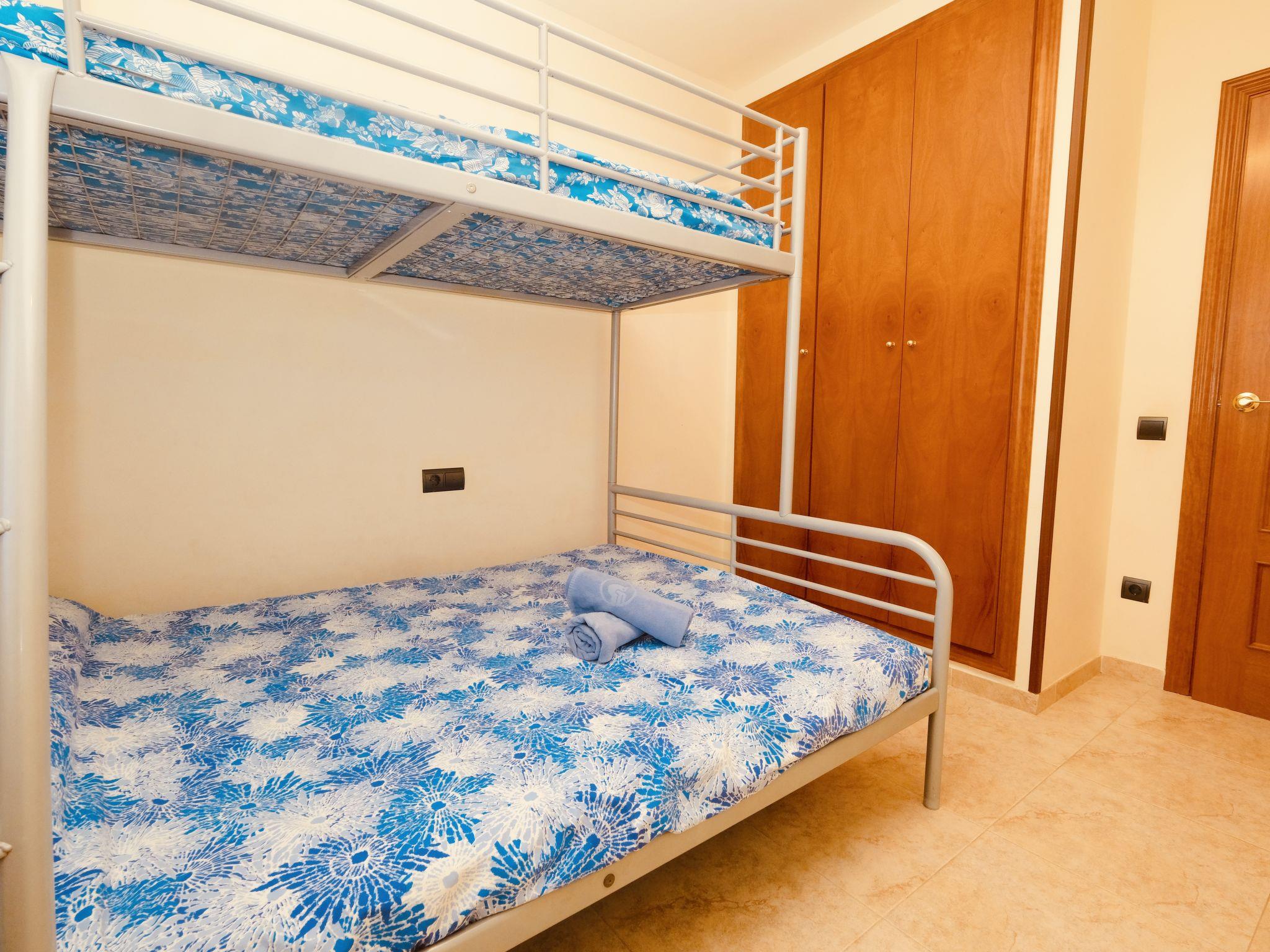 "Residencial Golden Beach", 3-room apartment 65 m2. Cosy furnishings: living/dining room with TV. Exit to the terrace. 1 room with 1 bed (135 cm, length 190 cm), bath/bidet/WC. Exit to the terrace. 1 room with 1 x 1 bunk beds (90 cm, length 190 cm). Kitchen-/living room (oven, 4 gas rings, toaster, kettle, microwave, freezer, electric coffee machine, Capsules for coffee machine (Dolce Gusto) extra). Exit to the terrace. Shower/WC. Heating not available in all rooms. View of the swimming pool. Facilities: washing machine, iron, hair dryer. Internet (WiFi, free). HUTTE076980 // Reg. Nr.: ESFCTU0000430100006027580000000000000000HUTTE-0769807