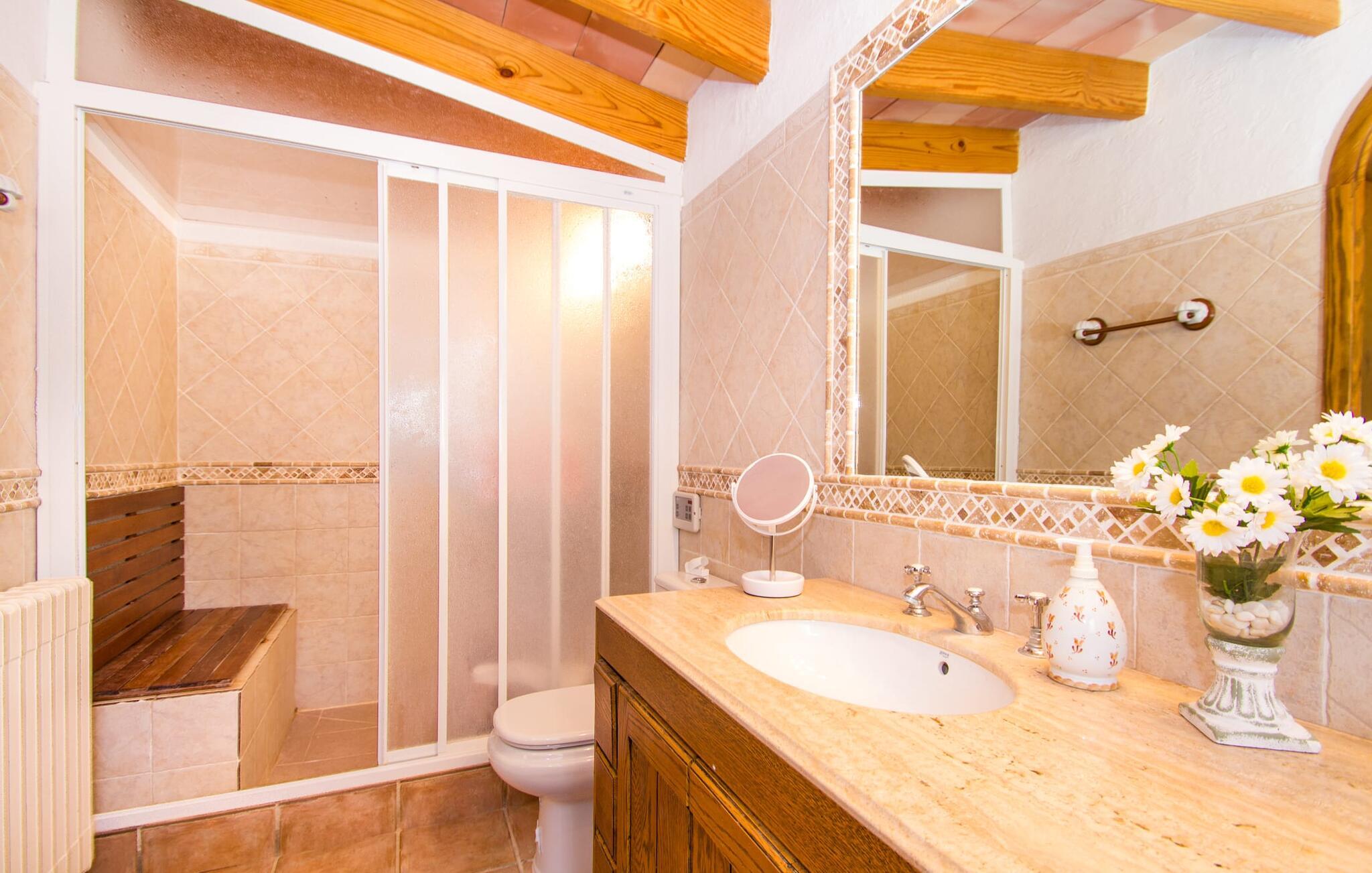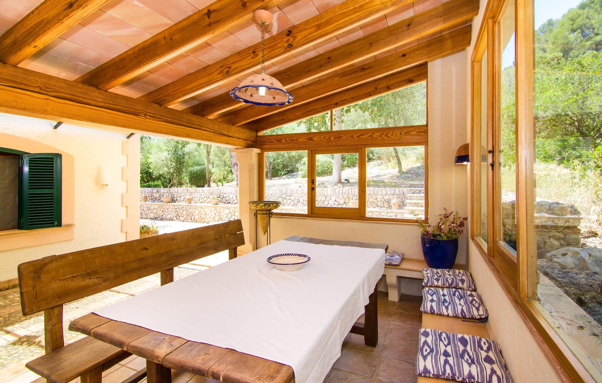 Im Inneren dieses sorgfältig restaurierten Refugiums verschmilzt der rustikale Charme nahtlos mit modernem Komfort. Im Erdgeschoss befinden sich ein gemütliches Wohnzimmer mit Kamin, eine separate Landhausküche mit Essecke, ein großzügiges Esszimmer mit Sofaecke und Zugang zur überdachten Terrasse, ein Doppelschlafzimmer mit Bad en Suite und ein Gäste-WC . Im Obergeschoss erwarten Sie drei weitere gemütliche Doppelzimmer. Eines davon verfügt über ein eigenes Bad und einen eigenen Balkon, während sich die anderen beiden ein separates Badezimmer teilen. Mallorquinische Fensterläden und Moskitonetze sorgen für erholsame Siestas und friedliche Nächte. Alle vier Schlafzimmer sind mit einer Klimaanlage ausgestattet, während Heizkörper das gesamte Ferienhaus wärmen.