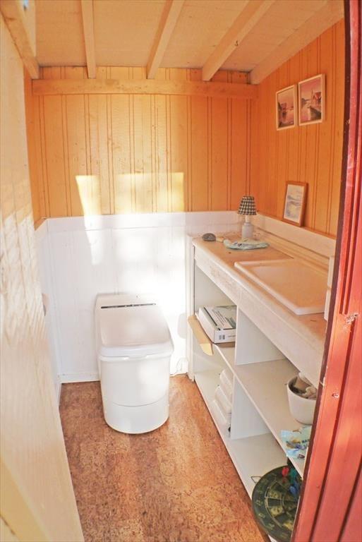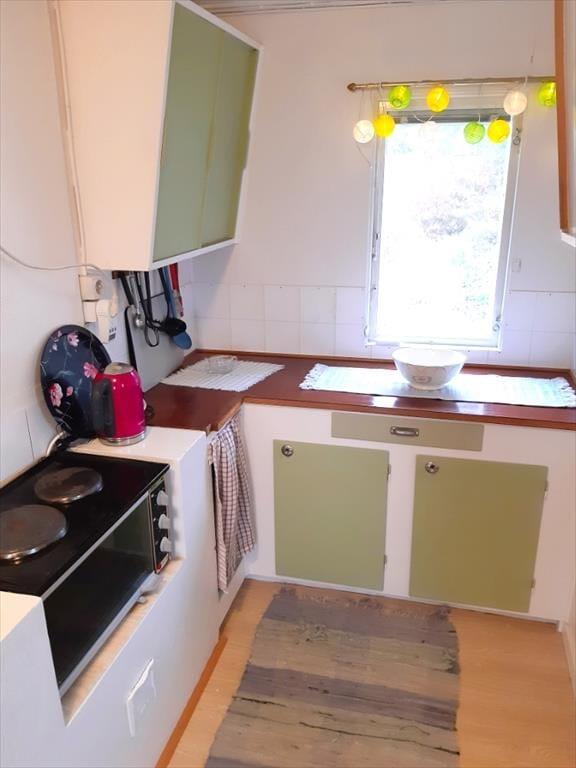 Køkkenet er åbent og udstyret med et 2-pladers elkomfur, ovn, køleskab med fryseboks samt mikrobølgeovn. Der er spiseplads i huset, og fra køkkenet er der direkte adgang til verandaen. I opholdsstuen er der brændeovn, sofahjørne og tv. Der er fibernet og adgang til Netflix. Det separate sovehus har to køjesenge og rummer op til fire sovepladser. Badeværelset i hovedhuset har bruser, håndvask og varmt vand. Toilettet – en miljøvenlig forbrændingstoilet af typen Cinderella – findes i et separat lille hus. Udendørs er der en stor veranda med havemøbler og grill til rådighed. Du har desuden adgang til både kajak og kano, så du kan udforske søen, når du har lyst. Parkeringspladsen ligger ca. 20 meter fra huset.
