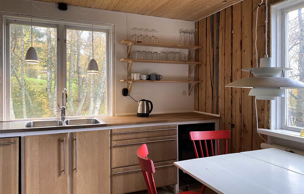 Betreten Sie den Innenbereich und erleben Sie eine klare, natürliche Gestaltung mit viel Holz und warmen Farbtönen. Der Wohnraum lädt mit einem bequemen Sofa und ruhiger Atmosphäre zum Entspannen ein. Nehmen Sie Platz, lesen Sie ein Buch oder lassen Sie den Blick durch die großen Fenster schweifen. Bereiten Sie Ihre Mahlzeiten in aller Ruhe zu und genießen Sie diese am kleinen Esstisch. An kühleren Tagen sorgt der Kaminofen für angenehme Wärme und unterstreicht den gemütlichen Charakter des Hauses.