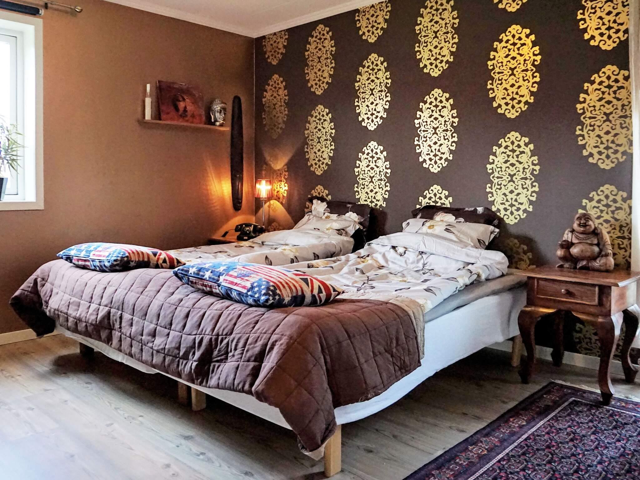 Das Haus hat drei geräumige Schlafzimmer, eines davon mit 180 cm breitem Doppelbett und zugehörigem Badezimmer mit Eckwanne (kein Whirlpool), Dusche, WC und Sauna für max. vier Personen. Das zweite Schlafzimmer ist mit einem 210 cm breitem Doppelbett ausgestattet, zudem steht hier ein ausziehbares Kinderbett bereit. Im dritten Schlafzimmer gibt es ein 160 cm breites Doppelbett. Zu den beiden letztgenannten Schlafzimmern gehört ein kleineres Badezimmer mit Dusche und WC. Im Flur befindet sich ein Schlafsofa, das durch Ausziehen des Bettes leicht in ein Doppelbett umgewandelt werden kann. Der Besitzer hat 2 zusätzliche Zeltbetten. Insgesamt gibt es 6 normale Betten und zwei weitere Betten in der Doppelschlafcouch und 2 Zustellbetten = 10 Schlafplätze.