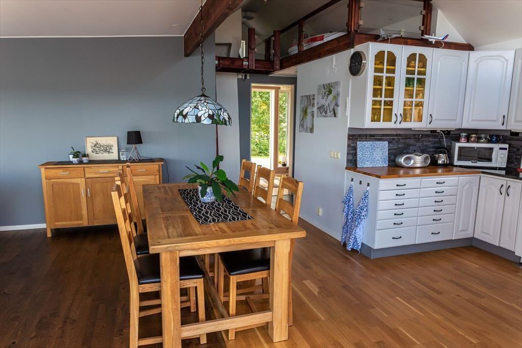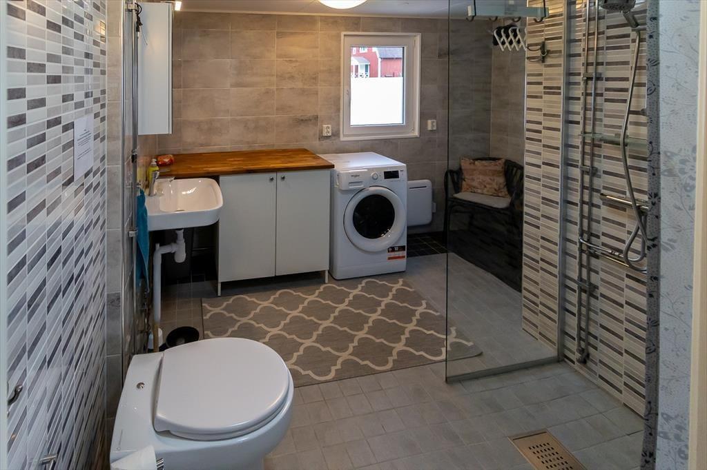 Hovedhuset byder på et dejligt åbent opholds-, spise- og køkkenområde. Køkkenet er fuldt udstyret med 4-plades keramisk kogeplade, opvaskemaskine og køle-/fryseskab. I stuen kan du slappe af på den store sofa samt bruge TV og WiFi. Badeværelset har bruser, toilet og vaskemaskine. Fra opholdsområdet er der adgang til vinterhaven med hjørnesofa. Derudover er der en stor træterrasse med siddepladser, borde og liggestole – perfekt til varme sommerdage. Ved egen badebro ligger et robåd med elmotor klar.