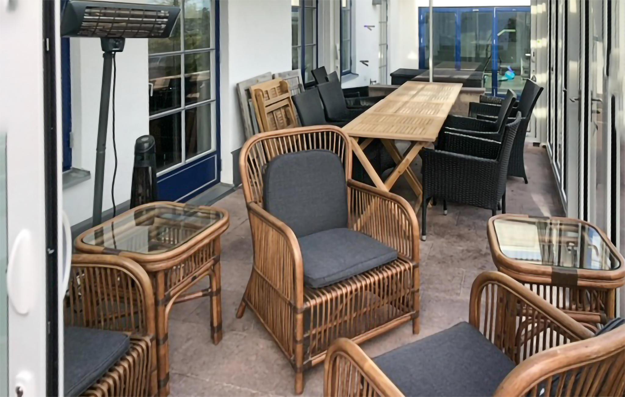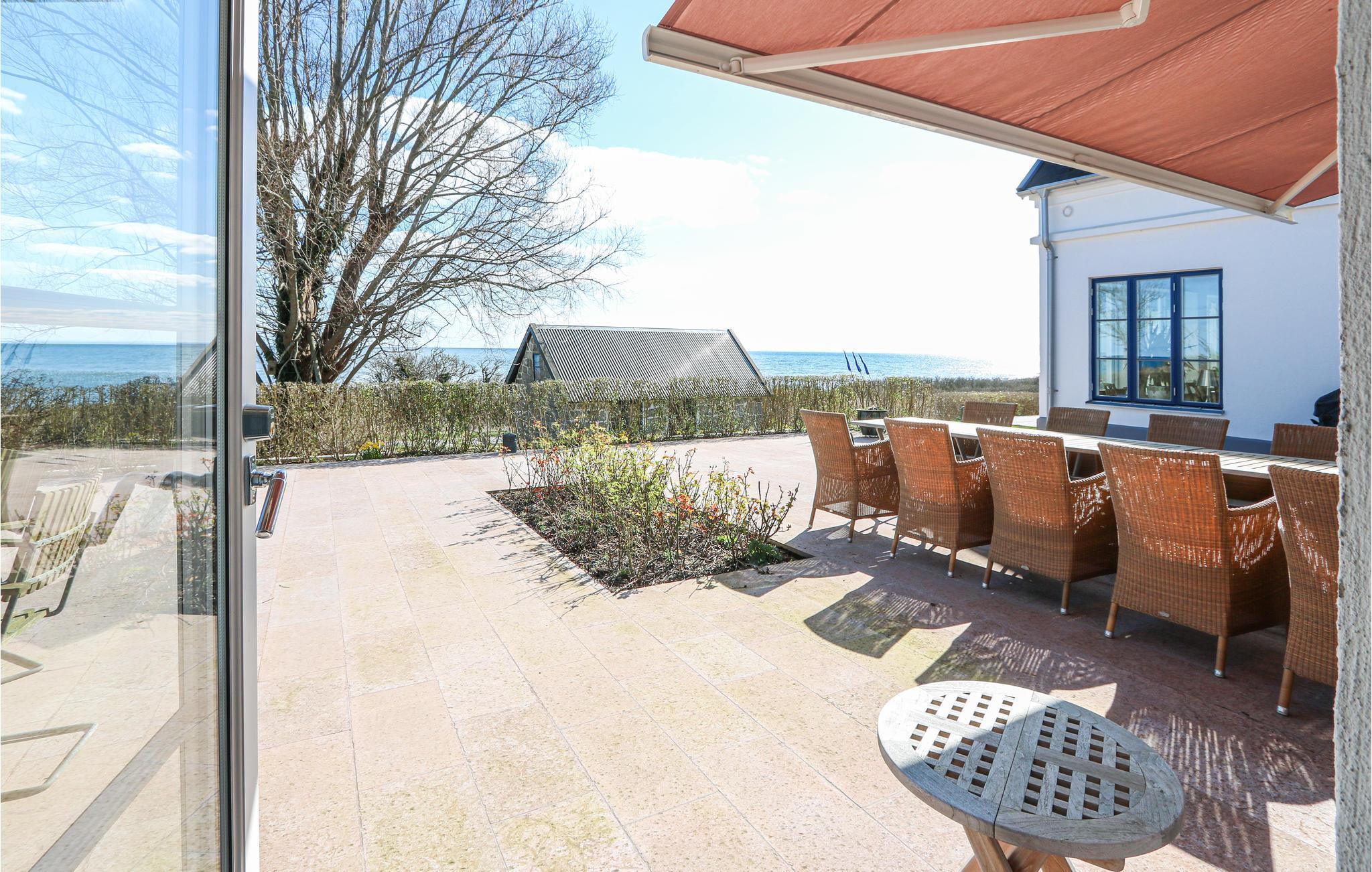 Das Ferienhaus verfügt über zwei moderne Küchen direkt nebeneinander, die für große Partys geeignet sind. Die große Terrasse mit Meerblick verfügt über komfortable Gartenmöbel. Hier können Sie sich hinsetzen und die Aussicht genießen. Bei klarem Wetter können Sie bis nach Bornholm sehen. Die gesamte Terrasse ist durch die beiden Flügel des Hauses geschützt und von hier aus können Sie die Türen zum Poolhaus und zur Sauna öffnen. Die Sauna befindet sich im zweiten Stock des Poolbereichs, von wo aus Sie die Aussicht beim Baden genießen können.