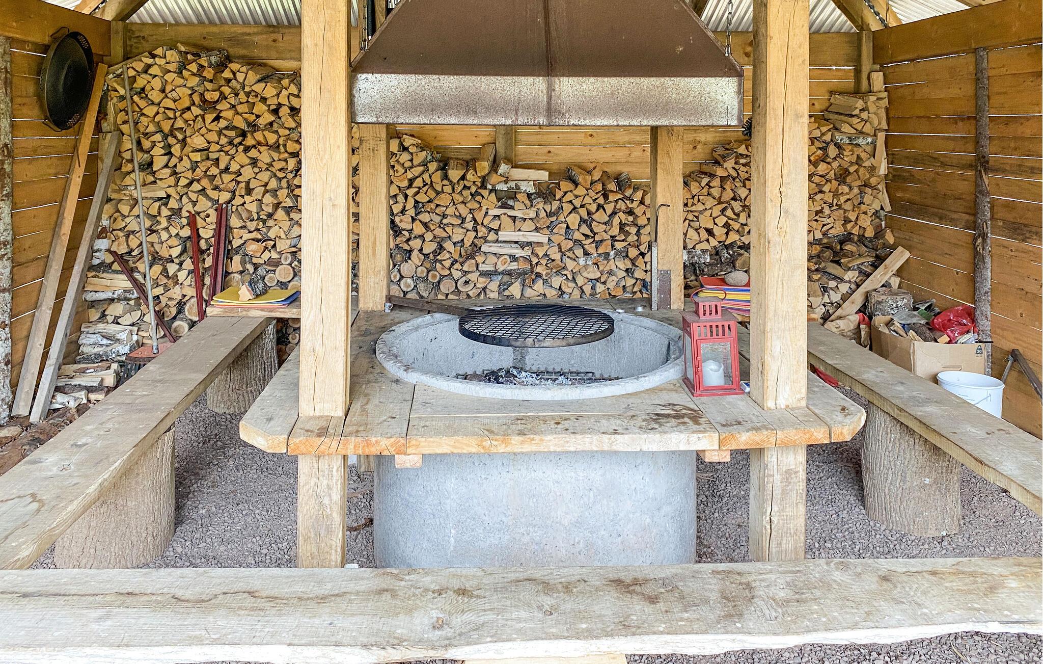 Genießen Sie sonnige Stunden auf der Holzterrasse mit Sitzgruppe und Sonnenschirm. Beginnen Sie den Tag mit einem Frühstück im Freien oder lassen Sie den Abend mit einem Grillabend ausklingen. Ein besonderes Highlight ist die überdachte Grillhütte auf dem Grundstück, ausgestattet mit rustikalem Tisch, umlaufenden Bänken und zentralem Feuerplatz, ideal für gesellige Stunden bei jedem Wetter. Der große Garten bietet viel Platz für Kinder und Erholung in der Natur.