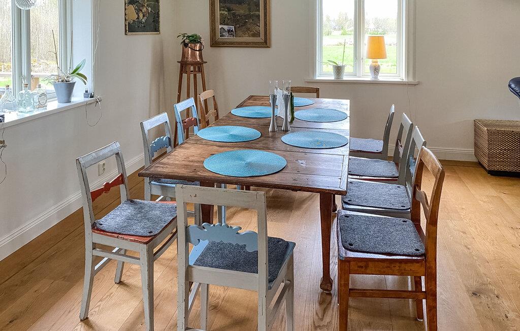 Die ruhige Lage, das große Naturgrundstück und die gemütliche Einrichtung Ihres Ferienhauses bieten gute Voraussetzungen für einen abwechslungsreichen Familienurlaub. Freuen Sie sich auf den großzügigen Wohnbereich mit bequemen Sofas, Holzboden und Kamin. Die angrenzende Küche ist freundlich eingerichtet und bietet viel Arbeitsfläche, eine moderne Ausstattung sowie eine kleine Sitzecke für den Kaffee zwischendurch. Versammeln Sie sich zum Essen am rustikalen Esstisch.