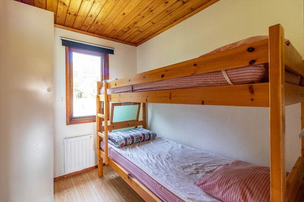 Die Wohnfläche von 43 m² ist für bis zu vier Personen ausgelegt und verteilt sich auf zwei Schlafzimmer: eines mit zwei Einzelbetten und eines mit einem Etagenbett. Über die überdachte Terrasse kommst du in den offenen Wohn-, Ess- und Küchenbereich. Die Sitzecke umfasst ein Sofa, einen Sessel und einen Fernseher mit schwedischen Sendern; WLAN ist ebenfalls vorhanden.