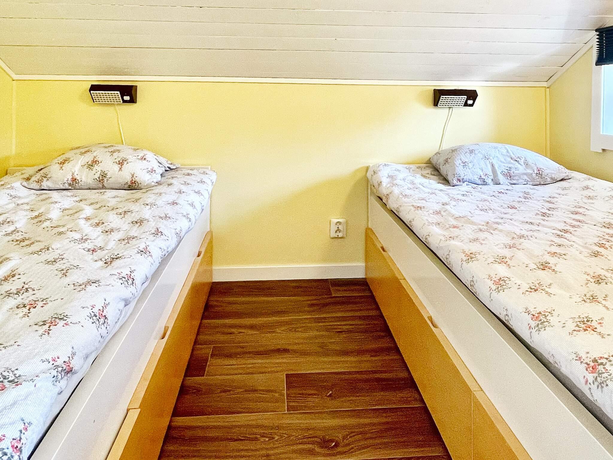 Es gibt drei Schlafzimmer; eines im Erdgeschoss mit einem Doppelbett und zwei im Obergeschoss mit jeweils einem bzw. zwei Einzelbetten. Im komplett gefliesten Badezimmer im Erdgeschoss gibt es ein Doppelwaschbecken, WC und Dusche.