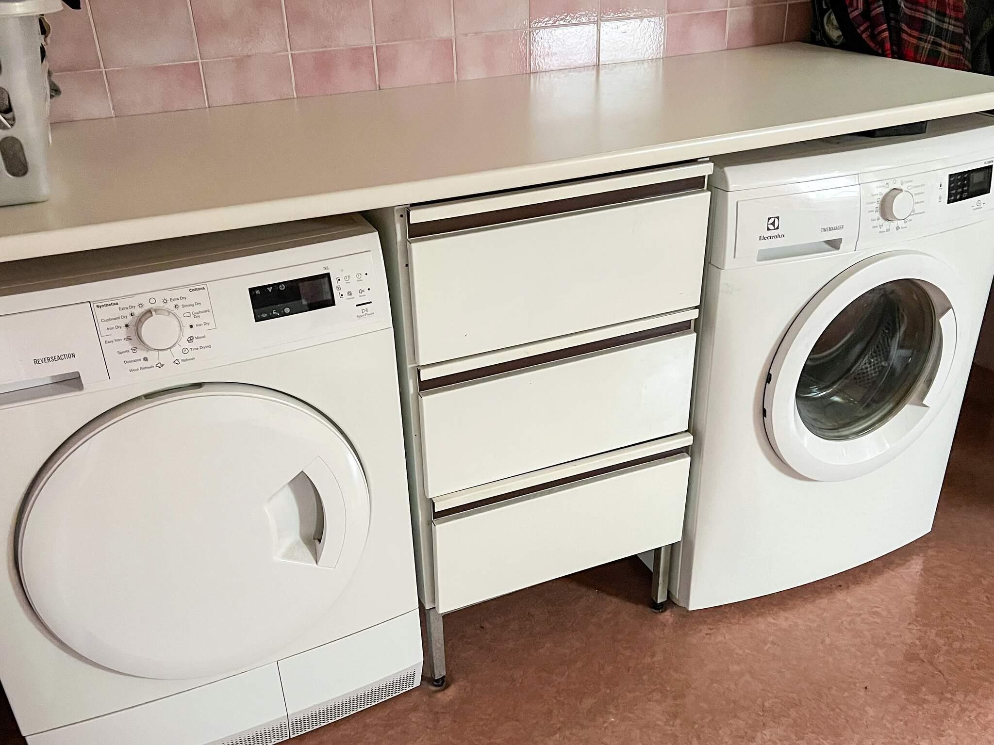 Bad: Waschm, Trockner, WC, Waschb., Wanne, Dusche, Fußbodenheiz.