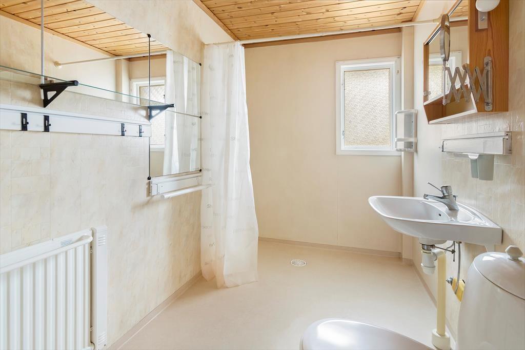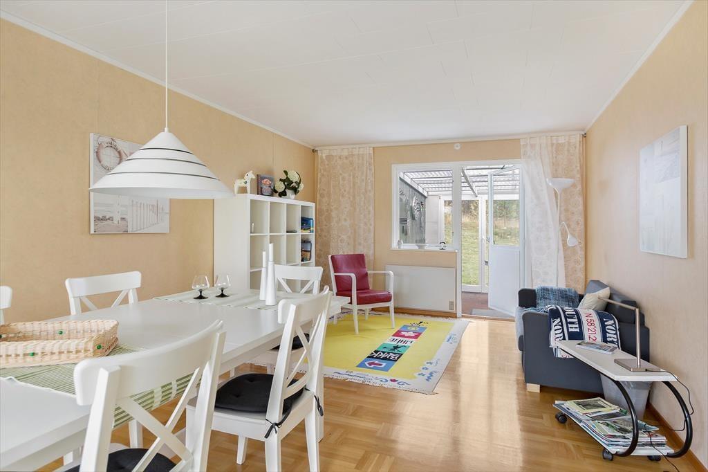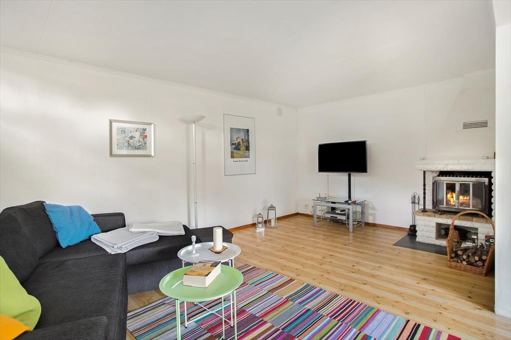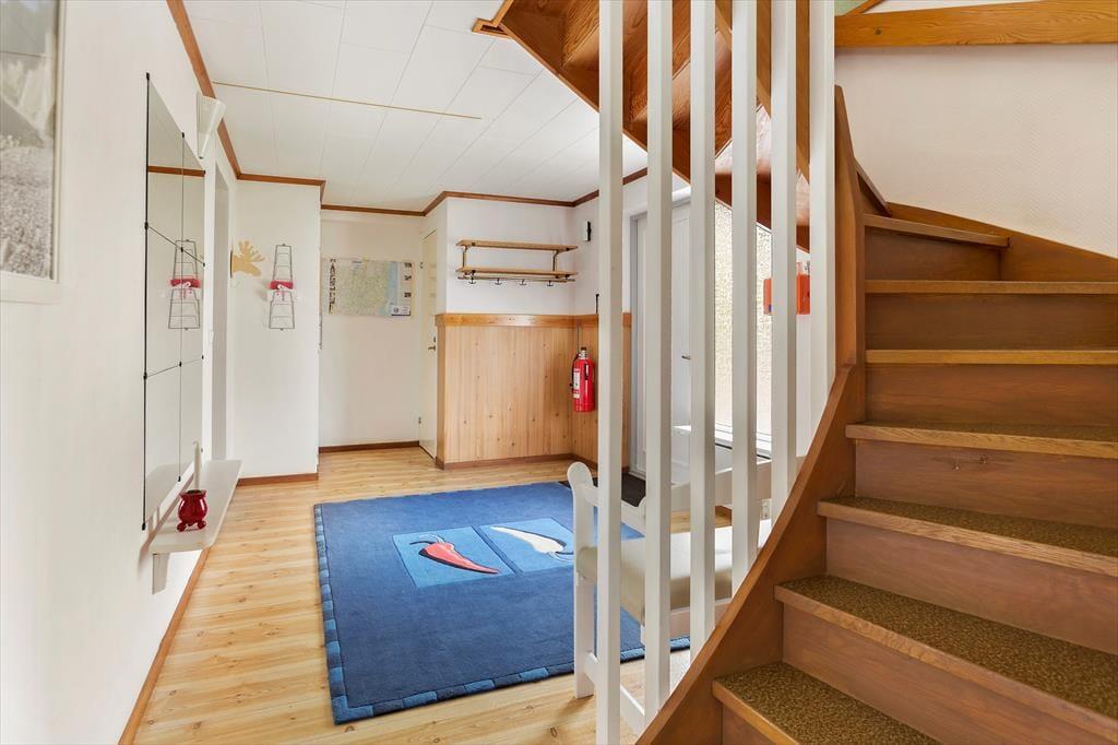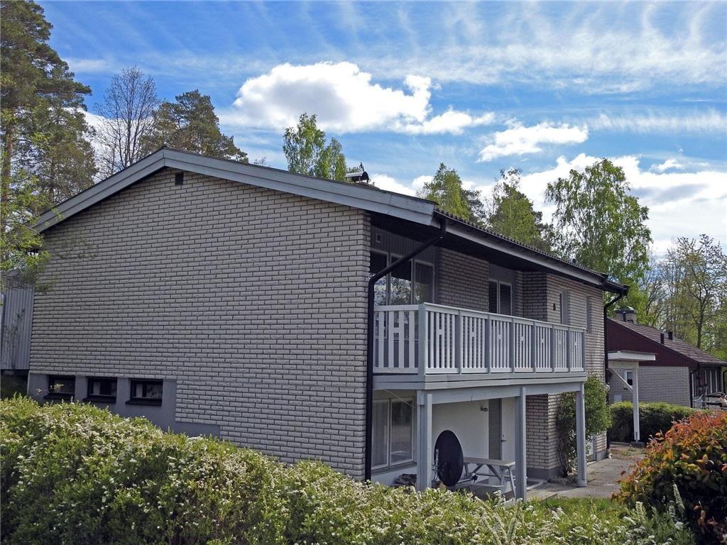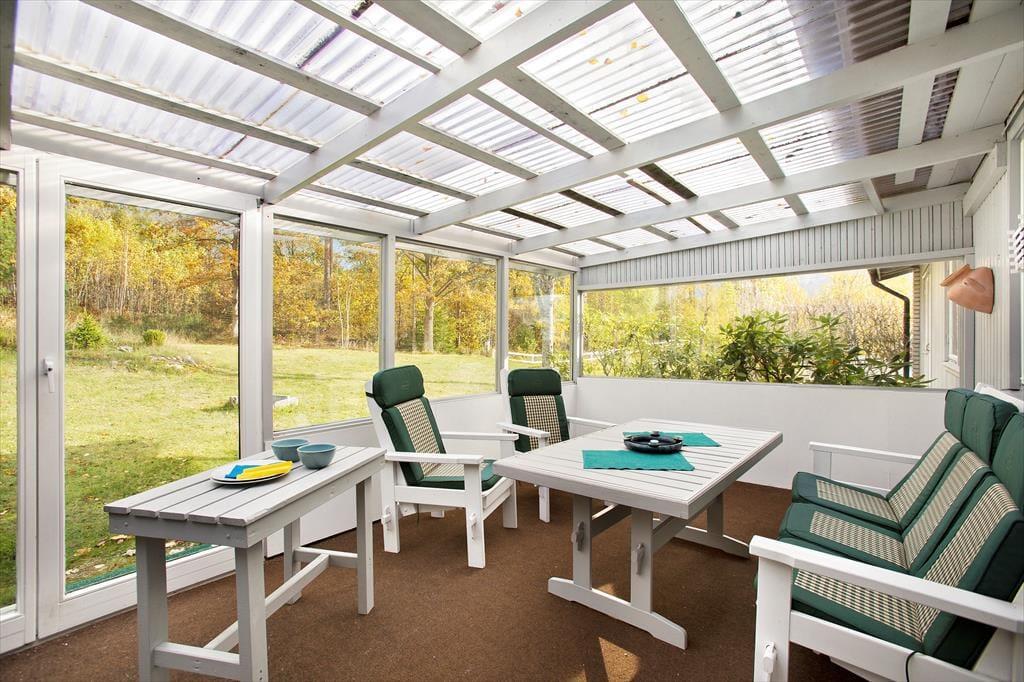 Ein modernes, geräumiges Ferienhaus für bis zu sechs Personen mit sehr guter Ausstattung. Das am Hang liegende, zweigeschossige Ferienhaus hat eine Wohnfläche von etwa 140 m². Der Hauseingang befindet sich ebenerdig auf der Straßenseite. Im Erdgeschoss des Hauses findet man ein geräumiges Wohnzimmer, ausgestattet mit gemütlichen Sitzmöbeln, Kaminofen und Sat-TV (deutsche Programme) sowie, im ehemaligen Hauswirtschaftsraum, eine Sauna mit Dusche und Waschmaschine und eine separate Toilette. Drei Schlafzimmer, zwei davon mit Doppelbetten, eines mit einem Etagenbett ausgestattet, sowie die Küche, ein Esszimmer und ein Duschbad mit WC befinden sich im Obergeschoss, an das sich zur Straßenseite ein von der Küche und vom Flur aus begehbarer Balkon anschließt und man auf der Hausrückseite über den mit gepolsterten Gartenmöbeln ausgestatteten Wintergarten in den höher gelegenen hinteren Teil des Grundstücks gelangt, wo sich auf der Rasenfläche eine Wäschespinne befindet. In der modernen Küche gibt es einen Elektroherd mit Backofen sowie eine Kühl- Gefrierkombination und eine Kaffeemaschine. Das Haus hat ganzjährig kommunale Wasser- und Abwasserversorgung und kann elektrisch beheizt werden. In der über den Saunaraum erreichbaren ehemaligen Garage befinden sich Gartengeräte sowie drei Fahrräder. Den Gästen des Hauses stehen weiterhin zwei Sonnenliegen, ein Kugelgrill sowie ein Ruderboot zur Verfügung, das, wenn das Haus nicht bewohnt ist, im Carport aufbewahrt wird.